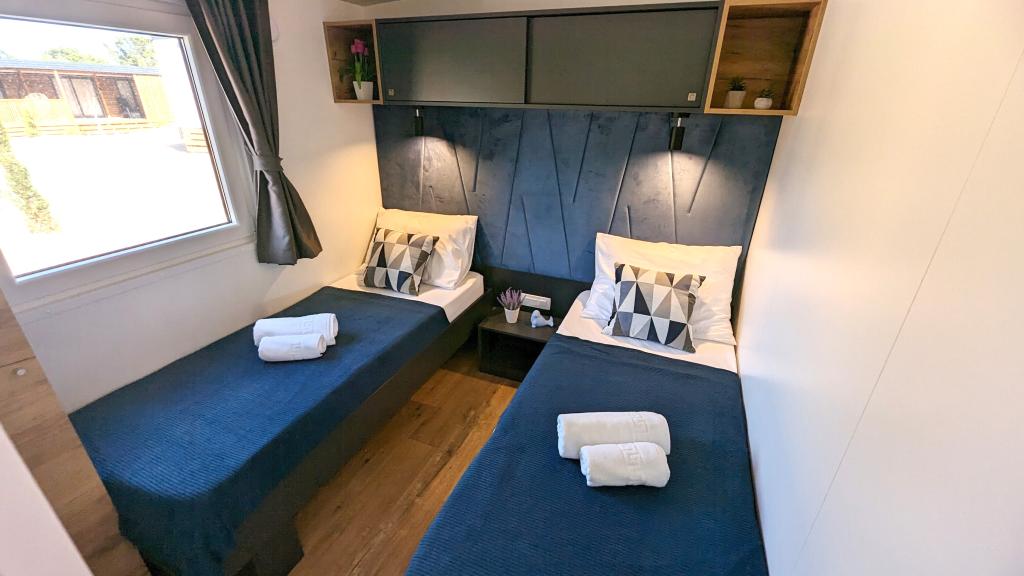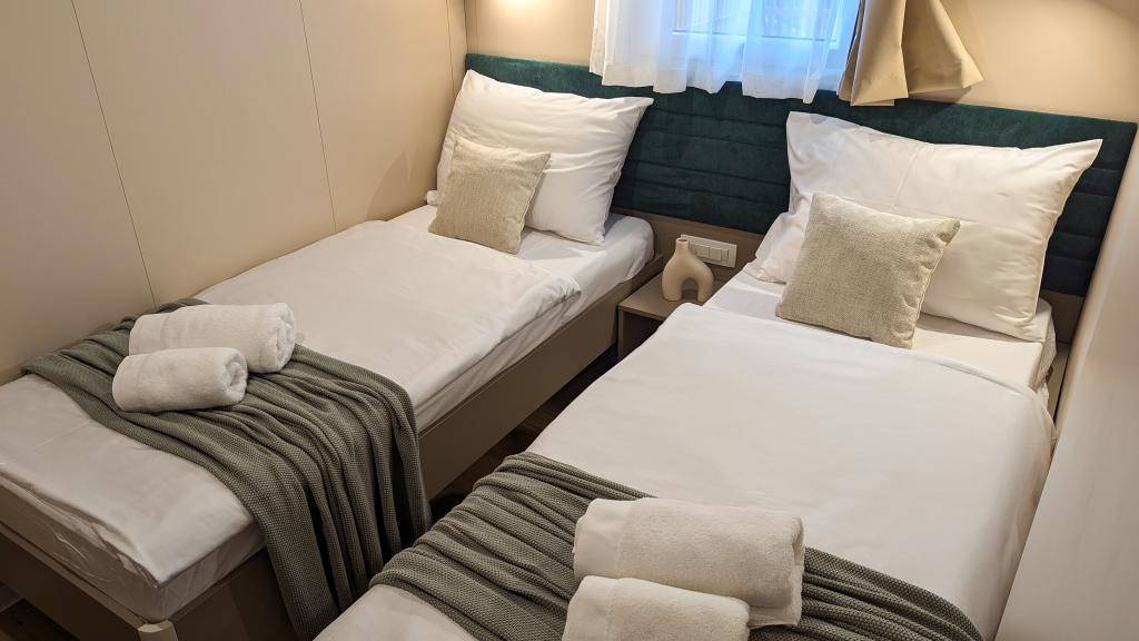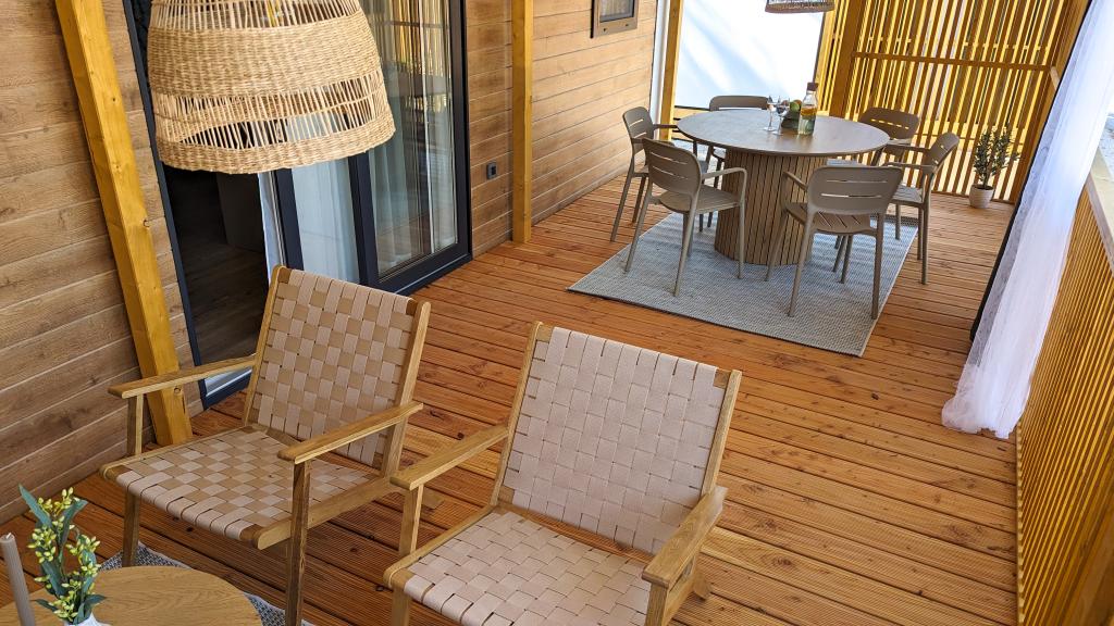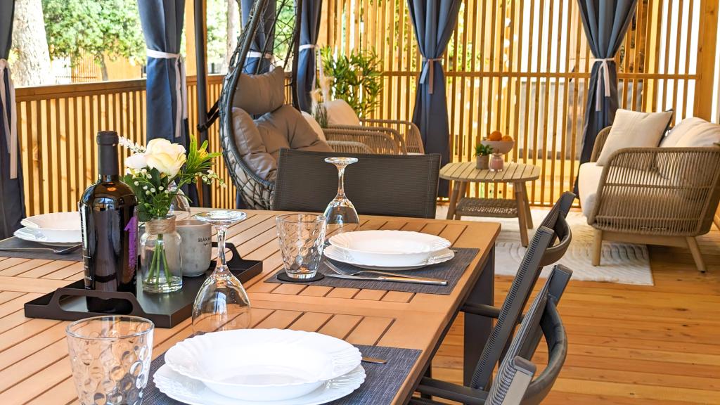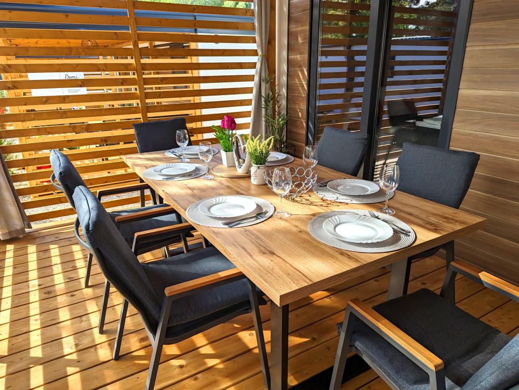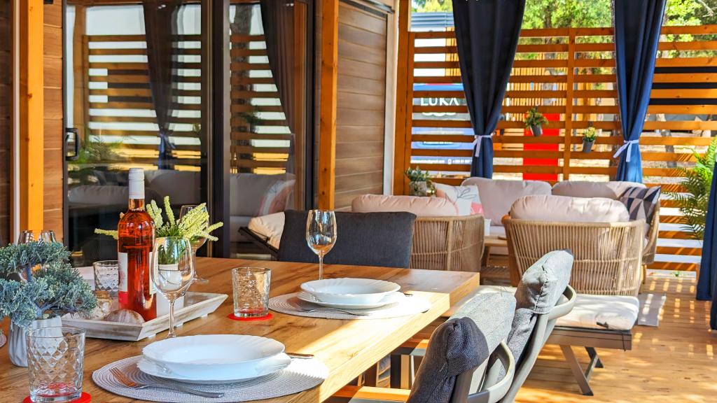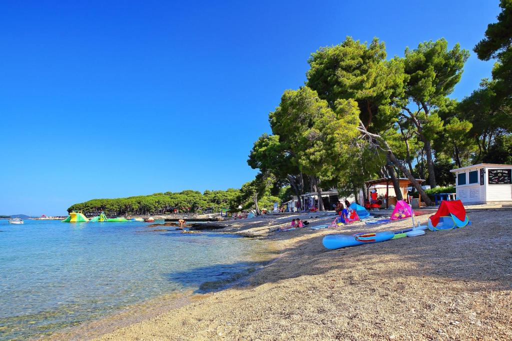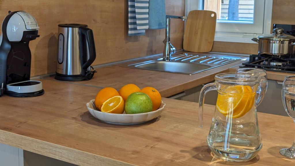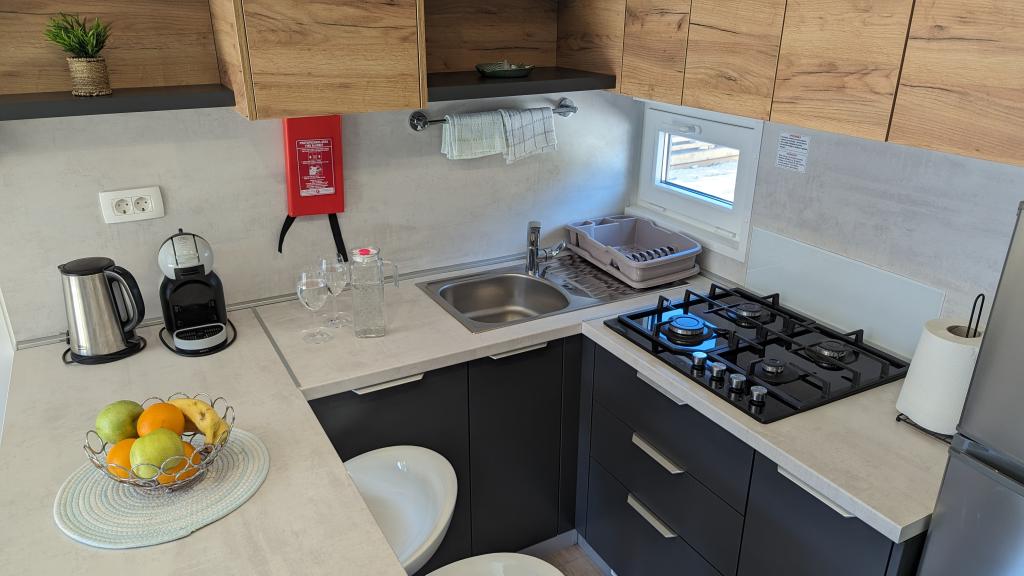 Uživajte u prirodi i udobnosti: Mobilne kućice Jaki u kampu Soline, Biograd na Moru. Smještene u mirnom dijelu kampa s 4 zvjezdice, okružene borovom šumom, naše moderno opremljene mobilne kućice idealne su za do 6 osoba. Uživajte u blizini plaže (2-5 minuta hoda), trgovina i restorana, te šetnici koja vodi do centra grada (15 minuta). Ove kućice nude 2 spavaće sobe i 2 kupaonice, dnevni boravak, veliku terasu s blagovaonskim stolom i lounge prostorom te potpuno opremljenu kuhinju - perilica suđa, mikrovalna pećnica, aparat za kavu, toster, blender, vanjski roštilj. Kućica također uključuje besplatan WiFi, besplatno parkirno mjesto odmah pored kuće, Smart TV, klima uređaj, ručnike i posteljinu. Kamp nudi mnoge sadržaje za cijelu obitelj: prekrasne pješčane i šljunčane plaže koje se protežu sve do centra grada, restoran s mediteranskim specijalitetima, dječje igralište, sportske aktivnosti i najam bicikla. Najveći hrvatski tematski vodeni park Dalmaland udaljen je 15 minuta vožnje autom.