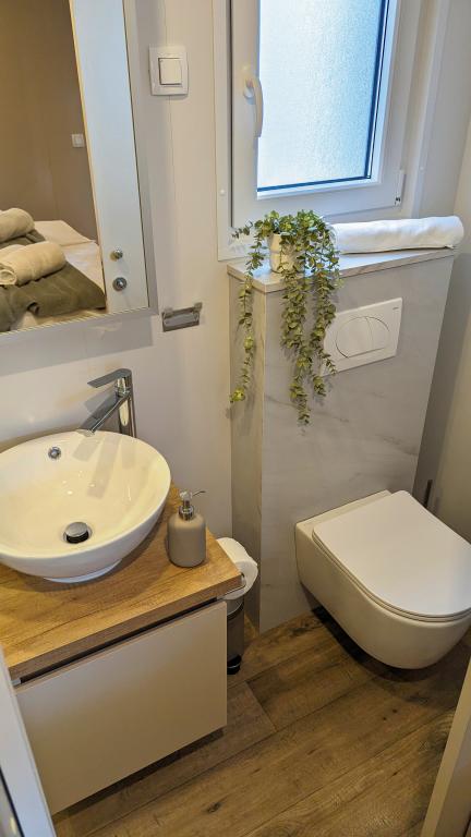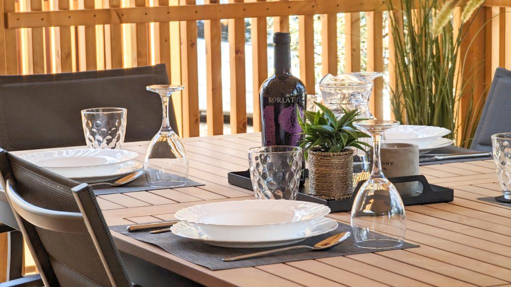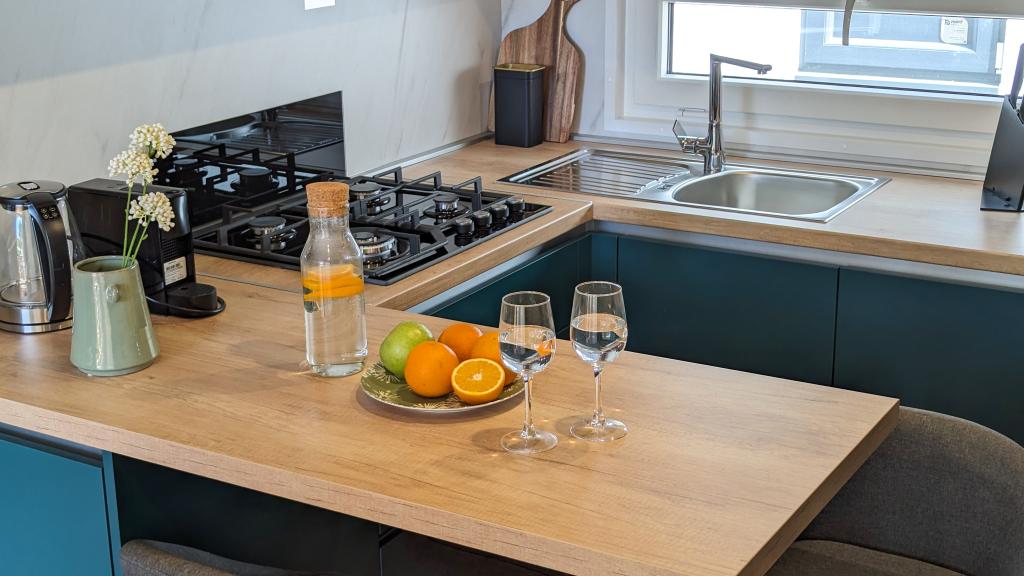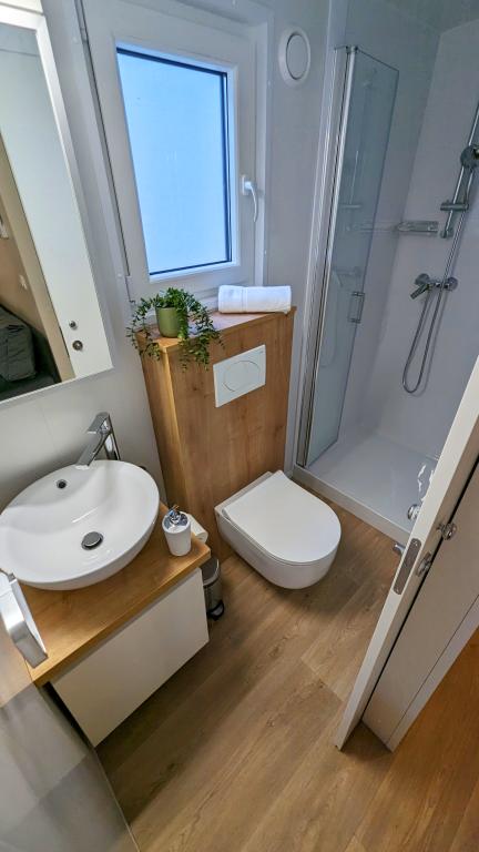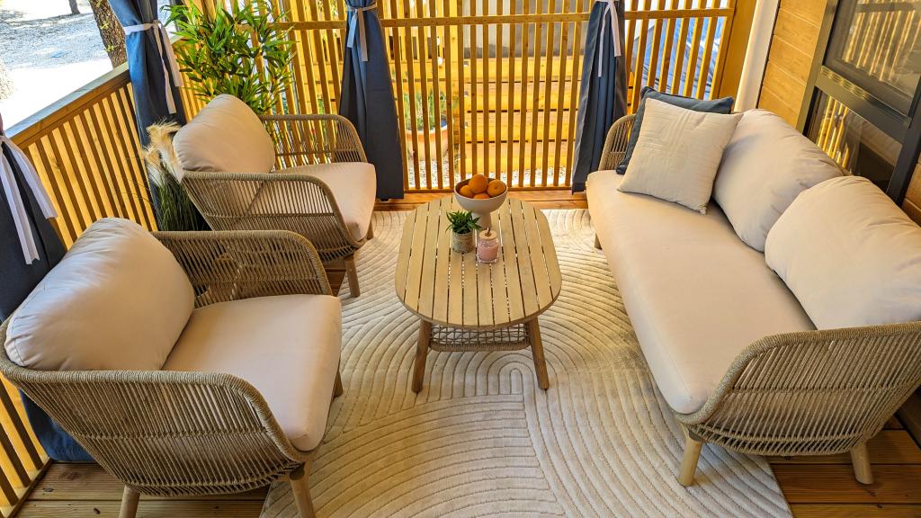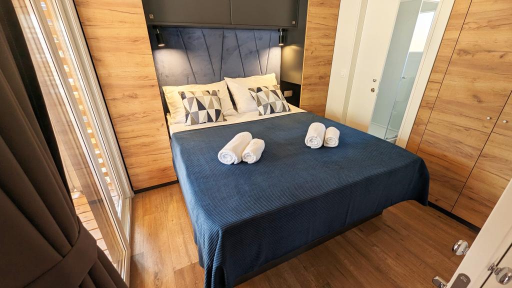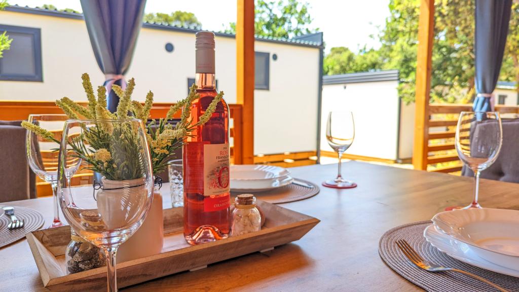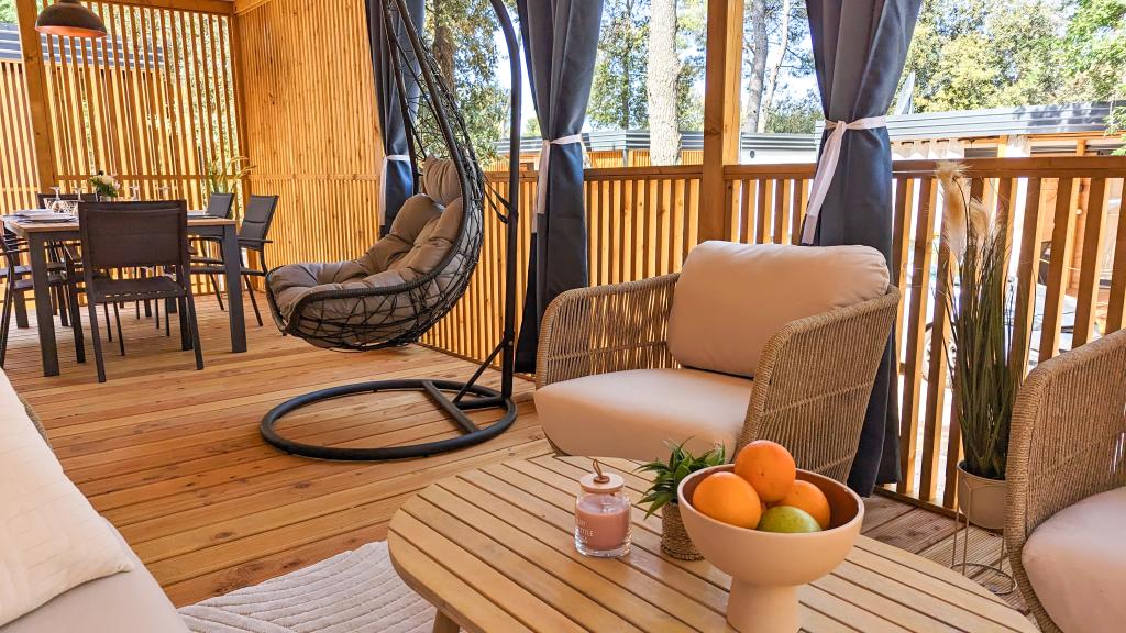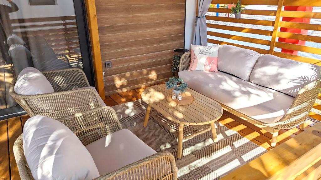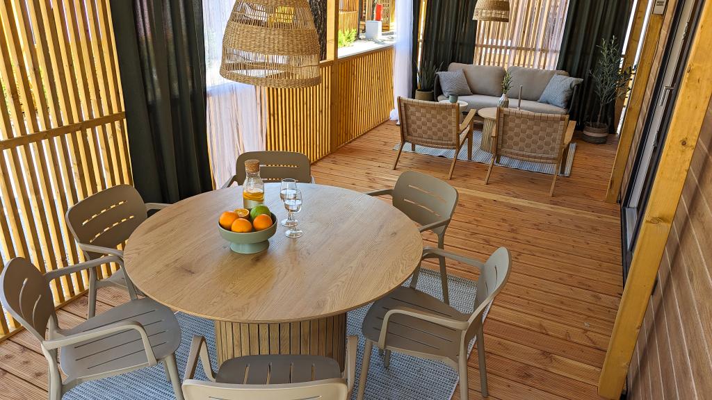 Uživajte u prirodi i udobnosti: Mobilne kućice Jaki u kampu Soline, Biograd na Moru. Smještene u mirnom dijelu kampa s 4 zvjezdice, okružene borovom šumom, naše moderno opremljene mobilne kućice idealne su za do 6 osoba. Uživajte u blizini plaže (2-5 minuta hoda), trgovina i restorana, te šetnici koja vodi do centra grada (15 minuta). Ove kućice nude 2 spavaće sobe i 2 kupaonice, dnevni boravak, veliku terasu s blagovaonskim stolom i lounge prostorom te potpuno opremljenu kuhinju - perilica suđa, mikrovalna pećnica, aparat za kavu, toster, blender, vanjski roštilj. Kućica također uključuje besplatan WiFi, besplatno parkirno mjesto odmah pored kuće, Smart TV, klima uređaj, ručnike i posteljinu. Kamp nudi mnoge sadržaje za cijelu obitelj: prekrasne pješčane i šljunčane plaže koje se protežu sve do centra grada, restoran s mediteranskim specijalitetima, dječje igralište, sportske aktivnosti i najam bicikla. Najveći hrvatski tematski vodeni park Dalmaland udaljen je 15 minuta vožnje autom.