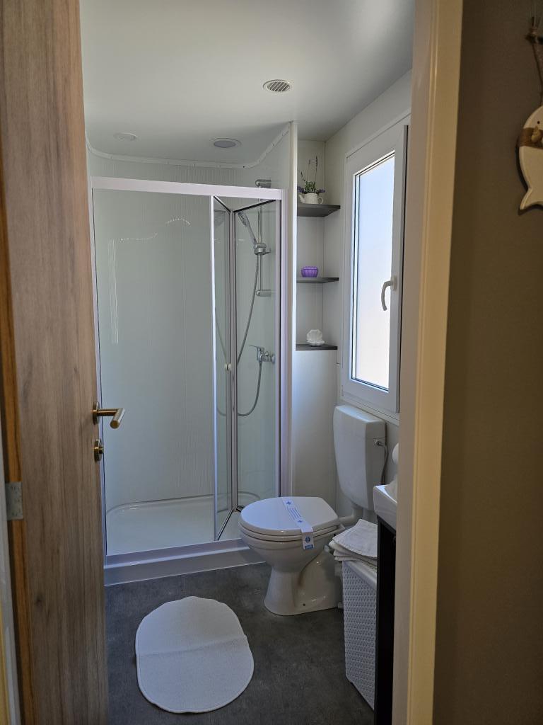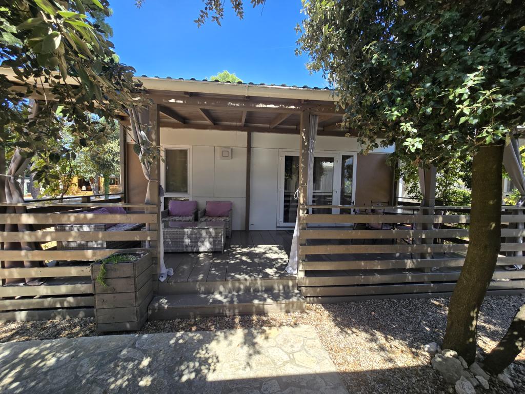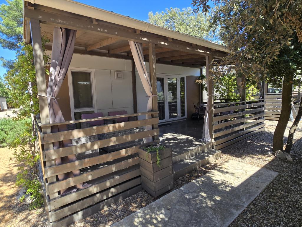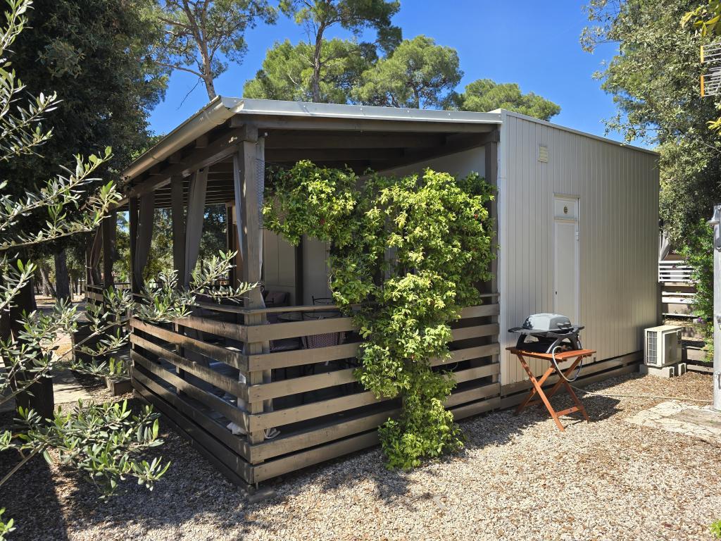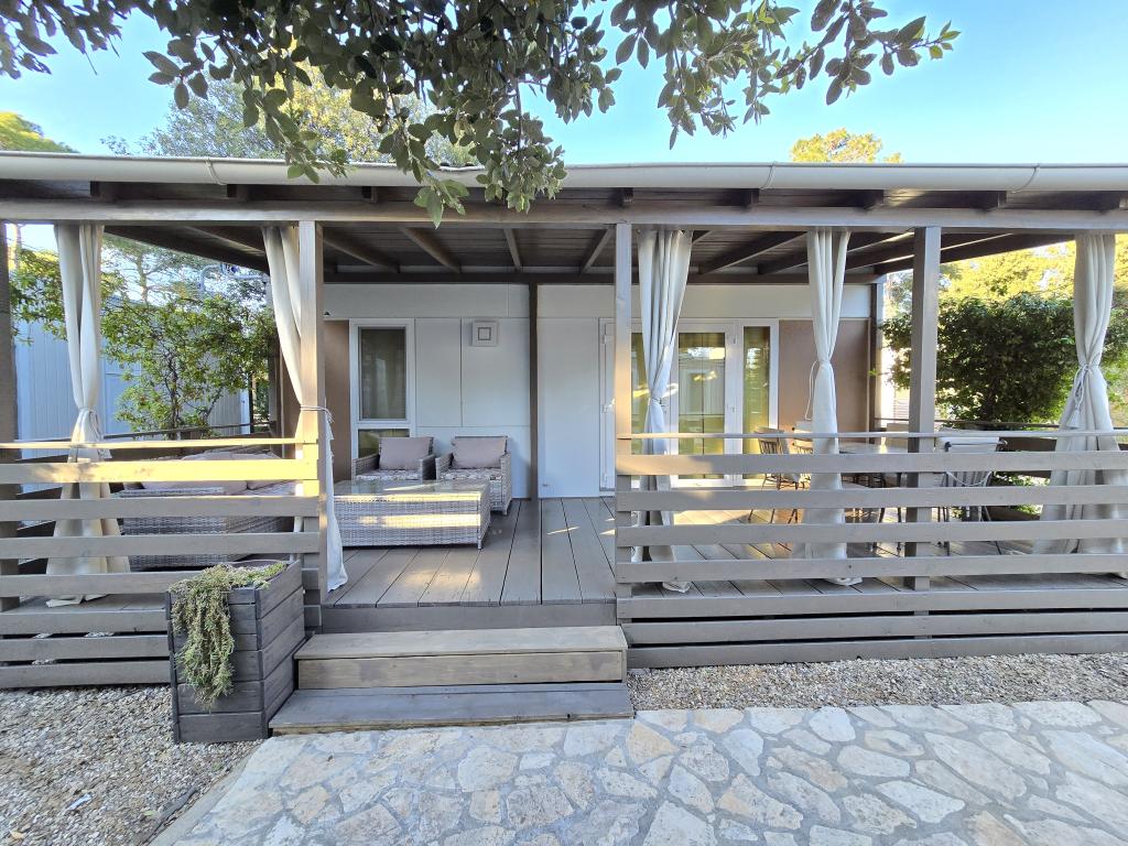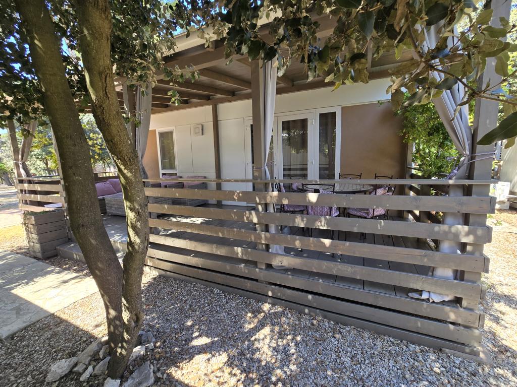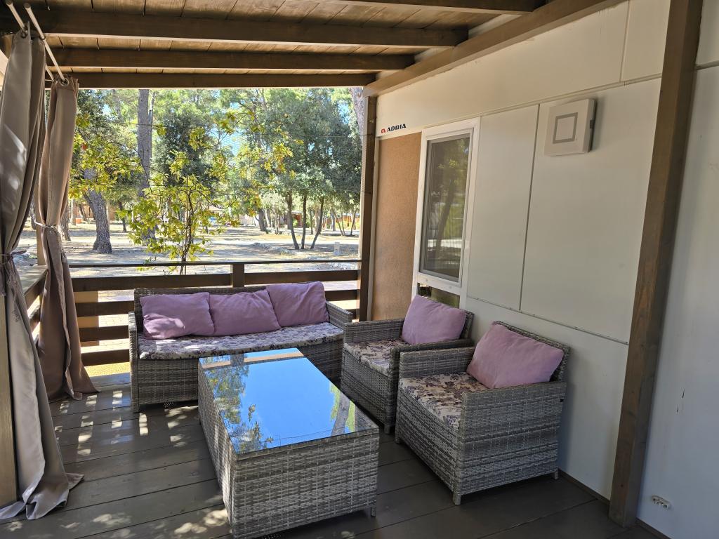 Poptuno opremljena mobilna kučica površien 30m2 sa vekilom terasom i mjestom za parkiranje. Smještena u mirnijom dijelu kampa Soline, ne previše oddaljena od buke restorana i kafiča te plaže a ipak dovoljno blizu.