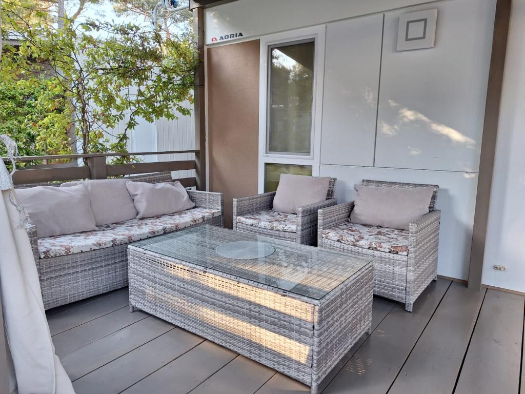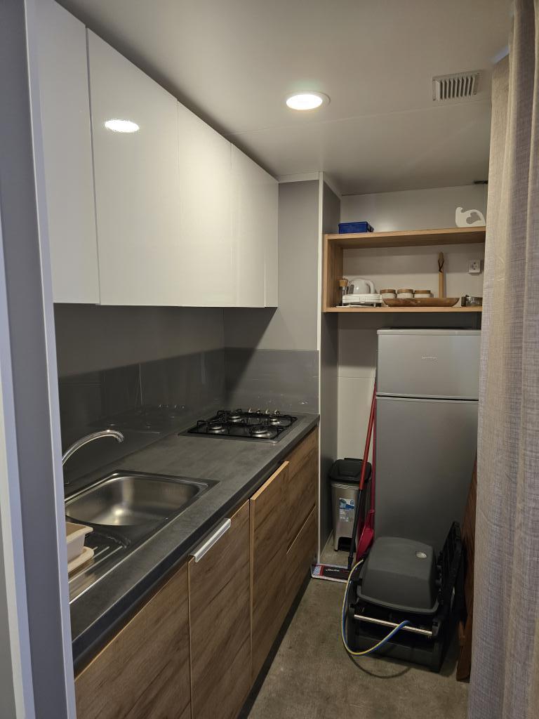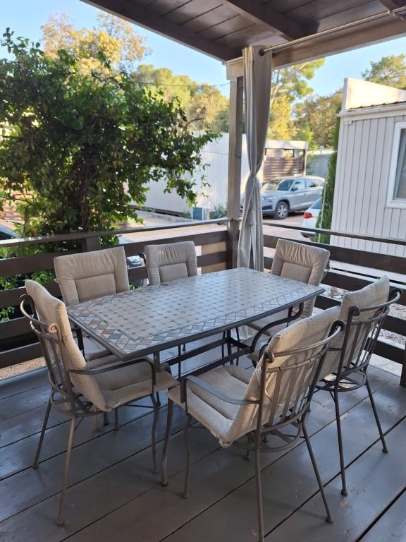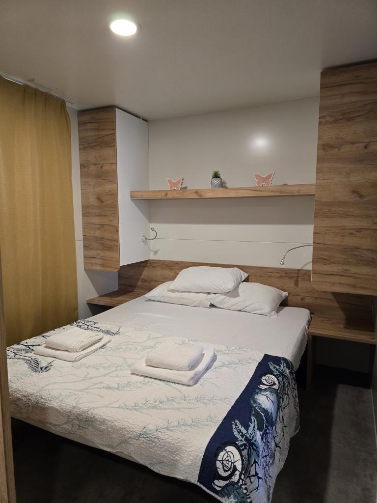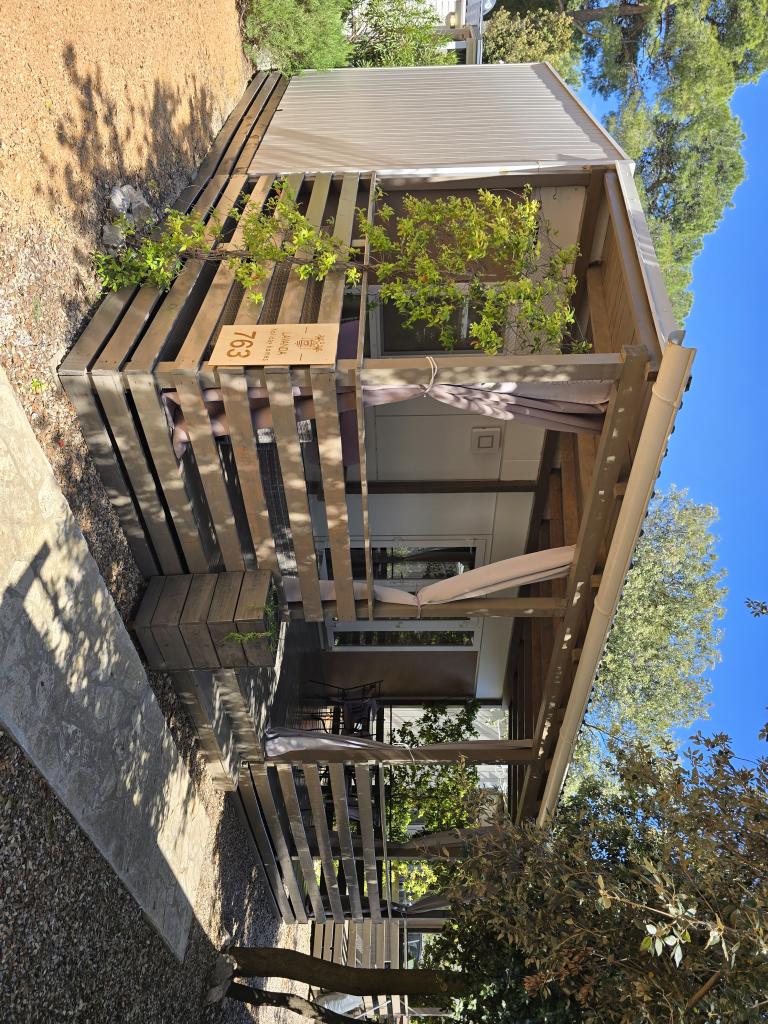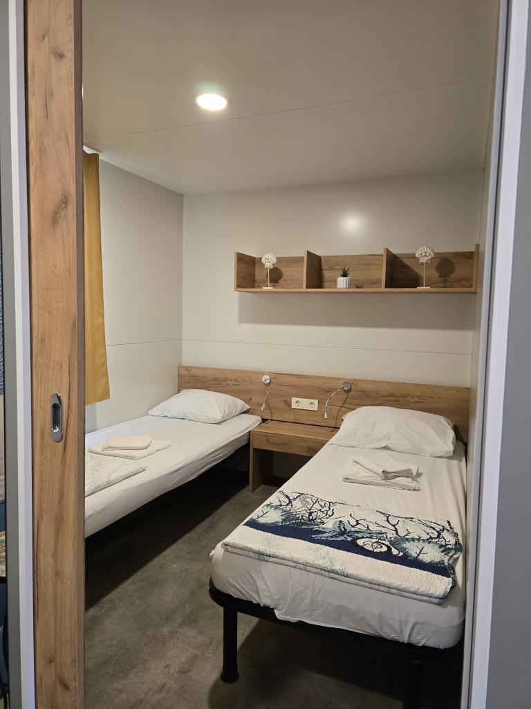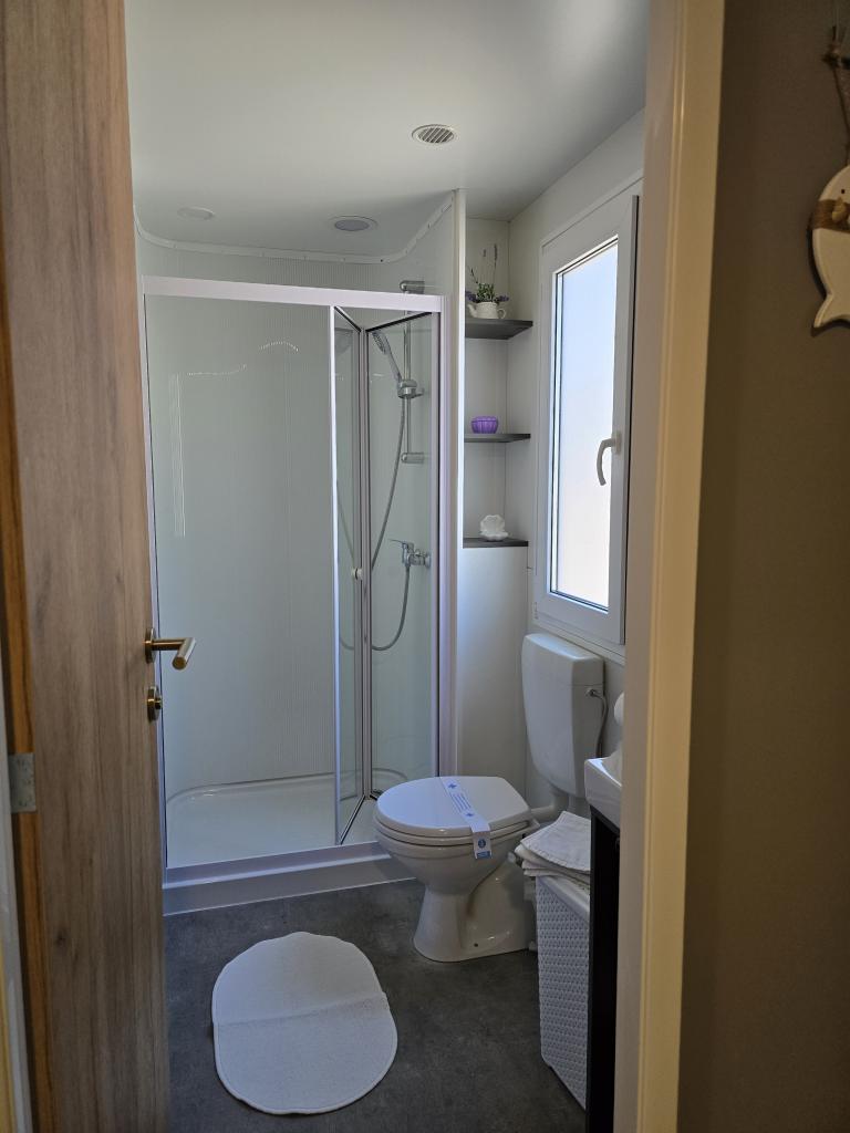 Poptuno opremljena mobilna kučica površien 30m2 sa vekilom terasom i mjestom za parkiranje. Smještena u mirnijom dijelu kampa Soline, ne previše oddaljena od buke restorana i kafiča te plaže a ipak dovoljno blizu.