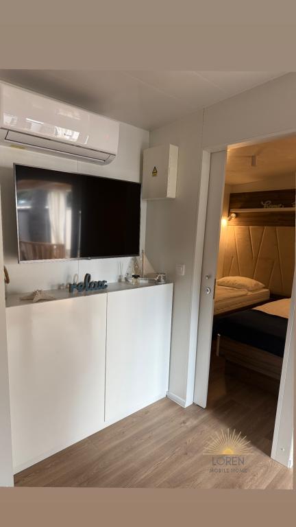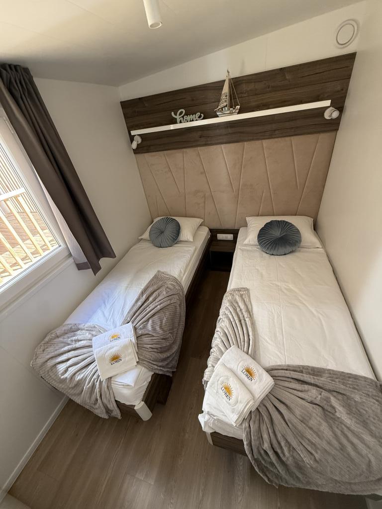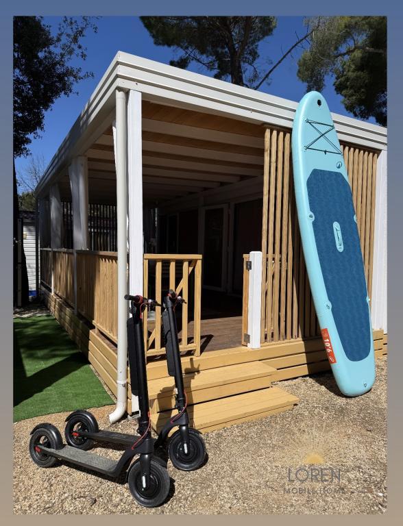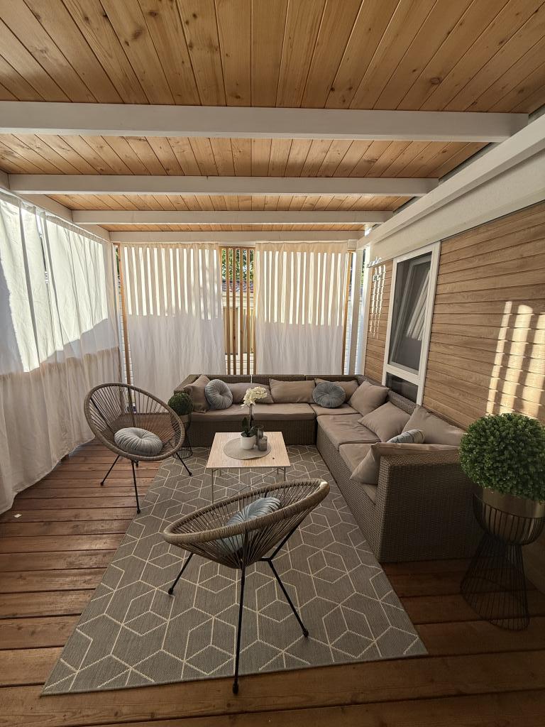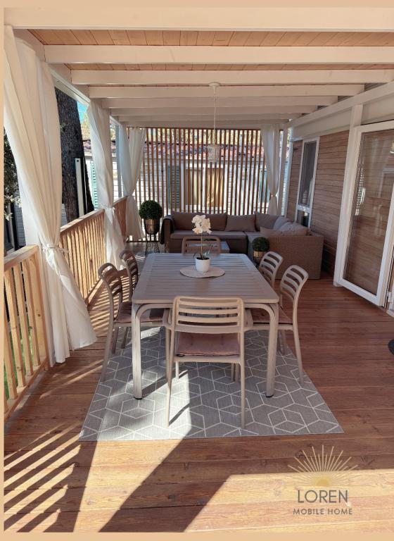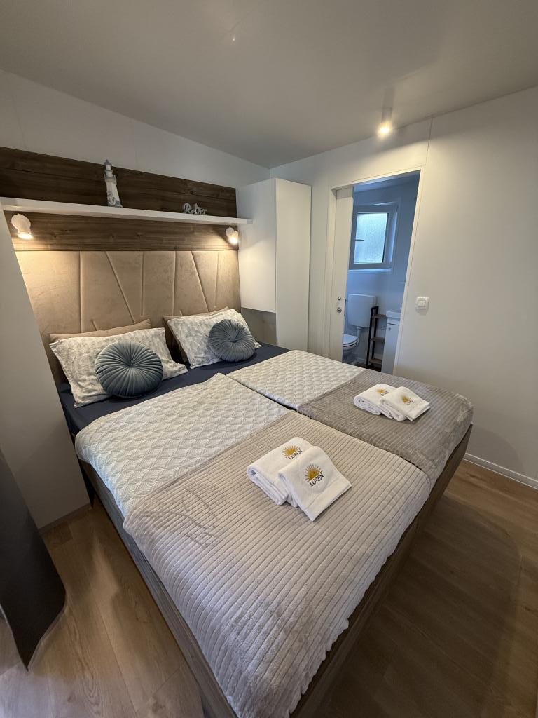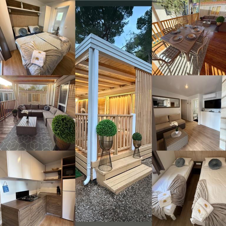 Predivna mobilna kućica za 6 osoba, nalazi se u na 2 minute od prekrasnih šljunćanih plaža i svih sadržaja, okružena gustom borovom šumom što garantira ugodan boravak u prirodnoj hladovini. Opremljena je sa dvije spavaće sobe te dodatnim bračnim ležajem u dn.boravku popraćeno sa dvije kupaone te potpuno opremljenom kuhinjom-perilica posuđa,aparat za kavu, toster, kuhalo za vodu, mikrovalna..Prostrana terasa sa lounge zonom i velikim stolom opremljena je i roštiljem, vanjskim tušem , a na raspolaganju su sup i el.romobili. Pekara, dućan, kafići i restorani odmah su pored kućice. Ljubimci su dobrodošli, a za djecu smo pripremili baby set- hranilica i kinderbet. Parking pored kućice se ne naplaćuje.