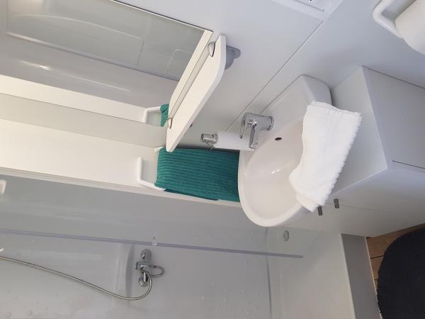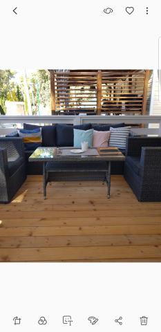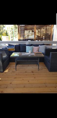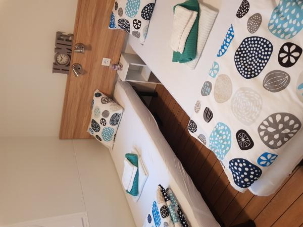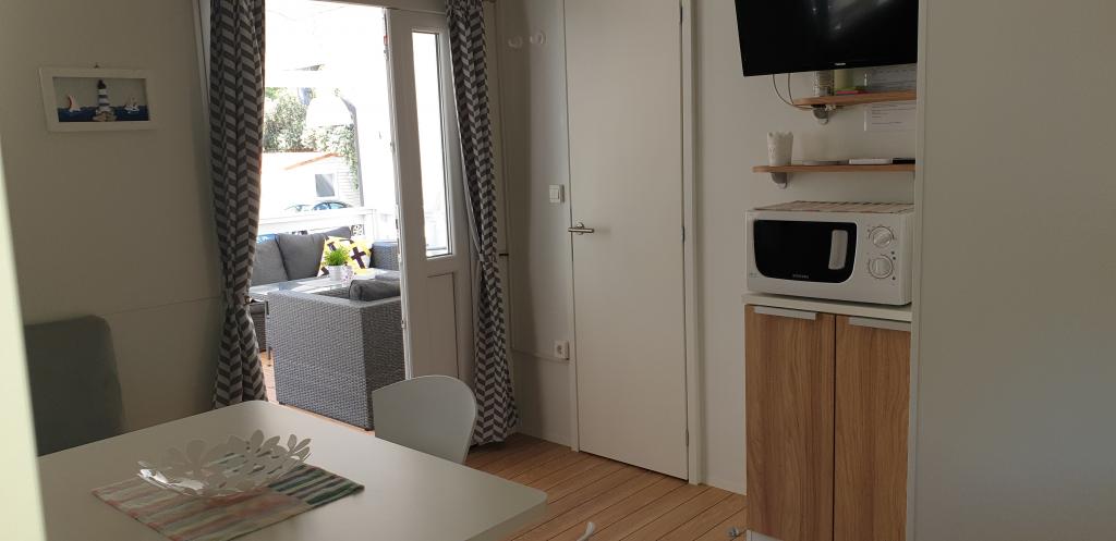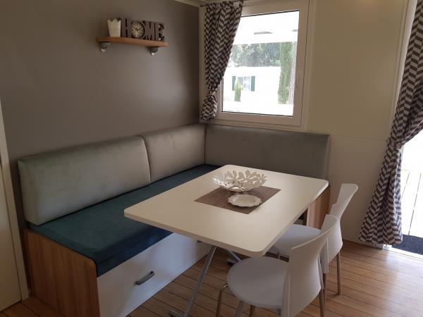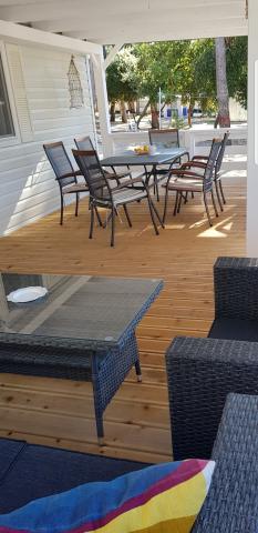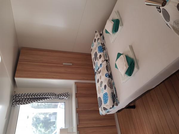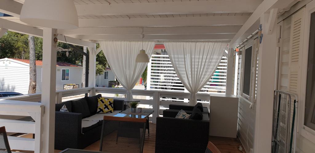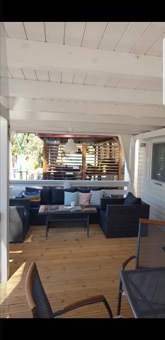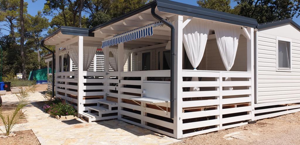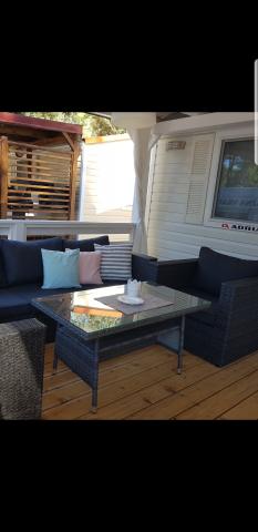 NOVO!! Potpuno nova mobilna kućica. Sastoji se od 2 sobe (1 sa bračnim krevetom i druga sa 2 odvojena kreveta) od kojih svaka ima svoju vlastitu kupaonicu te dnevnog boravka s kuhinjom u kojoj se nalazi krevet na razvlačenje. Kućica je predvidjena za 4 2 osobe. Ukupna površina same kućice iznosi 32 m2, a natkrivene terase je 24 m2 na kojoj se nalazi veliki blagavaonski stol sa 6 stolica te ležaljke za što ugodniji odmor. Kućica je odlično opremljena, sadrži klimu, tv, kuhalo za vodu, mikrovalnu, veliki hladnjak i kompletan kuhinjski pribor. Kamp je smješten u sredini borove sume. Nudi usluge mjenjačnice, pranja i sušenja rublja te svakodnevno organizira razne aktivnosti kako za djecu tako i za odrasle. U sklopu kampa nalazi se i nekoliko restorana i kafića. Za one koji vole aktivni odmor možete birati izmedju bicikliranja, ronjenja, odbojke na pijesku, tenisa, stolnog tenisa, skijanja na vodi, jedrenja te izleta u nekoliko obližnjih nacionalnih parkova kao i izleta brodom.