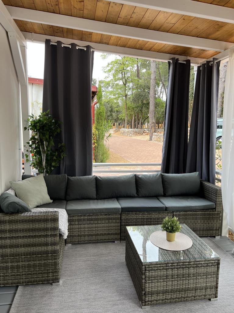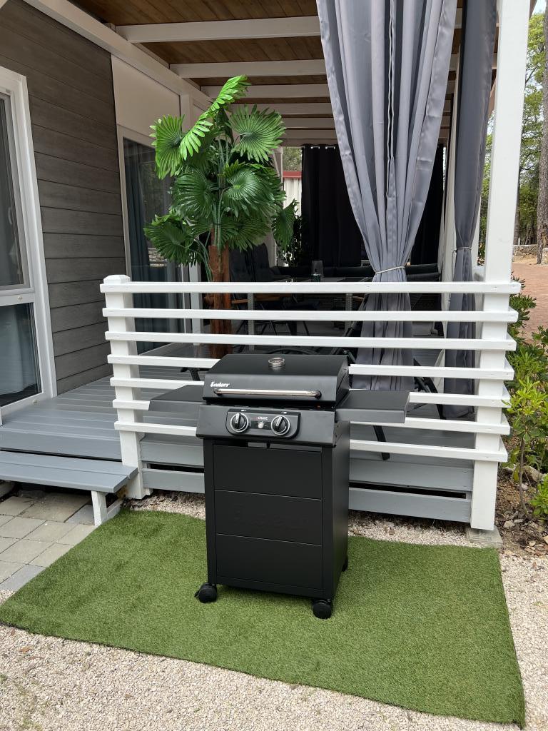 Kućica sadrži: 2 spavaće sobe, Kuhinja (kompletan invertar), Blagovaonica , jedna Kupaonica , Natkrivena komplet opremljena terasa 32m2, Krevetić za bebe, Hranilica za bebe, Sušilo za kosu, Aparat za kavu, Kuhalo za vodu, Roštilj, Toster, Mikrovalna pećnica, Glačalo, Ručnici, Posteljina,Kuhalo za jaja, Standmixer, Usisivac