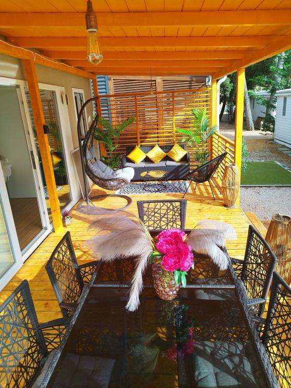 Mobilna Kucica Nensi smjestena je u Campu Soline u Biograd na Moru, na samo dvije minute od prekrasne sljuncane plaze. Opremljena je s dvije sobe i to jedna s krevetom (160 x 200 cm) te vlastitim wc-om/kupaonom. Druga soba ima dva kreveta (80 x 200 cm) koja se vrlo lako mogu spojiti u veci krevet. Ima dnevni boravak, potpuno opremljenu kuhinju, dodatni wc/kupaonu, perilicu posudja, mikrovalnu, zamrzivac, aparat za kavu te kauc koji se razvlaci u krevet na kojem mogu spavati dvije osobe. Kucica moze smjestit sest osoba (4 2). Na predivnoj i prostranoj terasi mozete se opustati i uzivati u zalasku sunca i dobroj kapljici vina. U Kampu imate restoran na samo 200 m od kucice, takodjer tu su i razni kafici te restorani kao i igraliste za dijecu. Svakodnevne animacije se odrzavaju za nase najmladje goste. Do centra Biograda moze se doci setnicom kroz gustu borovu sumu koja osigurava hlad, uz nju se nalaze svakojake atrakcije kako za nase najmladje tako i za odrasle.