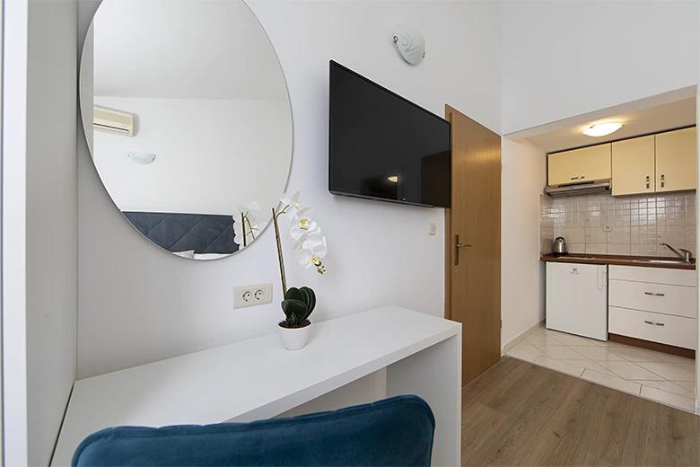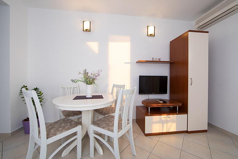 Studio je vrlo čist, smeće se odvozi svaki dan, ručnici se mijenjaju po potrebi. Oprema je lijepa, moderna, sve radi. Kuhinja je mala, oprema je također prikladna za to - samo najnužnije. Balkon je pogodan za sjedenje samo ujutro, jer je preko dana previše vruće. Klima radi savršeno. Wi-Fi veza ima tendenciju prekida tijekom večernjih špica. Domaćini su vrlo ljubazni i uslužni. Plaža je vrlo lijepa i nudi puno hlada; posebno Punta Rata. More čisto, lijepih boja.