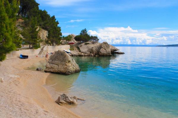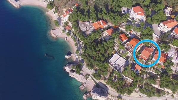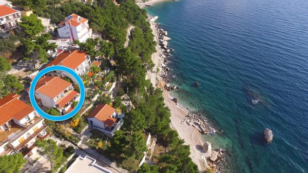 Apartmani u mirnom dijelu Brela, samo 40 m od mora i plaže. U blizini apartmana se nalaze dva restorana. Mali market 300 m od apartmana, centar 2 km. Kroz cijela Brela je smještena promenada uz more kojom ne voze auti. Pogodno za djecu i starije. .