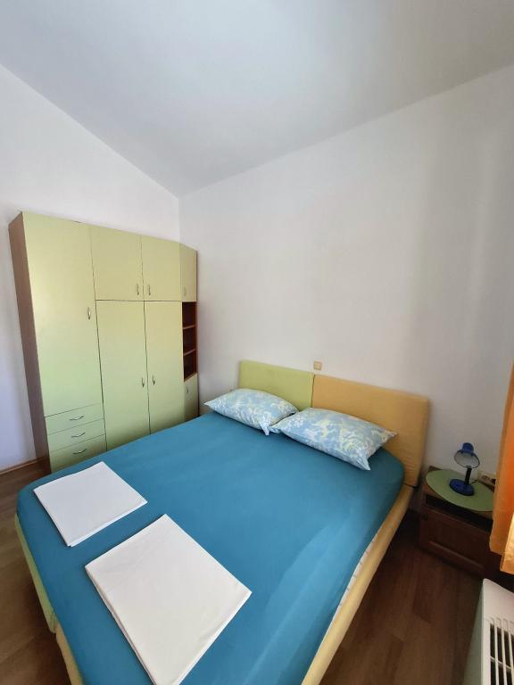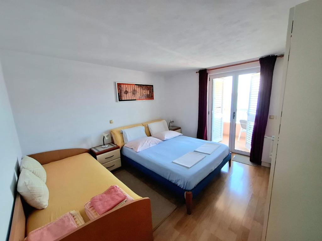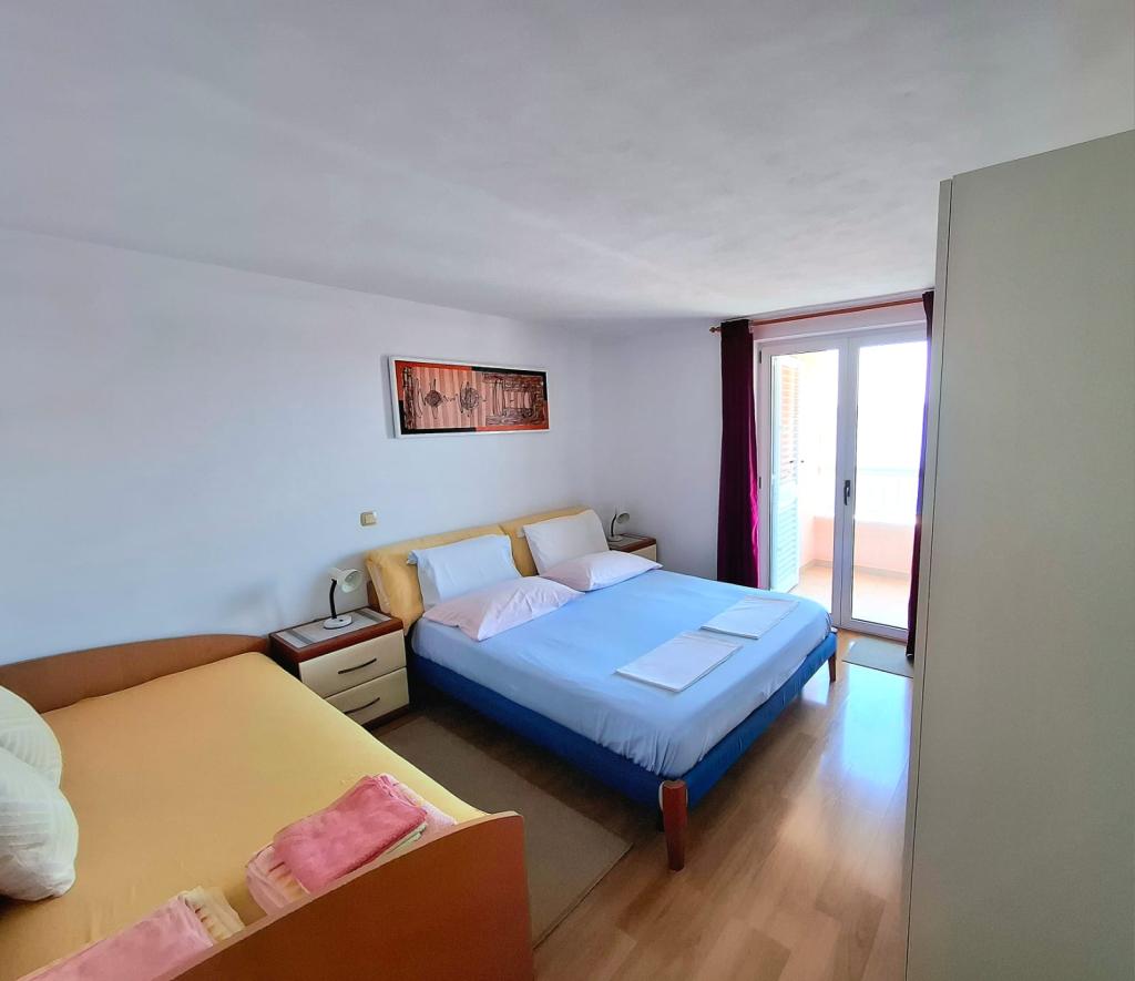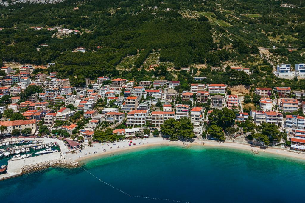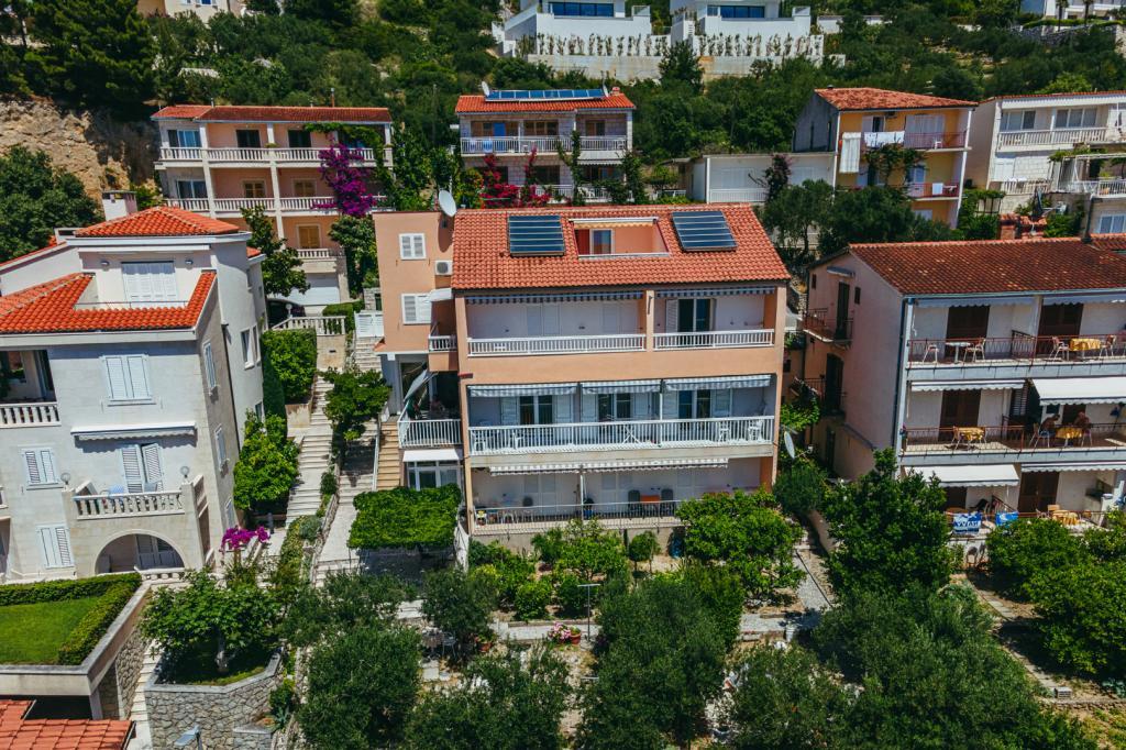 Apartmani su dio dvoipolkatne obiteljske kuće, locirane u neposrednoj blizini plaže i centra mjesta i na polovici puta između hotela \Soline\ i \Berulia\. Radi se o samostalnom objektu sa posebnim ulazima iz Frankopanske ulice sa sjeverne i Gundlićeve s južne strane. Okućnica se sastoji od parkinga i garaže neposredno uz ulicu sa sjeverne strane, te velikog dvoetažnog vrta sa agrumima i maslinama sa južne strane u dijelu kojeg je i terasa za odmor. Apartmani se nalaze na drugom katu, sa velikim predulazom, svaki sa zasebnim glavnim ulazima sa sjeverne strane, te balkonima (lođama) sa južne strane, sa kojih se pružaju prekrasni pogledi na plažu, more, centar mjesta, obližnje otoke Brač i Hvar, kao i planinu Biokovo. Radi se o novoizgrađenim smještajnim jedinicama, namijenjenim za boravak i odmor 4 ( 1) osobe, sa odgovarajućim sadržajima i opremom 2 spavaće sobe, 2 kupatila, kuhinja, Sat Tv, klima i dr.