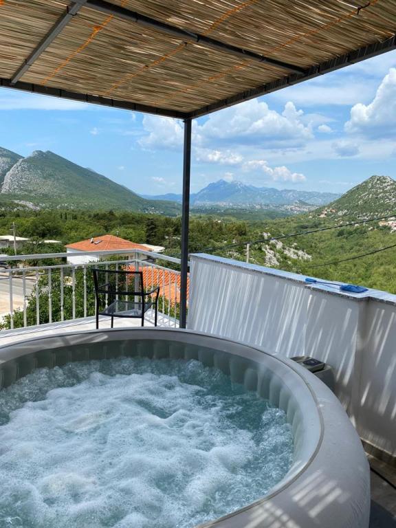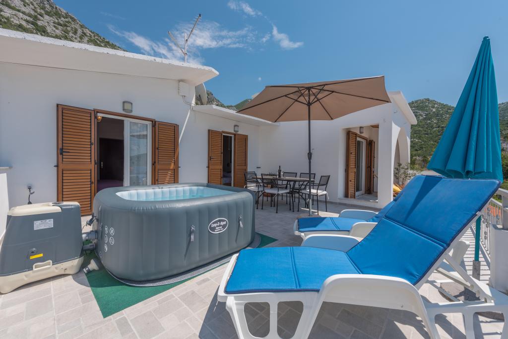 Kompletno opremljen novorenovirani ,komforni apartman-105m2 u mirnom okruženju-udaljen 4 km od mora, 10km do poznate plaže Punta Rata Brela-(za naše goste besplatna parking karta ). Max.4 odrasle osobe +1 dijete. Potpuno klimatizirani objekt (3 klima- jedinice) ,2 spavaće sobe,2 kupatila,kuhinja i dnevni boravak, 2 terase od kojih 1 panoramska 45 m2,velika sa jacuzzijem.Ispred kuće u dvorištu-parking za 2 auta u hladovini. Prostrani apartman zauzima cijeli 2. kat kuće te omogućava potpunu privatnost,predivni zalasci sunca, panoramski pogled na okolna mala mjesta i Park prirode Biokovo učinit će vaš odmor nezaboravnim.