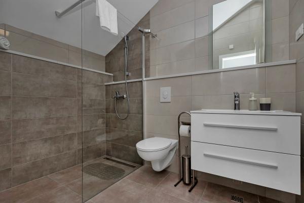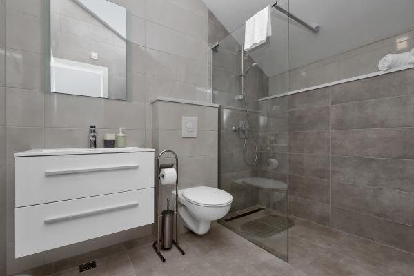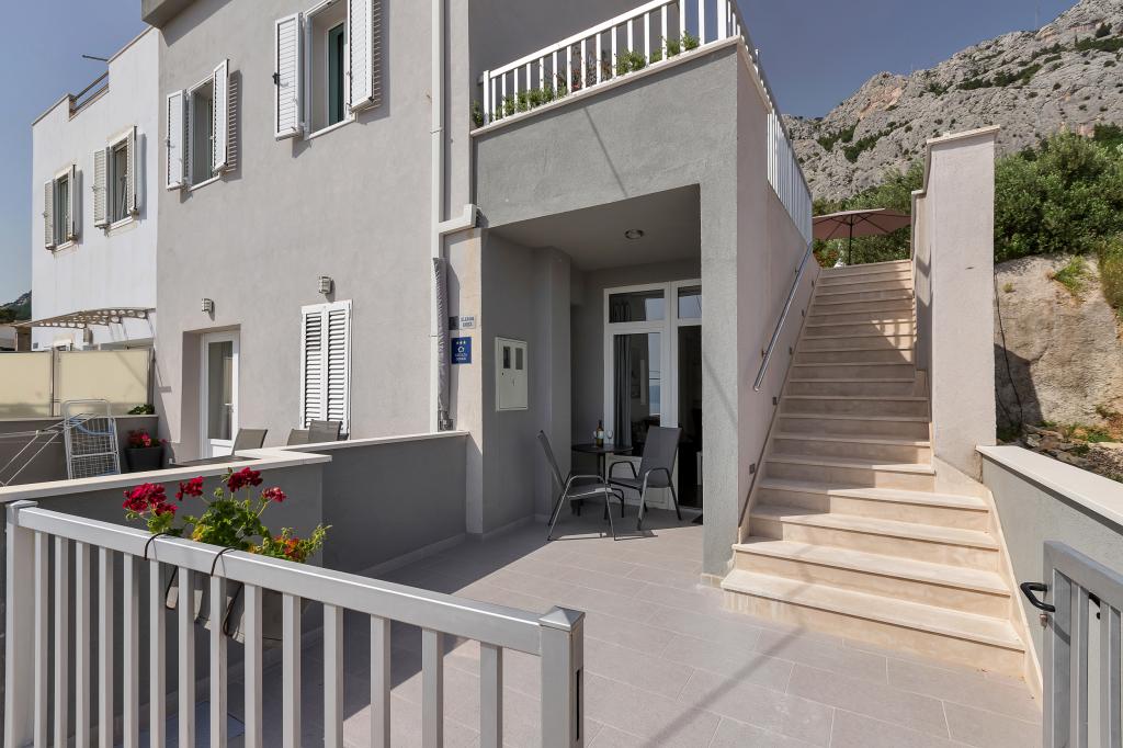 Villa NiMa, novoobnovljena kuća za odmor u starom dijelu Brela, svojim gostima nudi miran odmor daleko od gužve i buke. Sastoji se od dvoetažnog apartmana i sobe koja se nalazi u prizemlju, ukupne površine 120m2. Na prvom katu nalaze se kuhinja, blagovaonica sa stolom, dnevni boravak, kupaonica te ostava s perilicom rublja. Unutarnjim stepenicama se dolazi u potkrovlje u kojem su smještene 2 spavaće sobe (bračni krevet) s kupaonicama. Moderna kuhinja sadrži štednjak sa 4 grijače ploče, mapu, hladnjak i zamrzivač te perilicu posuđa. Kuhinja je u potpunosti opremljena posuđem i priborom za kuhanje i jelo. Dnevni boravak je opremljen LED SAT-TV-om te trosjedom koji se može pretvoriti u udoban ležaj (160x200). Apartman je u potpunosti klimatiziran ima 3 klima uređaja, po jednu u spavaćim sobama te jednu u prostoru kuhinje, blagovaonice i dnevnog boravka. Iz apartmana se izlazi na prostranu terasu od 56m2 koja je dijelom okrenuta prema jugu i moru, a dijelom prema planini Biokovo.