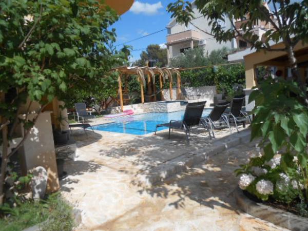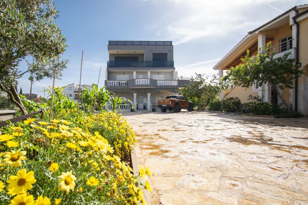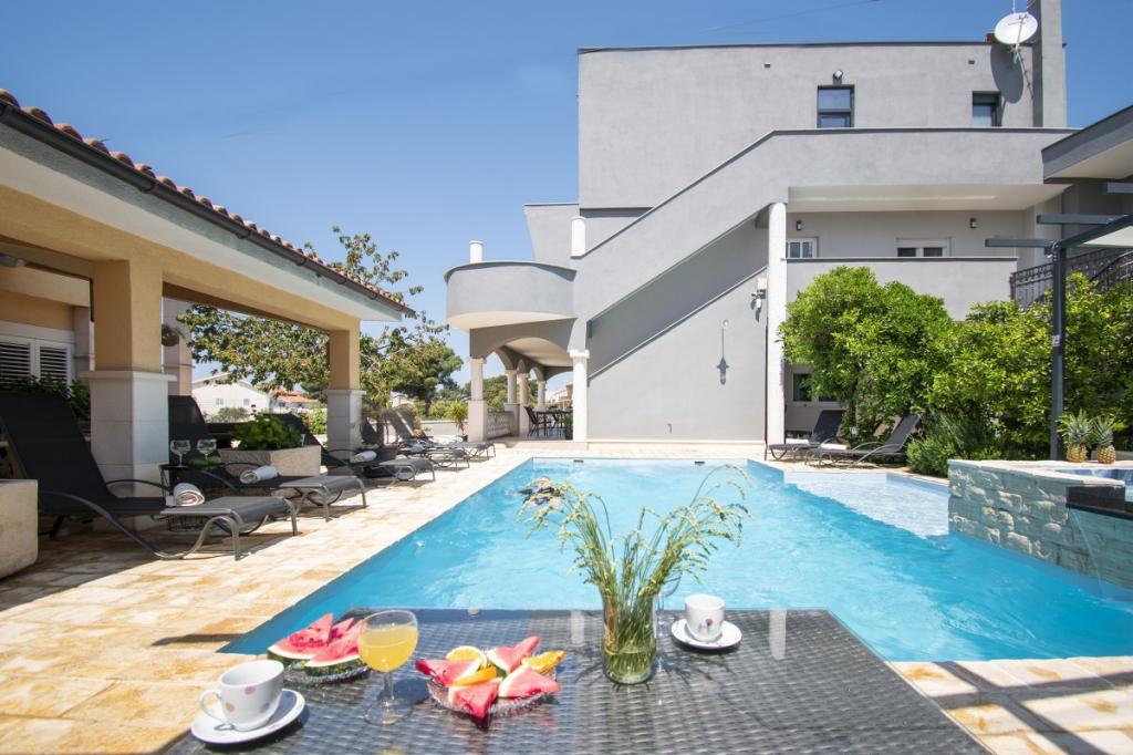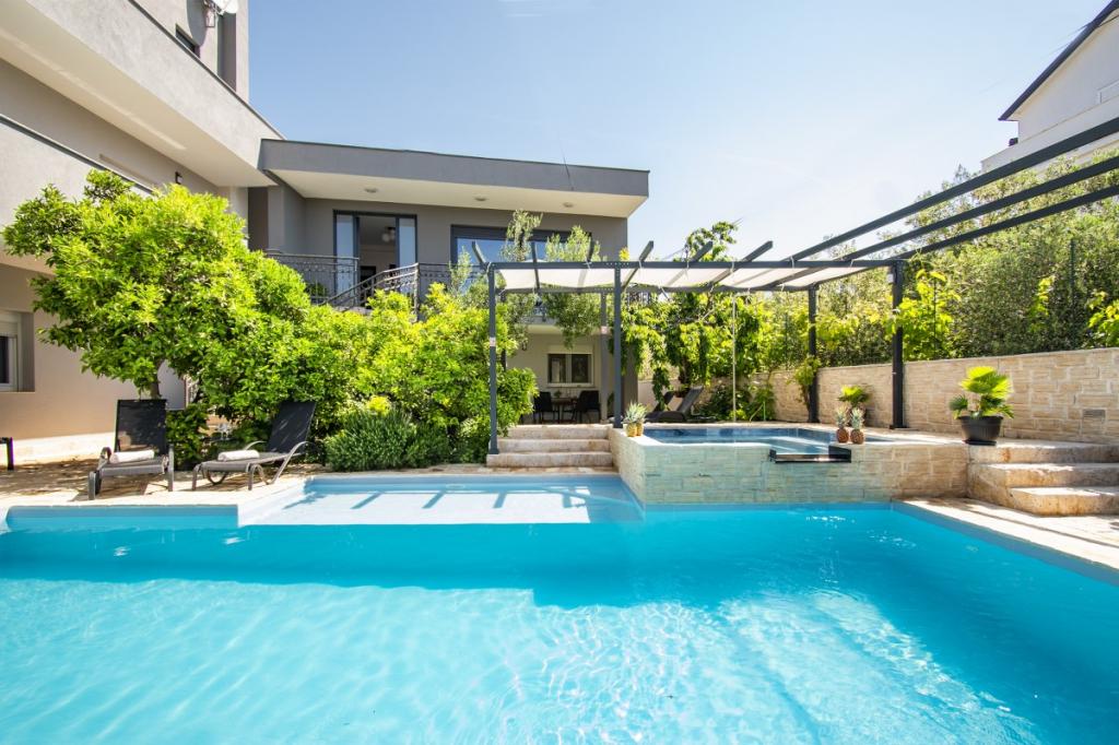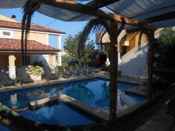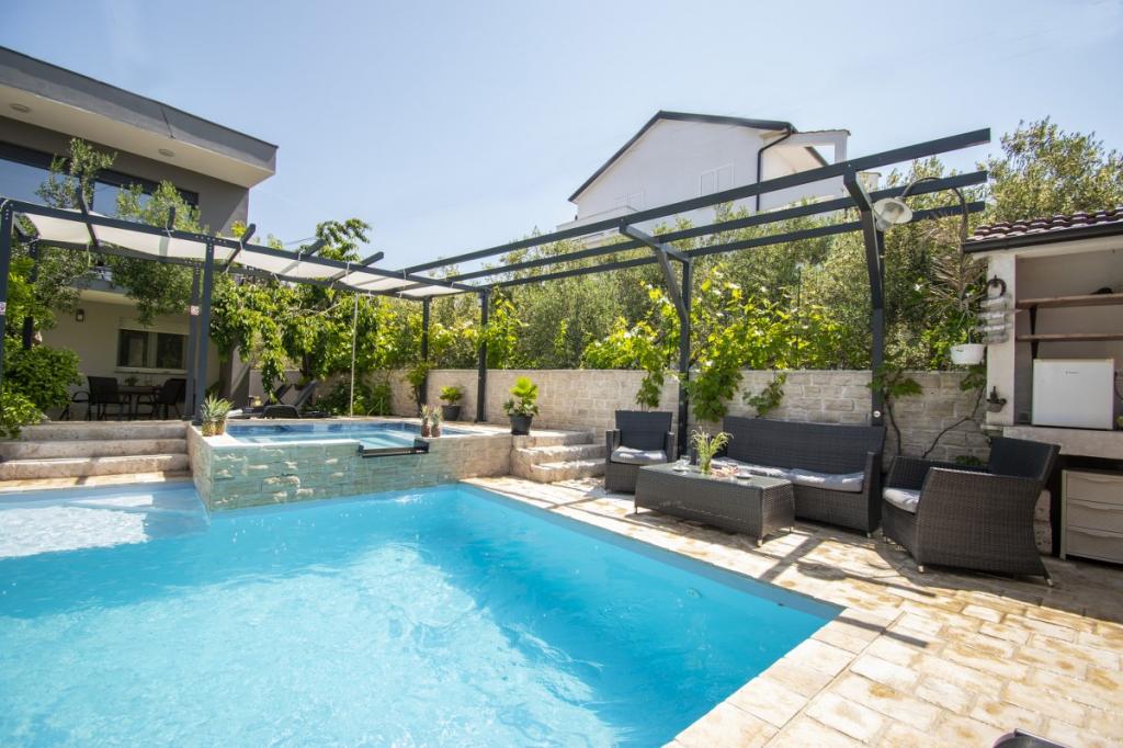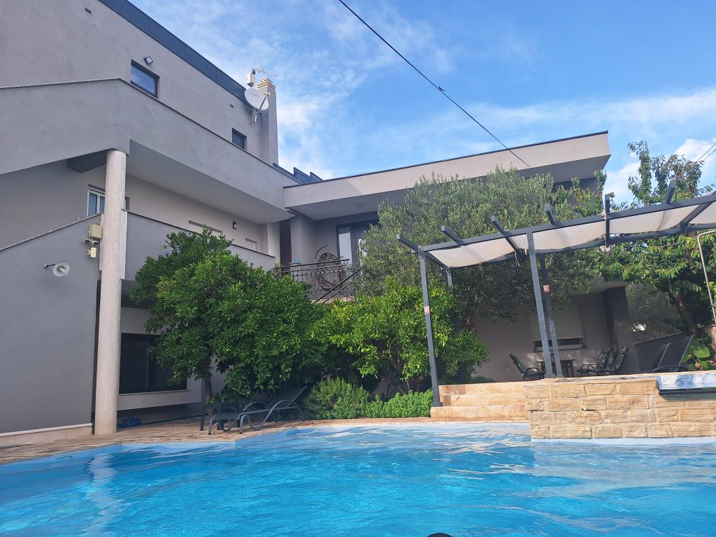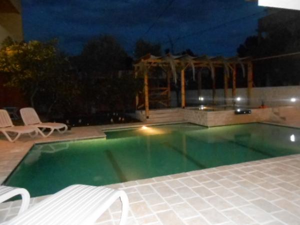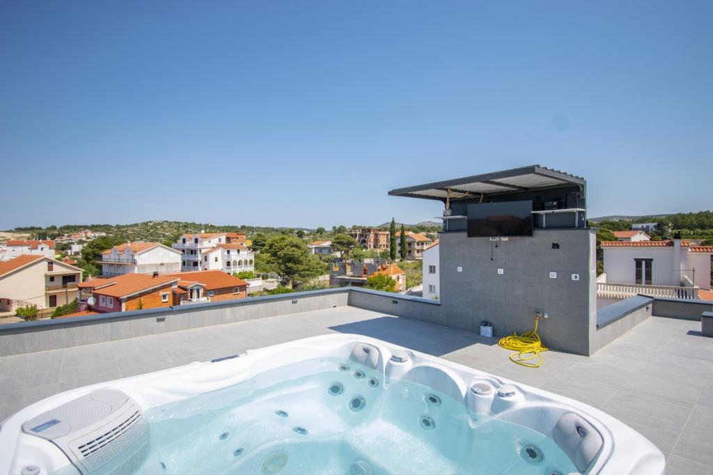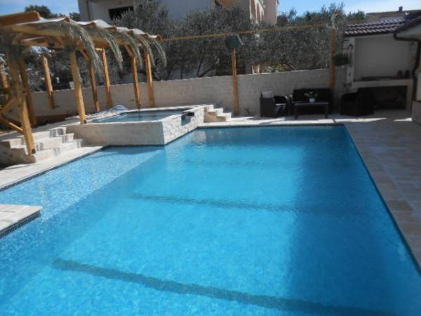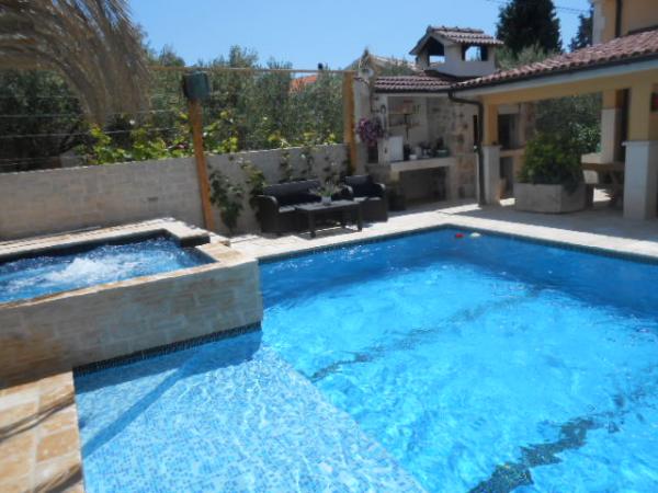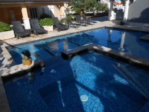 Kuća za 10 osoba sa bazenom i jacuzzijem nalazi se u mirnom predjelu Brodarice okružena sa dosta zelenila i cvijeća. Kuća ima tri apartmana. U prizemlju se nalazi novouređen luksuzno sređen s moderno opremljenom kuhinjom ,sobom ,saunom i luksuzno sređenom kupaonom ima oko 100m2. Na katu se nalazi apartman sa dvije spavaće sobe, moderno opremljenom kuhinjom i kupaonom, apartman ima oko 90 m2,terasa je prostrana oko45m2. Treći apartman je luksuzno sređen oko 100m2 ima veliki dnevni boravak sa , kompletno opremljenu kuhinju, veliku sobu sa televizijom i klimom ,apartman ima i saunu. na krovu se nalazi jaccuzi sa velikom terasom . svaki apartman ima klimu i svaka soba također ima televiziju. Bazen je zajednički. Kuća je udaljena od mora 5-6 minuta hoda.