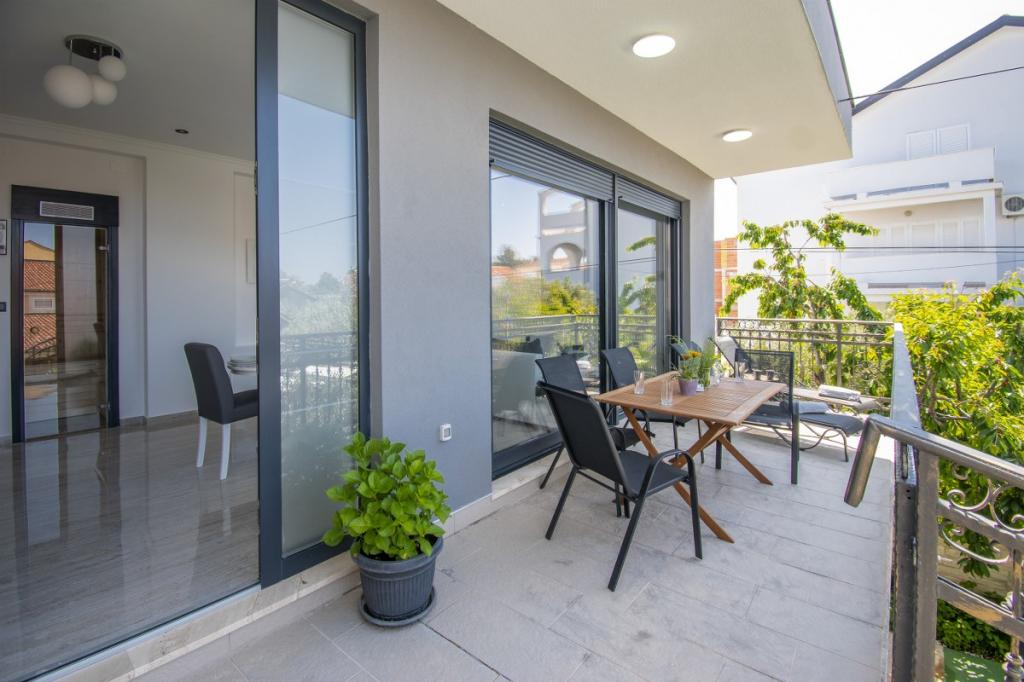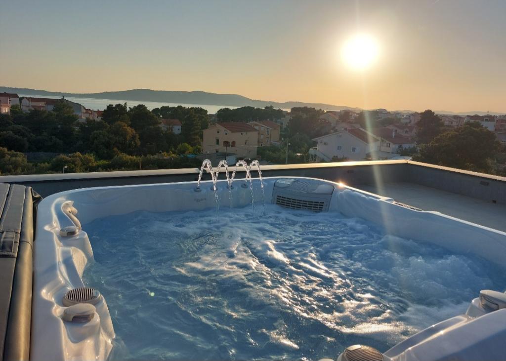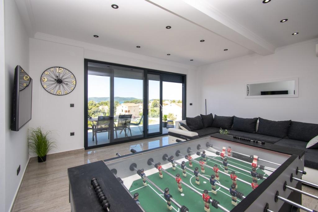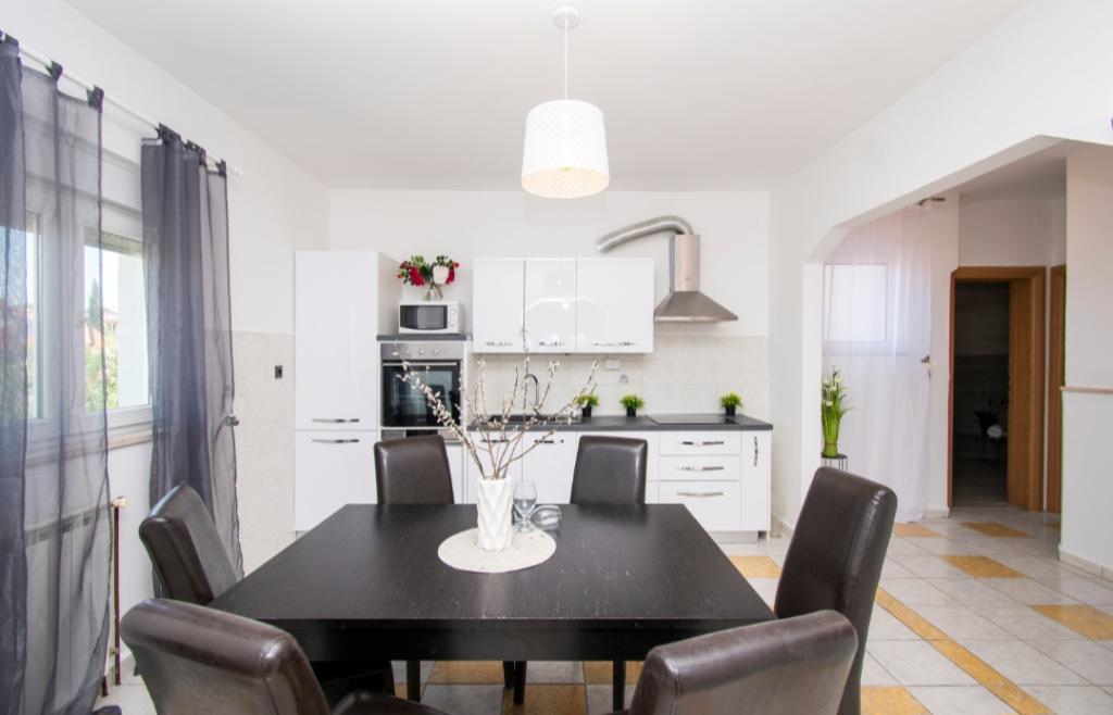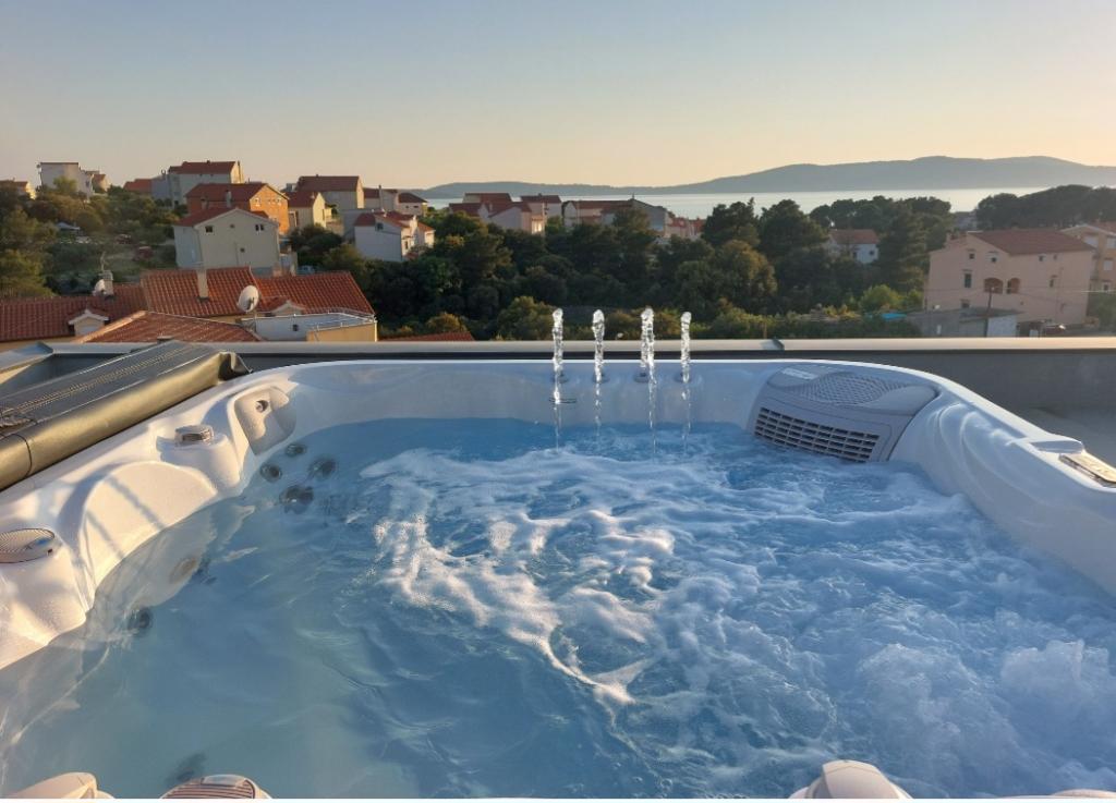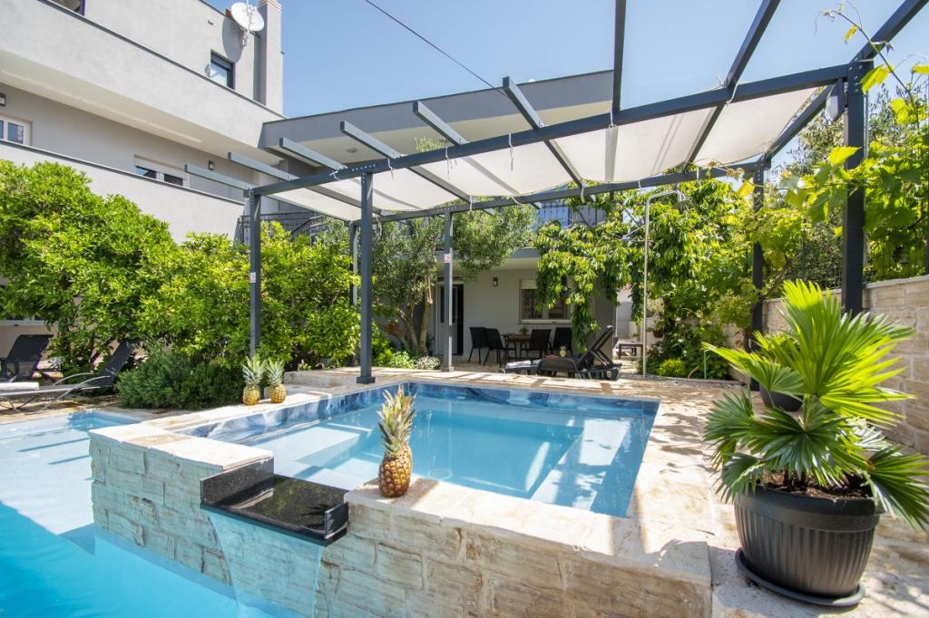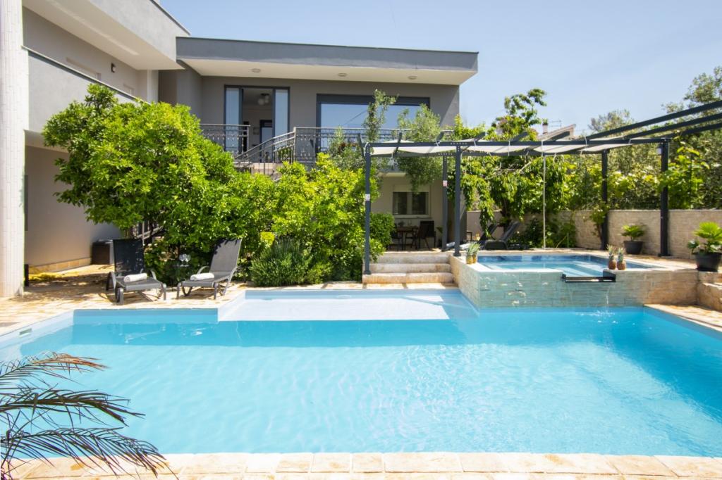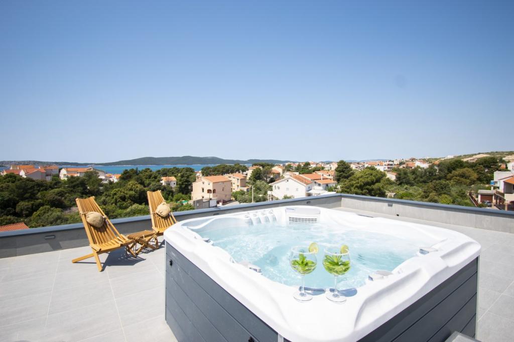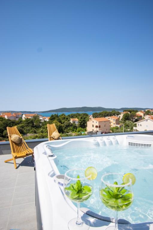 Kuća za 10 osoba sa bazenom i jacuzzijem nalazi se u mirnom predjelu Brodarice okružena sa dosta zelenila i cvijeća. Kuća ima tri apartmana. U prizemlju se nalazi novouređen luksuzno sređen s moderno opremljenom kuhinjom ,sobom ,saunom i luksuzno sređenom kupaonom ima oko 100m2. Na katu se nalazi apartman sa dvije spavaće sobe, moderno opremljenom kuhinjom i kupaonom, apartman ima oko 90 m2,terasa je prostrana oko45m2. Treći apartman je luksuzno sređen oko 100m2 ima veliki dnevni boravak sa , kompletno opremljenu kuhinju, veliku sobu sa televizijom i klimom ,apartman ima i saunu. na krovu se nalazi jaccuzi sa velikom terasom . svaki apartman ima klimu i svaka soba također ima televiziju. Bazen je zajednički. Kuća je udaljena od mora 5-6 minuta hoda.