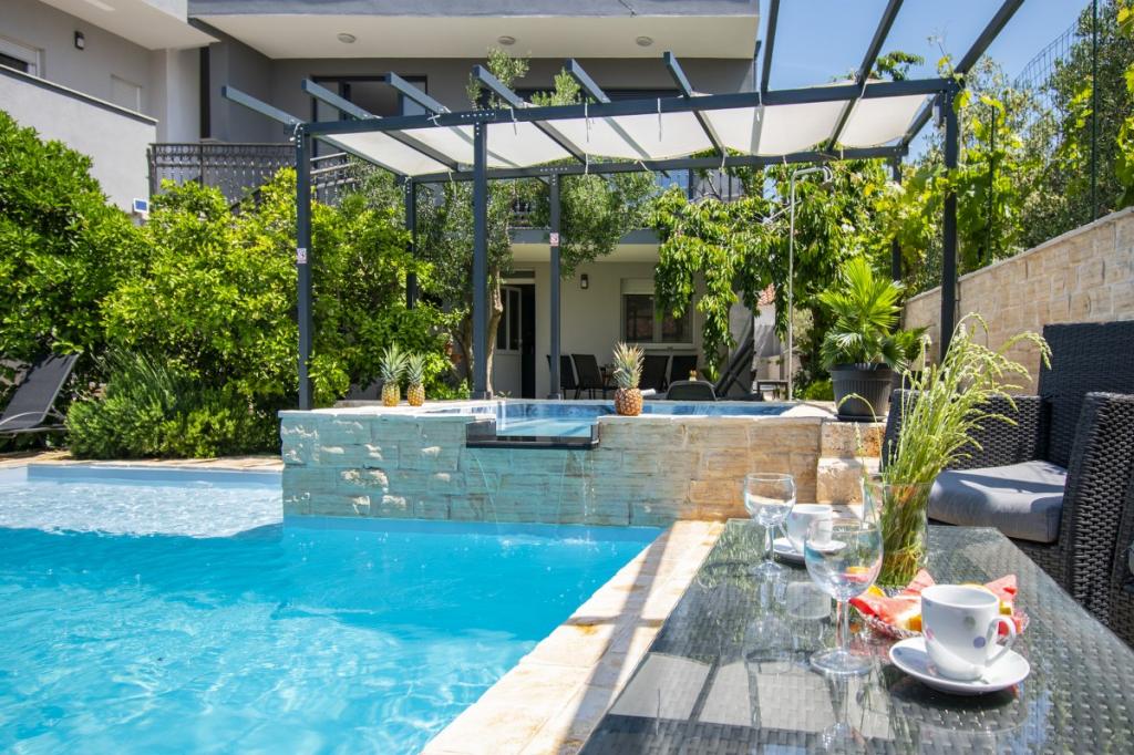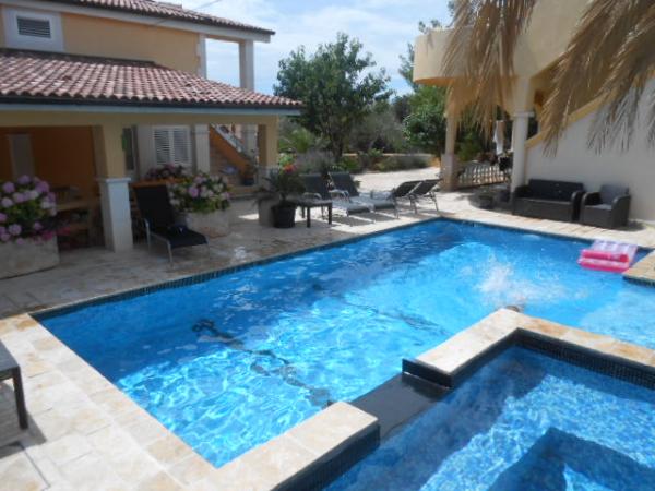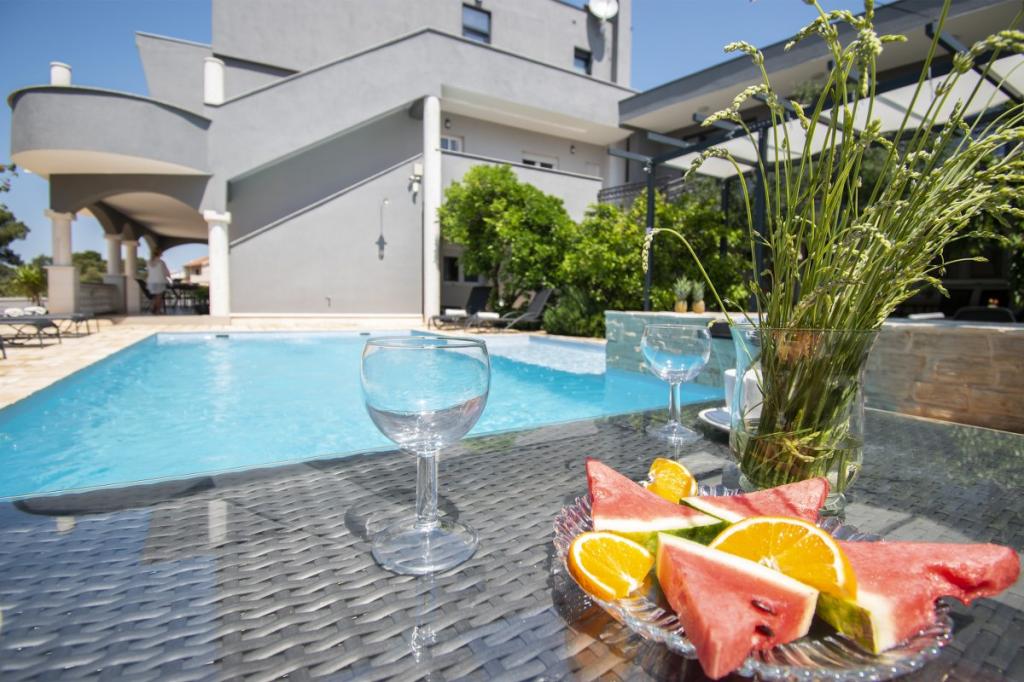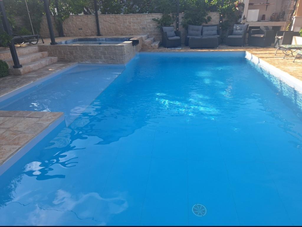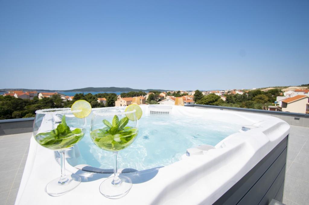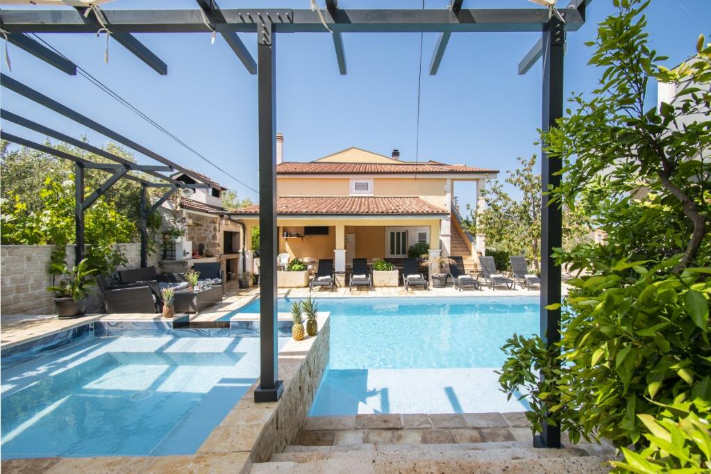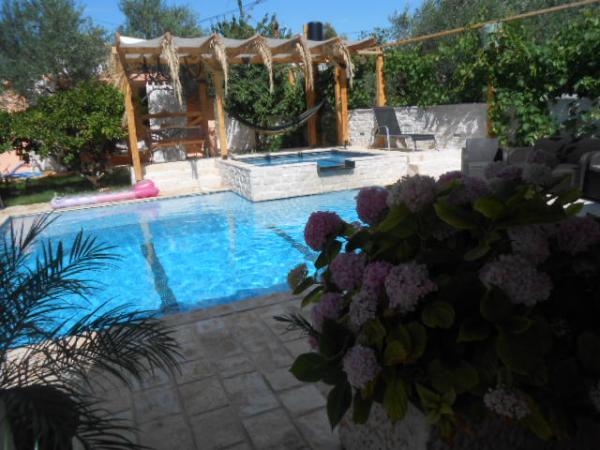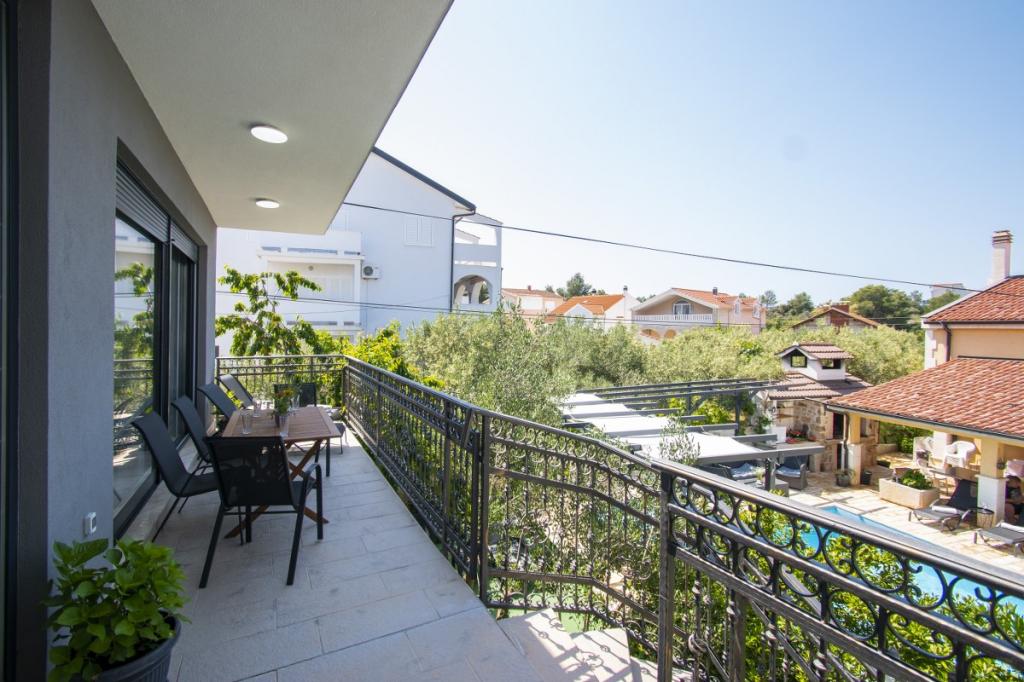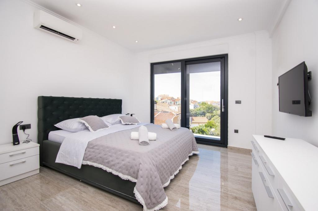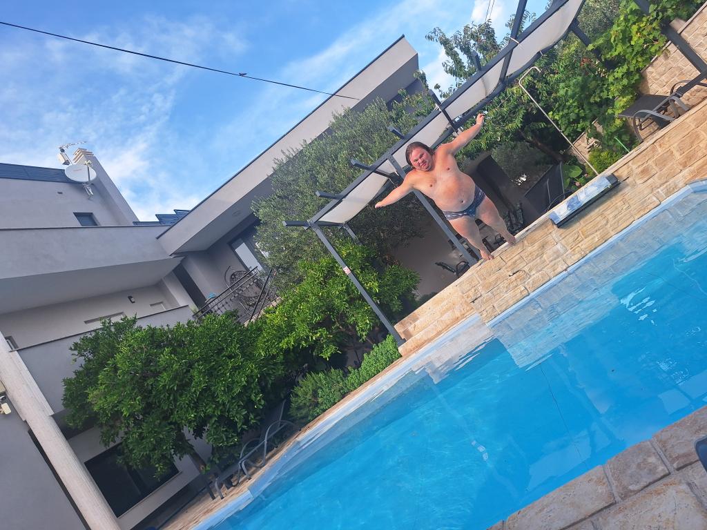 Kuća za 10 osoba sa bazenom i jacuzzijem nalazi se u mirnom predjelu Brodarice okružena sa dosta zelenila i cvijeća. Kuća ima tri apartmana. U prizemlju se nalazi novouređen luksuzno sređen s moderno opremljenom kuhinjom ,sobom ,saunom i luksuzno sređenom kupaonom ima oko 100m2. Na katu se nalazi apartman sa dvije spavaće sobe, moderno opremljenom kuhinjom i kupaonom, apartman ima oko 90 m2,terasa je prostrana oko45m2. Treći apartman je luksuzno sređen oko 100m2 ima veliki dnevni boravak sa , kompletno opremljenu kuhinju, veliku sobu sa televizijom i klimom ,apartman ima i saunu. na krovu se nalazi jaccuzi sa velikom terasom . svaki apartman ima klimu i svaka soba također ima televiziju. Bazen je zajednički. Kuća je udaljena od mora 5-6 minuta hoda.