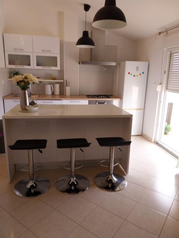 Odsjeli smo u apartmanu ID:66434. Sve je jednostavno izvrsno!!! Vrlo čista, uredna, svježa posteljina i snježno bijeli ručnici. Kuhinja ima sav potreban kuhinjski pribor, kao i kupaonica. Na usluzi su nam i perilica suđa, hladnjak i perilica rublja. Postoji parking za automobil. Ugodno, uređeno dvorište. Vlasnica je nevjerojatna žena, vrlo ljubazna i brižna. More je vrlo blizu, nekoliko metara od kuće.