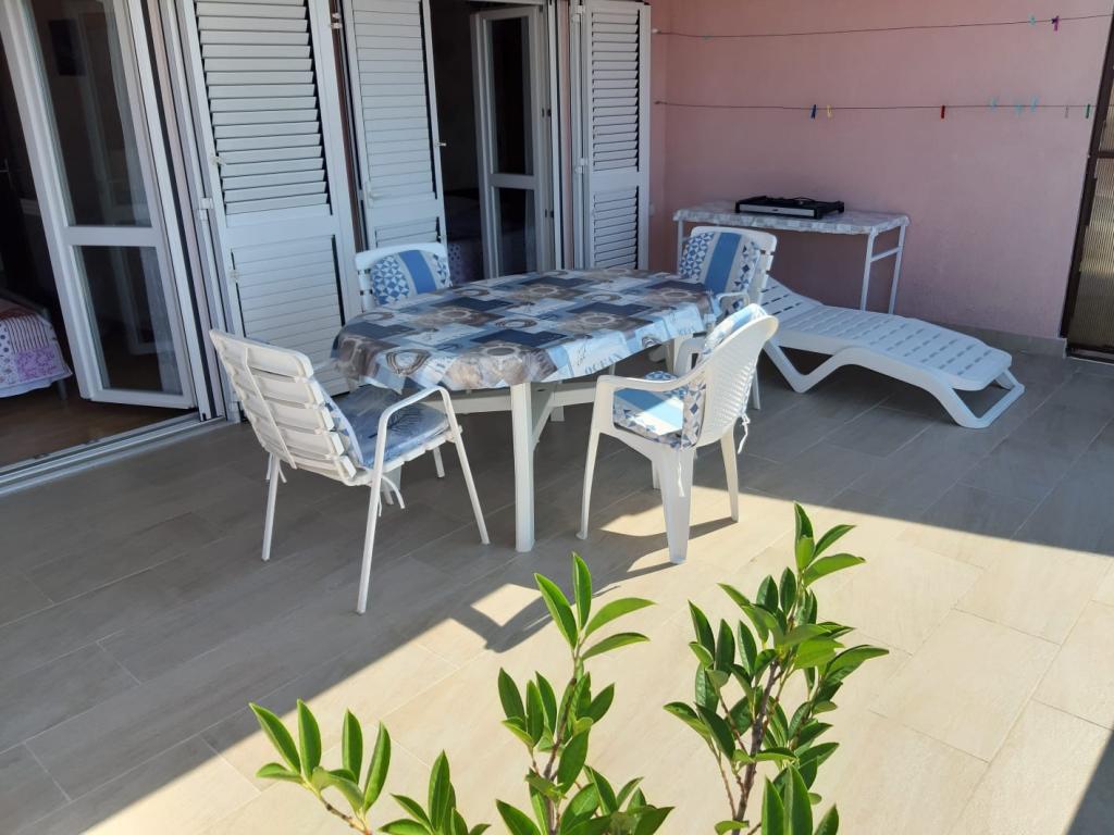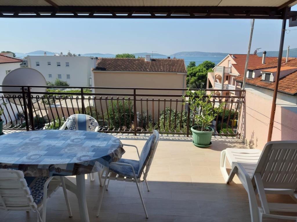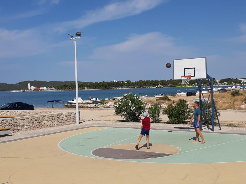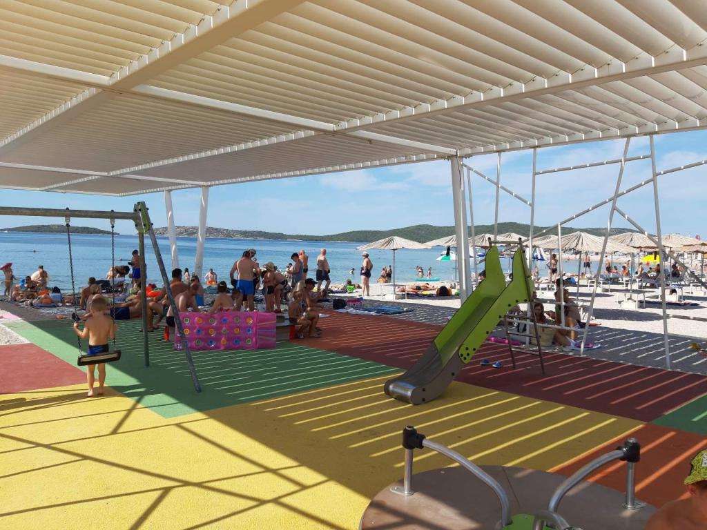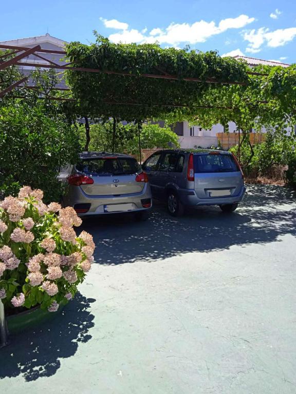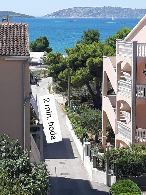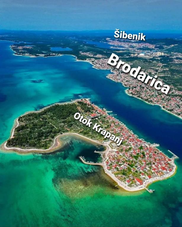 Apartmani se nalaze u mirnom dijelu Brodarice, udaljenom 150m (2 min. hoda ravnom ulicom bez strmina) do glavne šljunčane plaže, uz koju se nalaze još puno manjih šljunčanih plaža za više privatnosti. Kuća je okružena zelenilom i cvijećem, te ima besplatan parking u hladovini za goste. Apartmani su klimatizirani, svaka soba ima vlastitu kupaonicu, imaju veliku terasu/balkon s pogledom na more i otoke, opremljene kuhinje, perilice posuđa, mikrovalnu pećnicu, roštilj, grijač vode, wi-fi, besplatan parking. Vrata i prozori su zaštićeni komarnicima. 100m od apartmana je najbliža trgovina, pekarnica, fast food, kafići. Veliki trgovački centri prehrane, odjeće, obuće i sl. se nalaze 2 km od apartmana. Na plaži je igralište za djecu u hladovini, odbojka na pijesku, košarka, sprave za vježbanje na otvorenom, toaleti, tuševi, jet-ski, najam brodova. Apartman za 4 osobe ima 2 spavaće sobe, 2 kupaonice, kuhinju, veliku terasu s pogledom na more i otoke. Na terasi su ležaljke i roštilj.