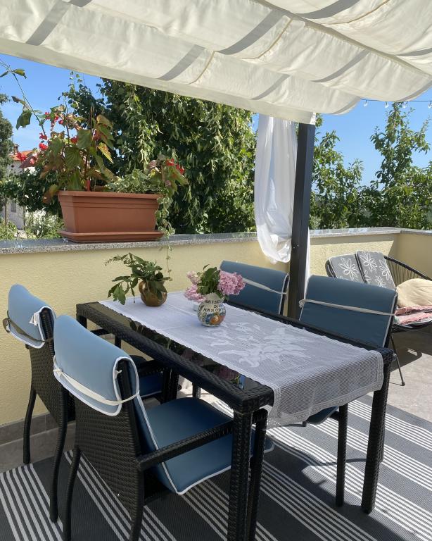 Sve je bilo savršeno. Domaćin nas je srdačno dočekao i sve nam objasnio. Uvijek je bio voljan odgovoriti na sva pitanja i dati nam savjete, ali nikada nije bio napadan. Stan se nalazi u mirnom dijelu na 2.katu. Apartman ima veliku terasu s pogledom na more i opremljen je svime što vam je potrebno. Bilo je čak i kave, mlijeka, šećera i čaja dostupnih za doručak. Voće smo dobili i iz vlastitog vrta. Veliko hvala paru domaćina na njihovom velikodušnom gostoprimstvu. U selu postoji nekoliko vrlo dobrih restorana, nekoliko barova/kafića, pekara, mesnica i 2 mala supermarketa, kao i agroturizam s dobrom hranom. Turističke informacije su također iza ugla, sve je na pješačkoj udaljenosti. Vratili bismo se.