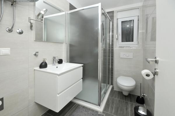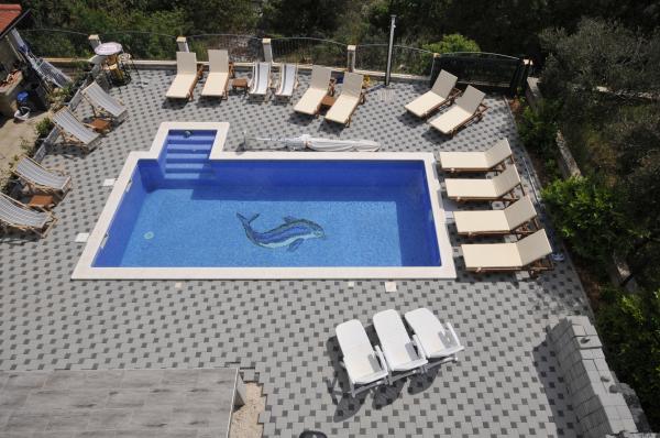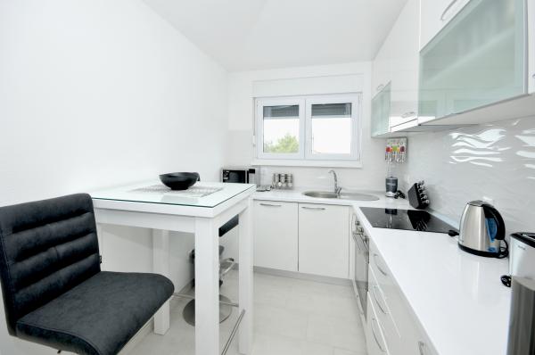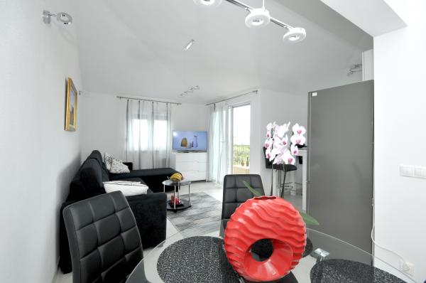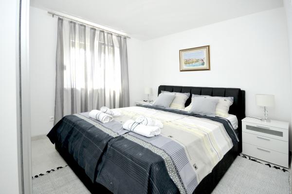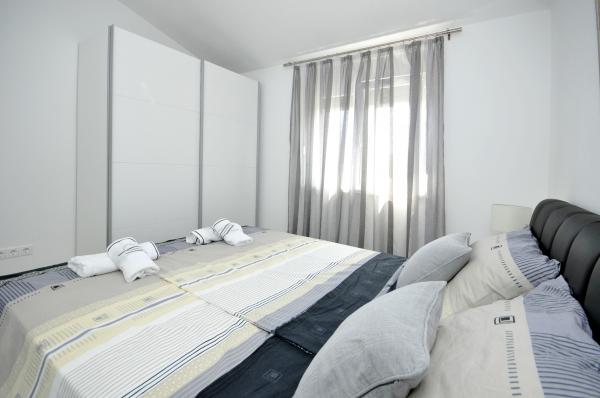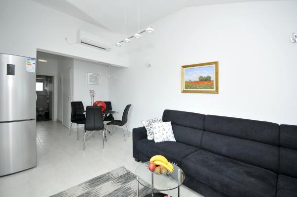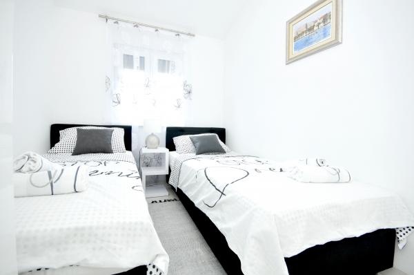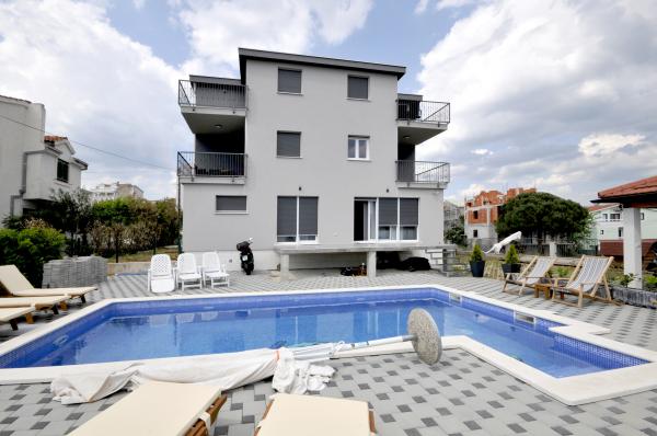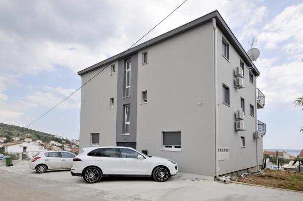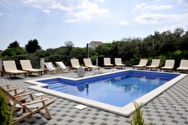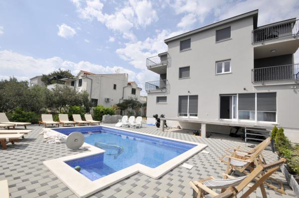 Novi, moderno opremljen dvosobni apartman s bazenom smješten na južnoj strani otoka Čiovo. s prekrasnim pogledom na okolne otoke:Brač, Hvar i Šoltu. Sadrži sve pogodnosti kako biste svoj odmor proveli što ugodnije i osjećali se kao kod svoje kuće. Smješten u mirnoj ulici, svega 350m od najljepših šljunčanih plaža na otoku. U neposrednoj blizini trgovina i restorana sa vrhunskim lokalnim specijalitetima. 4 km udaljen od starog grada Trogira bisera UNESCO baštine. Novi, nekorišten apartman površine 50m2, maksimalno funkcionalno i estetski uredjen. Opremljen sa svim dodacima za što ugodniji boravak. Privatni parking, korištenje bazena i roštilja su na raspolaganju našim gostima. 300 m udaljen od plaža, ronilačkog centra Trogir i aqua parka.