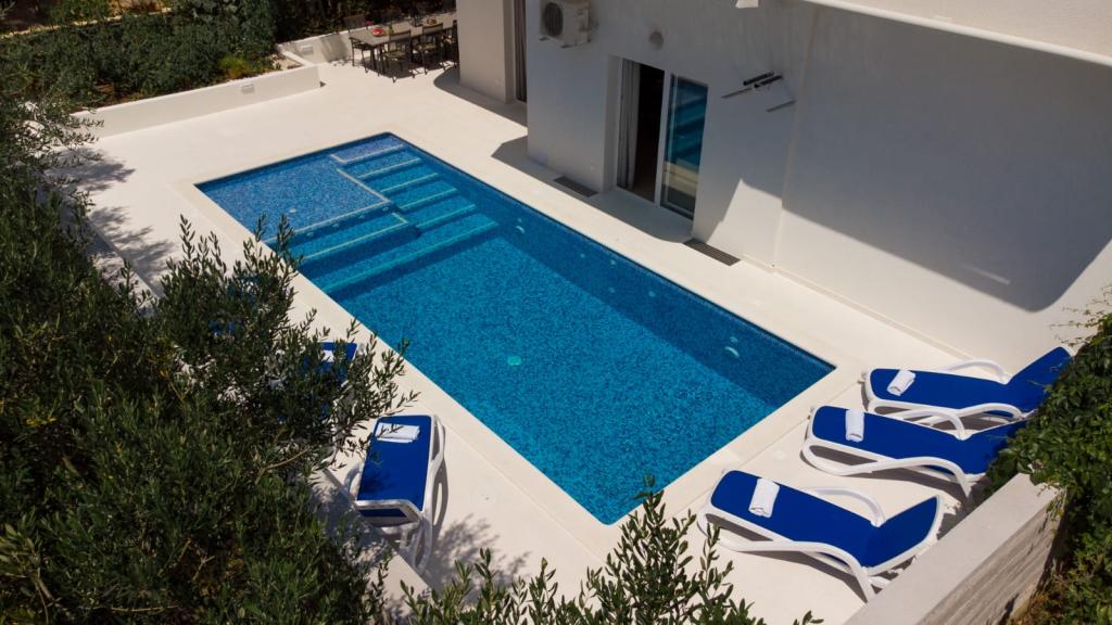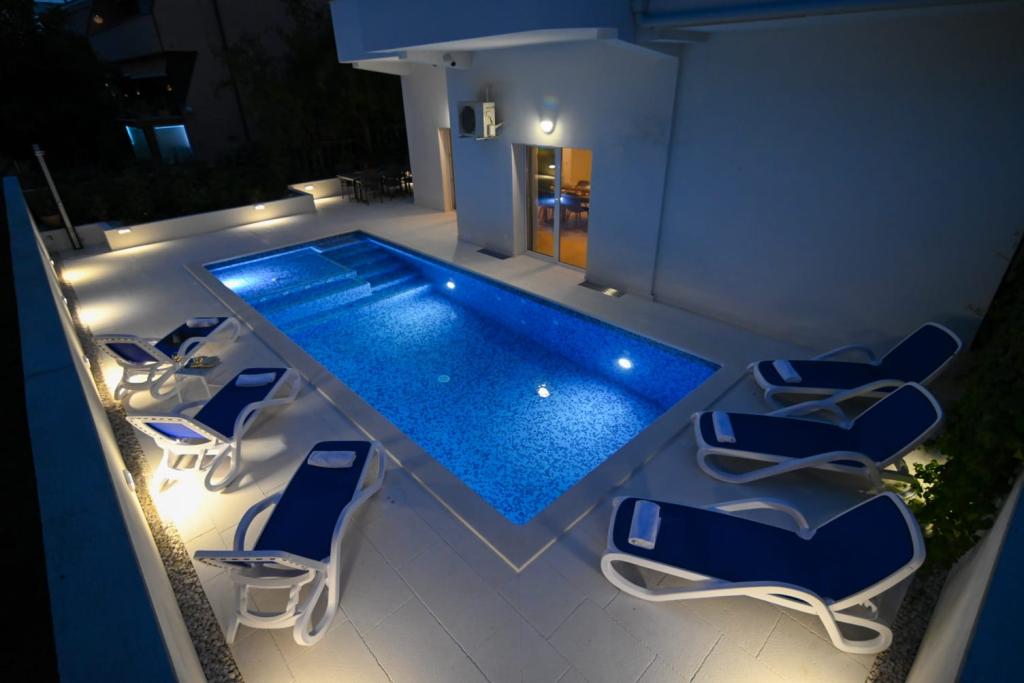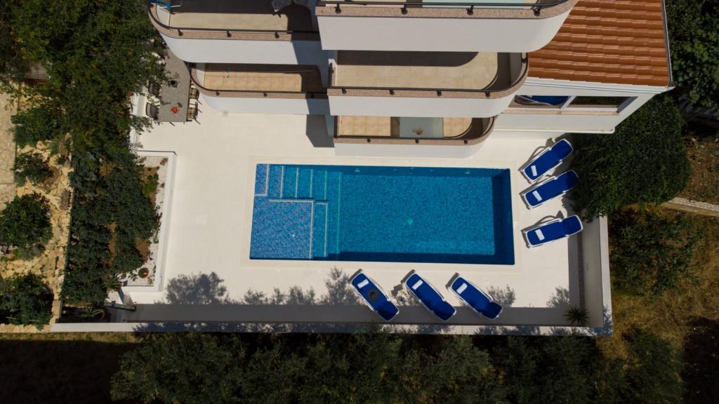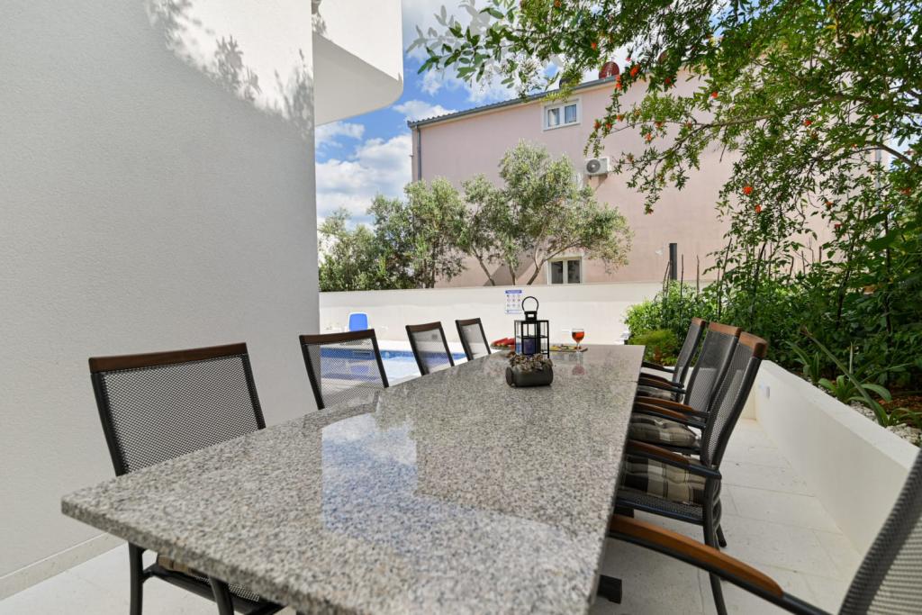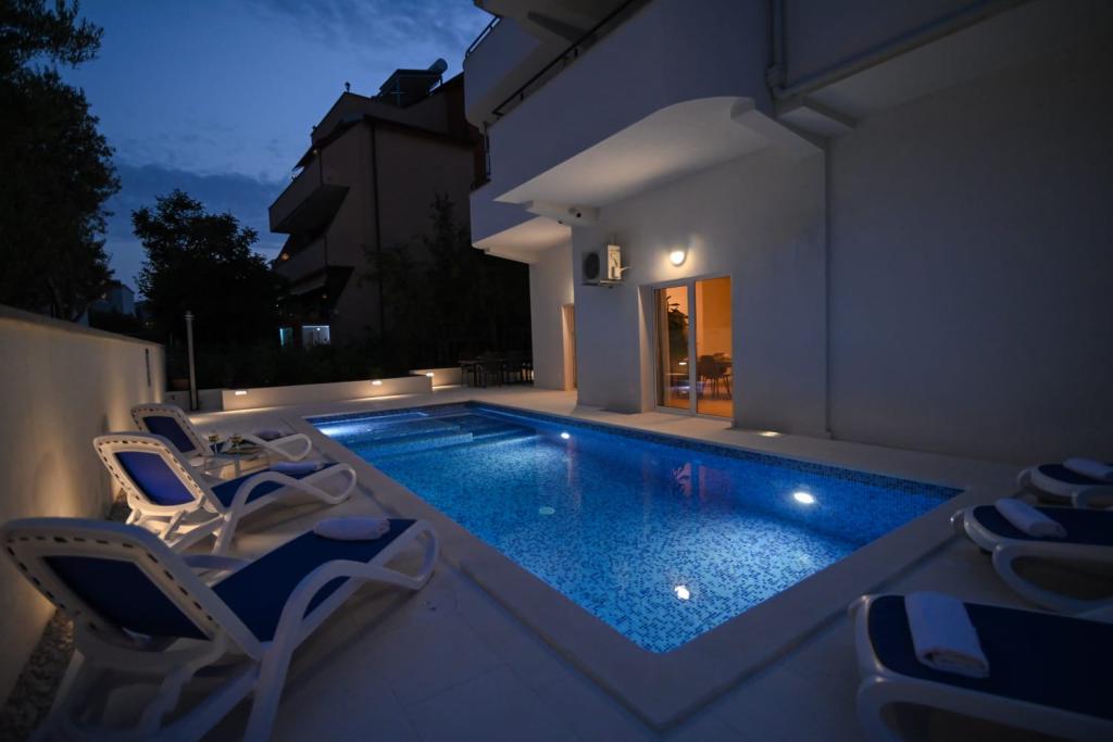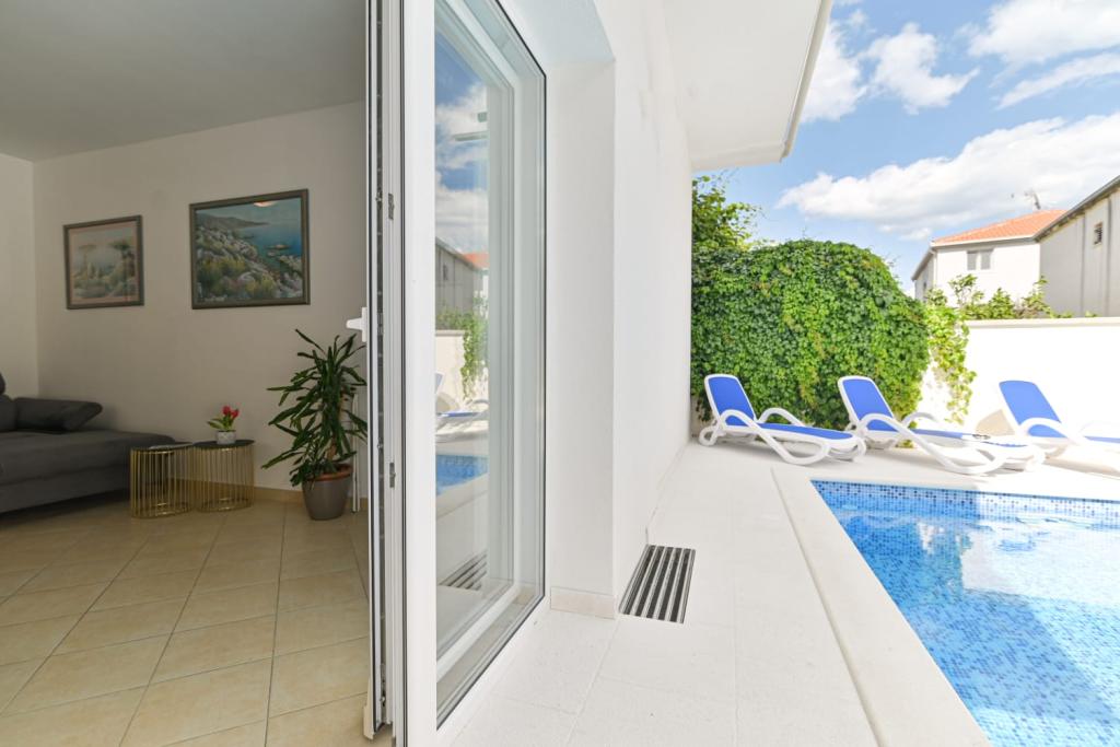 Na južnoj strani otoka Čiova ,kojeg dva mosta povezuju s starim i povijesnim gradom Trogirom i kopnom,200 m od kristalno čistog mora i plaze nudimo Vam kompletno opremljen apartman s privatnim bazenom. Apartman s dvije spavace sobe se nalazi u prizemlju,ispred je privatni bazen te gril. U sklopu objekta je osiguran parking .