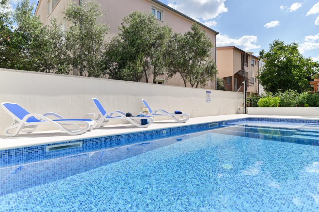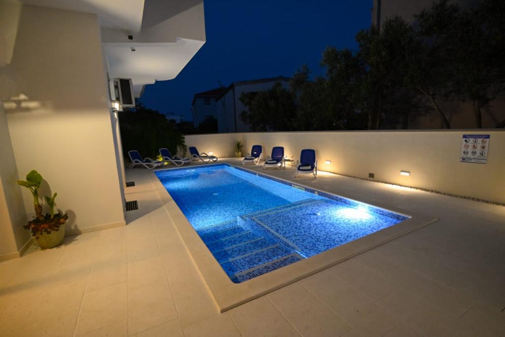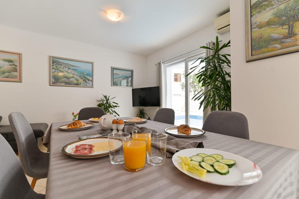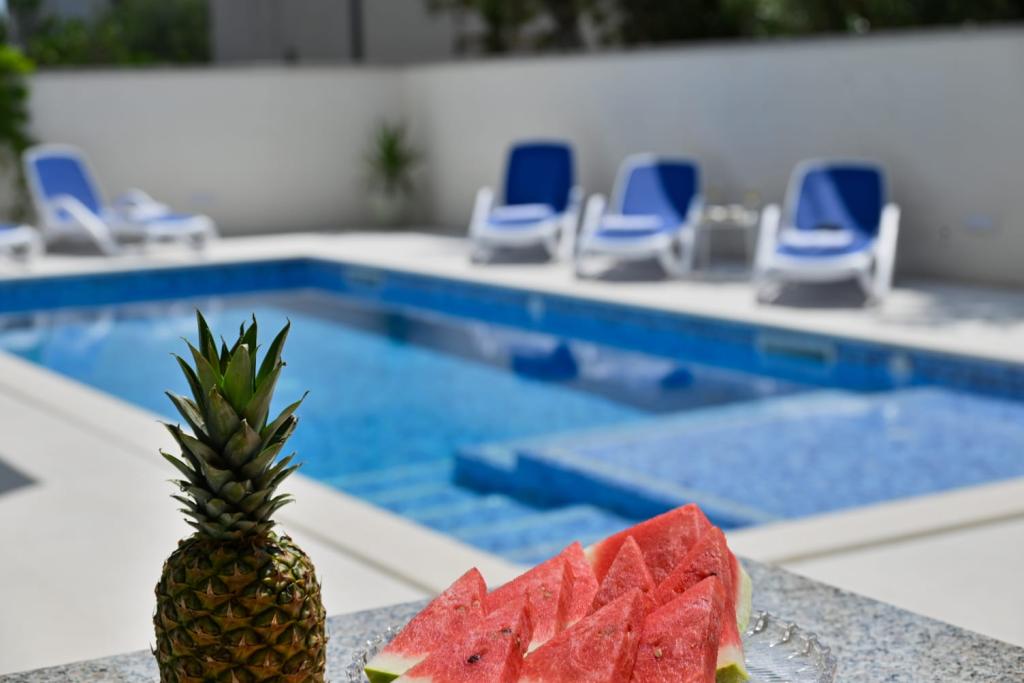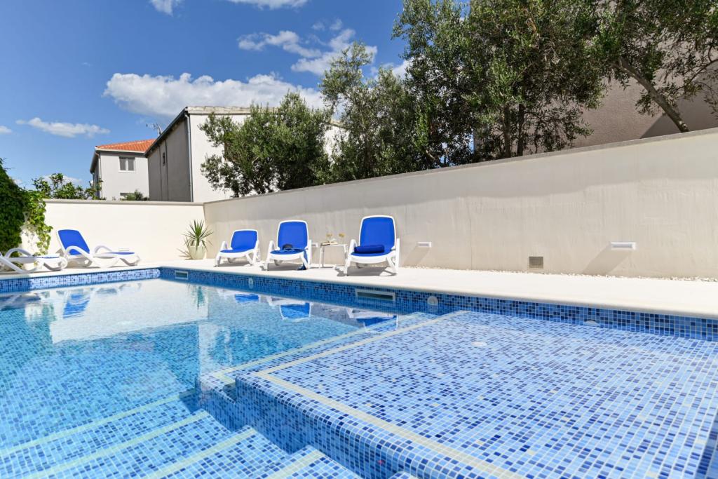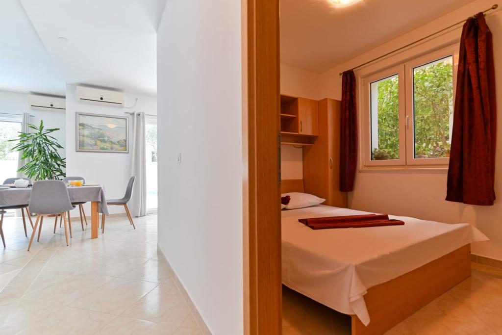 Na južnoj strani otoka Čiova ,kojeg dva mosta povezuju s starim i povijesnim gradom Trogirom i kopnom,200 m od kristalno čistog mora i plaze nudimo Vam kompletno opremljen apartman s privatnim bazenom. Apartman s dvije spavace sobe se nalazi u prizemlju,ispred je privatni bazen te gril. U sklopu objekta je osiguran parking .