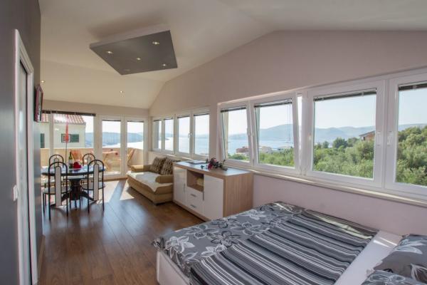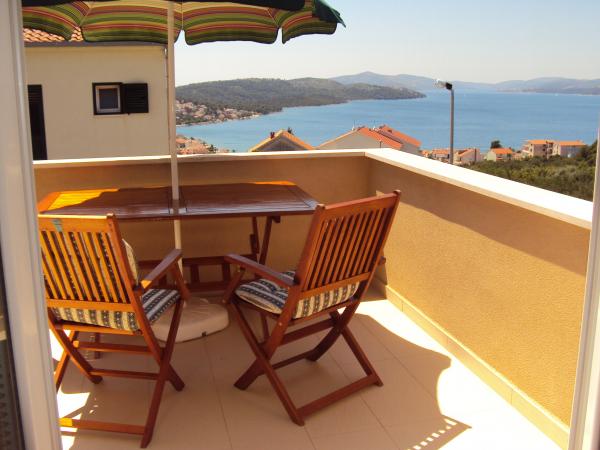 Odabrali smo ovaj studio jer nam ga je preporučio prijatelj. I bila je to sjajna odluka. Domaćini su bili jako ljubazni i uslužni. Studio vrlo čist i dobro održavan. Osim toga, opremljen je svime što vam je potrebno na odmoru. Osim toga, tu je bila terasa s prekrasnim pogledom koji je bio zapanjujući i danju i noću. Po dolasku u frižideru nas je čekalo lijepo iznenađenje, što nije baš svakidašnja pojava. Savršeno mjesto. 10-15 minuta hoda do brojnih restorana i glavne plaže, ali i blizu ostalih prekrasnih plaža kojih na otoku ima u izobilju. 40 minuta hoda do prekrasnog Trogira. Preporučamo ga mirne savjesti i rado ćemo se odmah vratiti Zagrljaj cijeloj obitelji
