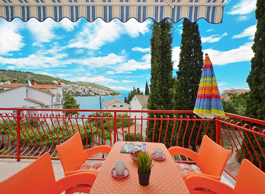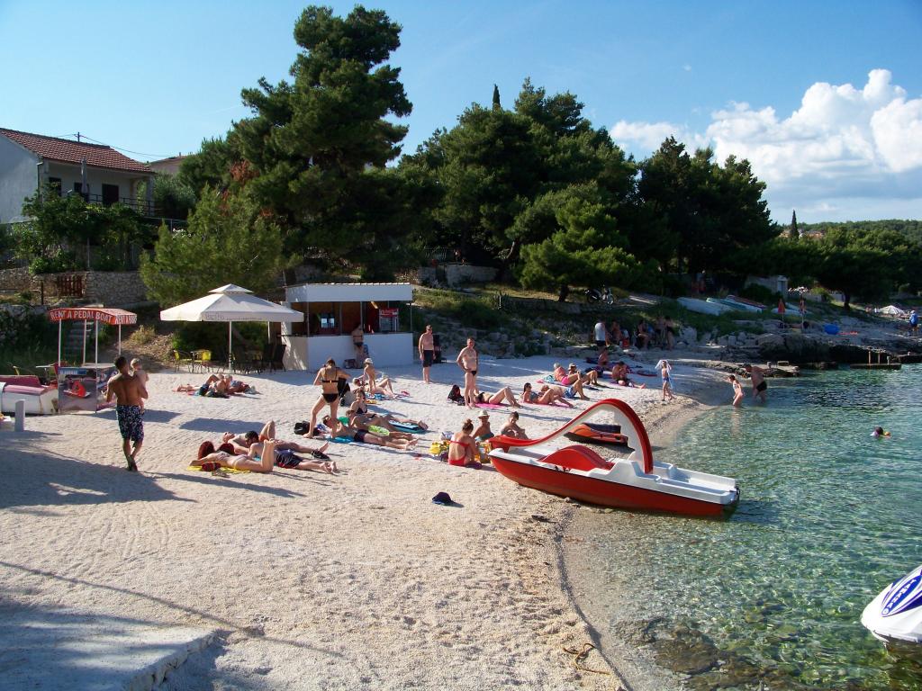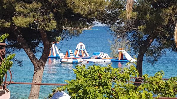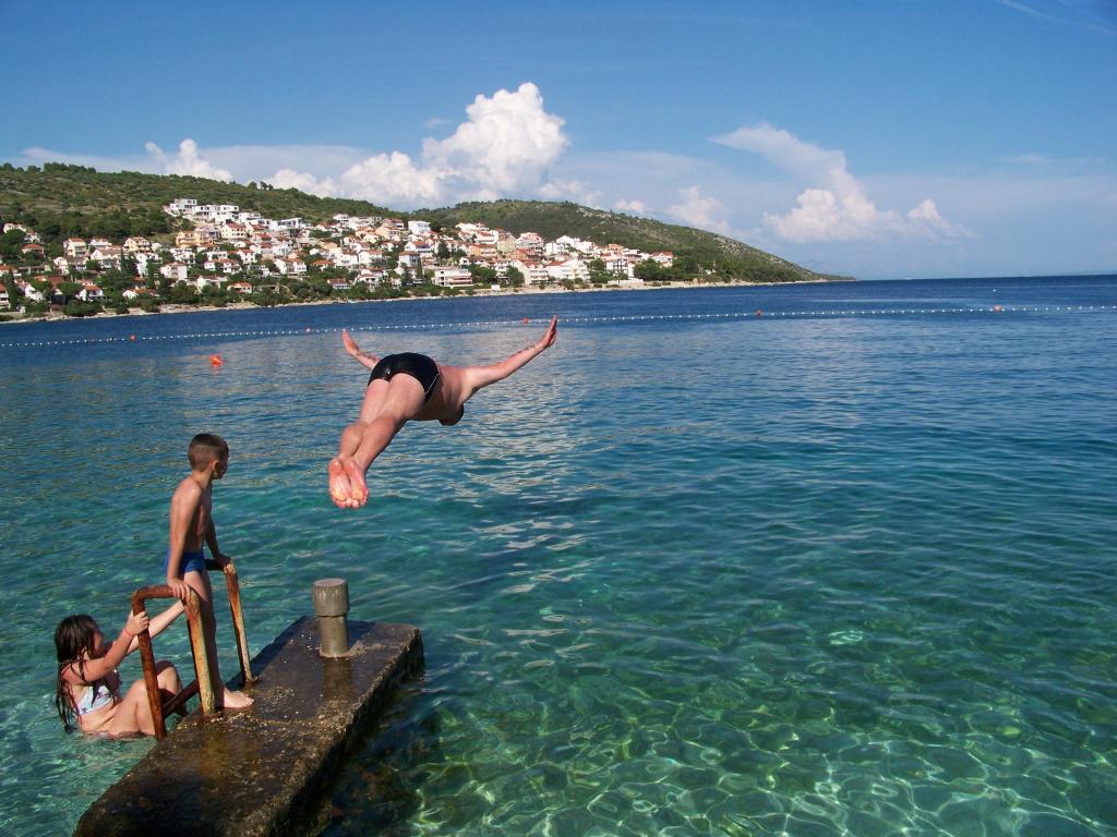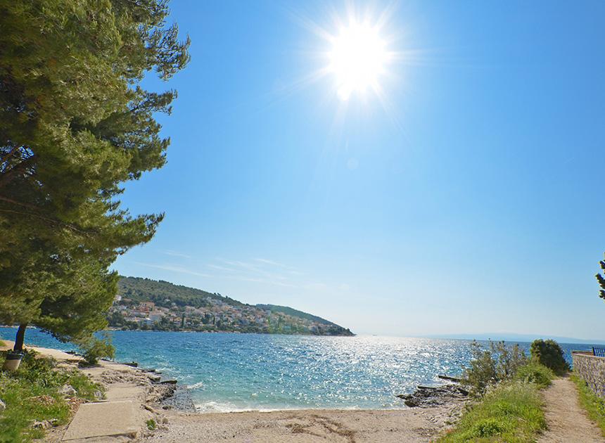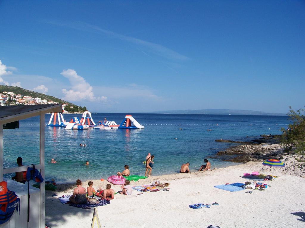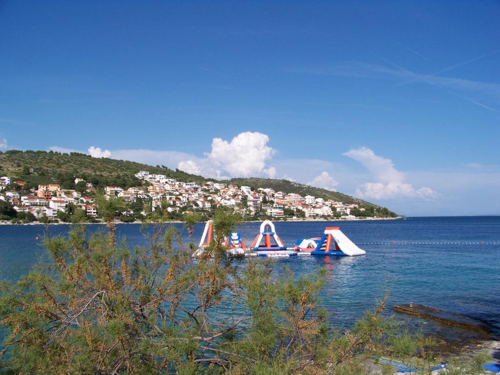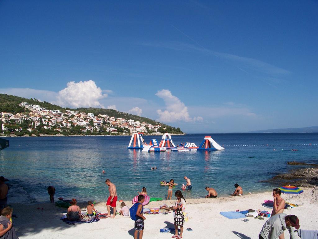 Čiovo, južna strana, uvala Mavarštica, iznajmljujemo nove apartmane za 3-4 osobe, SAT LED Samsung TV 32 (82 cm), DVD, Microwave, Blender, Air Condition, Wi-fi brzi optički internet. Svi apartmani imaju svoje parkirna mjesta u sjeni, grill, udaljeni su samo 50 m od plaže (na slici), primjereno i za manju djecu. Apartmani su udaljeni 4. km od Trogira, grada spomenika pod zaštitom UNESCA. Svi apartmani imaju veliku terasu s pogledom na more i još jedan balkon u spavaćoj sobi. Udaljenost do najbližeg restorana je 70 m. Udaljenost do aqua parka je 100 m. Udaljenost do najbliže trgovine je samo 400 m. Do najbliže ljekarne, bankomata, velikog supermarketa, tržnice i bankomata je 900 m. Na raspolaganju su vam besplatno: vrtna ljuljačka, velika dječja drvena ljuljačka, dodatni vrtni tuš, klupa pored roštilja, suncobran za terasu. Gosti imaju u dvorištu na raspolaganju Sponeta stol za stolni tenis sa setom reketa i elektronski pikado. Na Smart TV je moguće praćenje poljskih, njemačkih, engleskih, francuskih, španjolskih, talijanskih... free to air SAT programa te je također instalirana aplikacija GoNet TV (Lepša TV) koja omogućuje gostima praćenje slovenskih, čeških, slovačkih, madžarskih i ukrajinskih programa.
