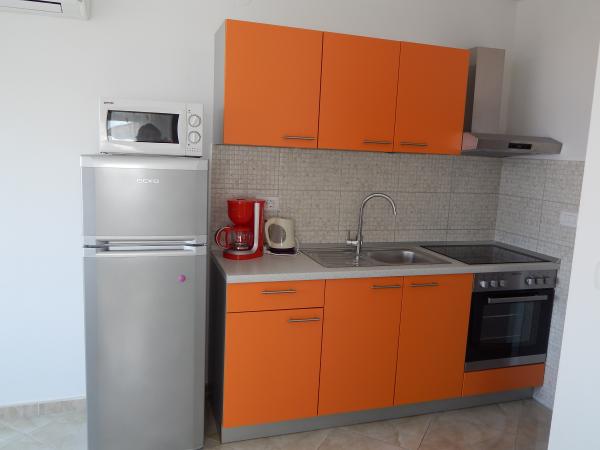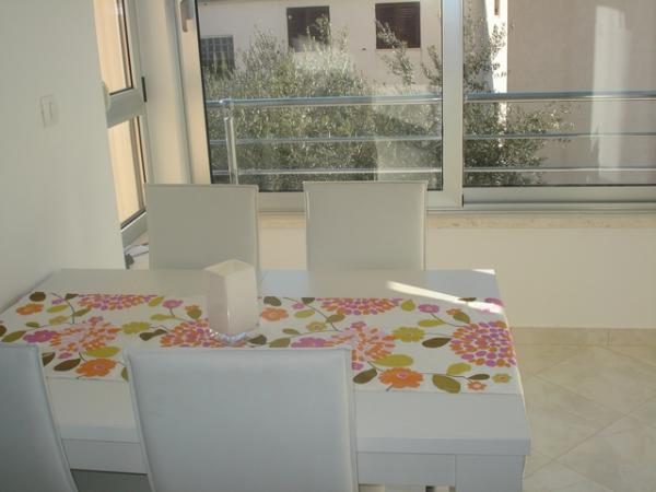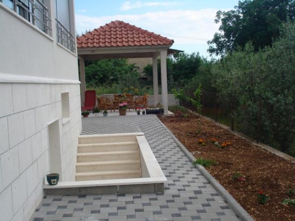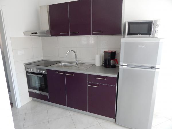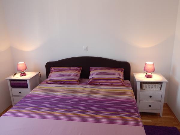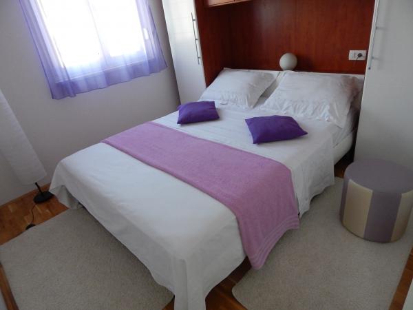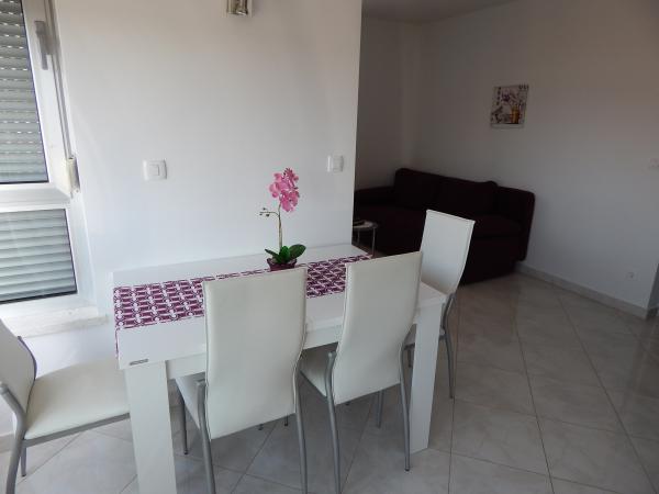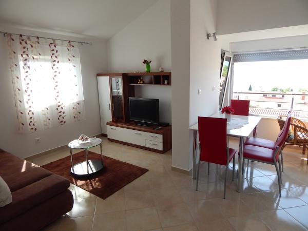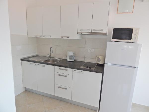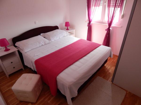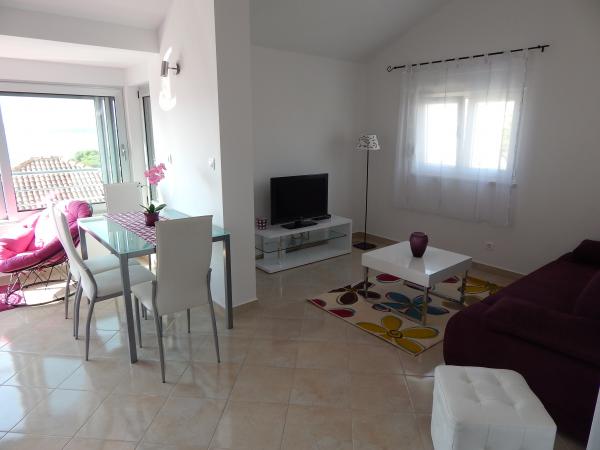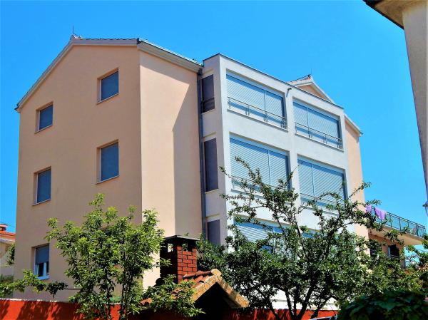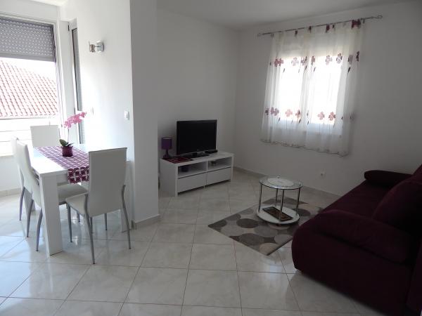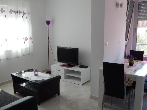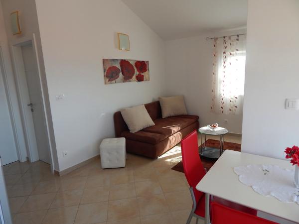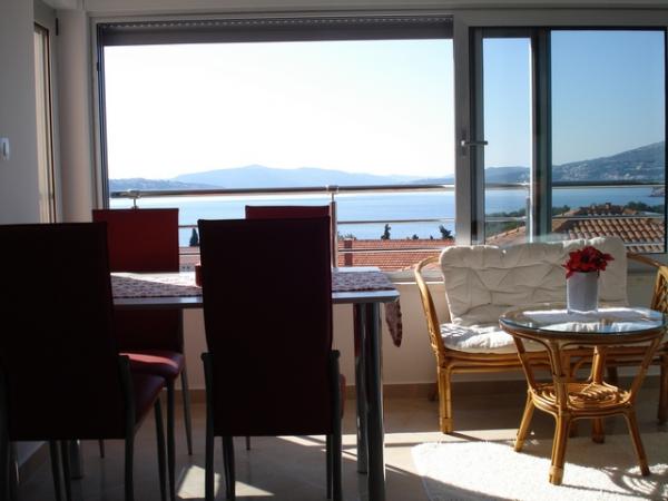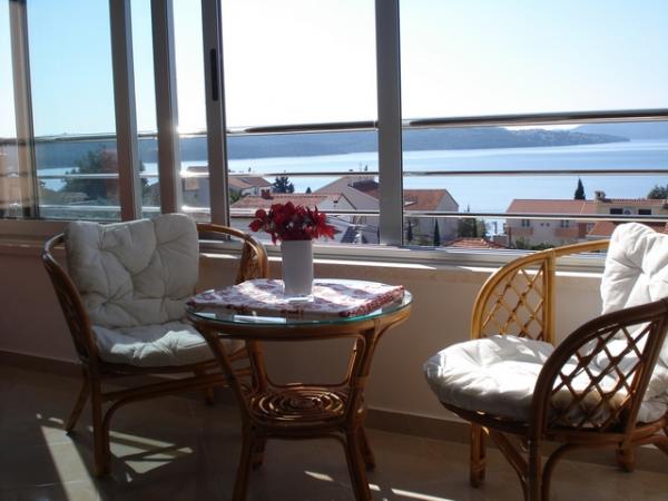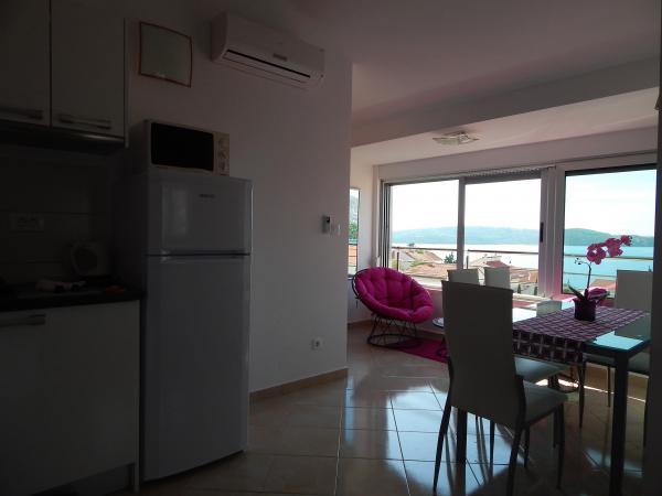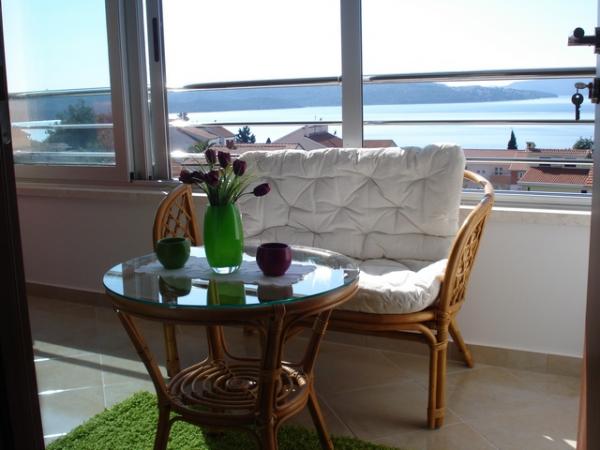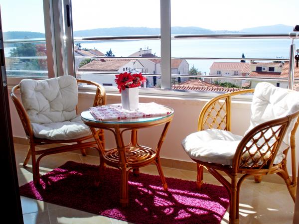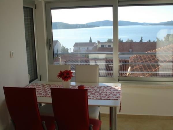 Novi, klimatizirani, moderno uređeni i kompletno opremljeni apartmani s pogledom na more udaljeni samo 80 m od mora i najbliže plaže. Svi apartmani imaju besplatan pristup internetu ( WiFi), LCD TV sa satelitskim programima. Smješteni su u Okrugu Gornjem, udaljeni od centra povijesnog grada Trogira 1. 5 km. Apartmani su za 2-4 osobe s jednom spavaćom sobom i kaučem na razvlačenje, opremljenom kuhinjom( štednjak, pećnica, hladnjak, aparat za kavu, kuhalo za vodu), dnevnim boravkom, kupaonicom i ostakljenim balkonom. Gosti se mogu koristiti zajedničkom perilicom rublja. Ispred objekta je besplatan parking i roštilj. Najbliži restoran i trgovina su udaljeni 100m. Barovi su udaljeni 250m.