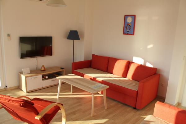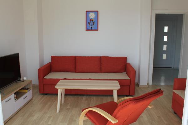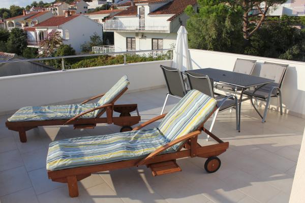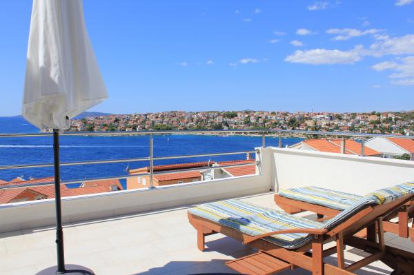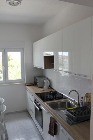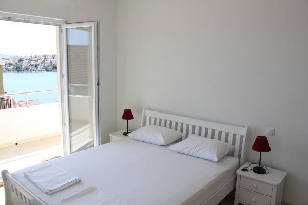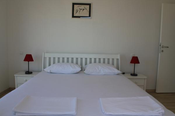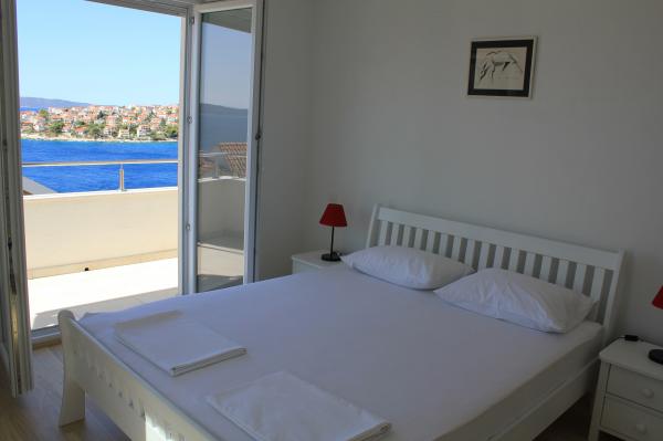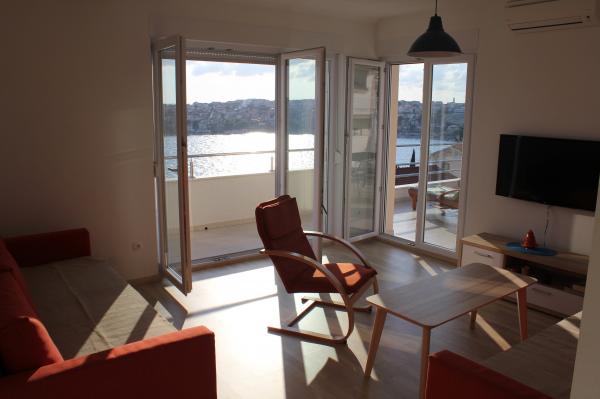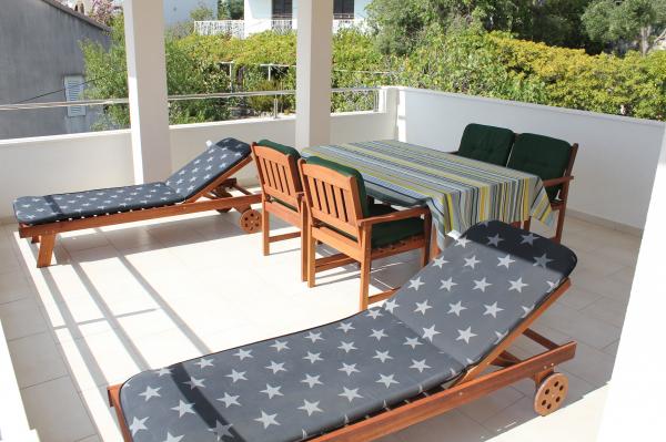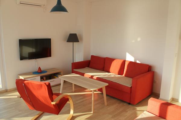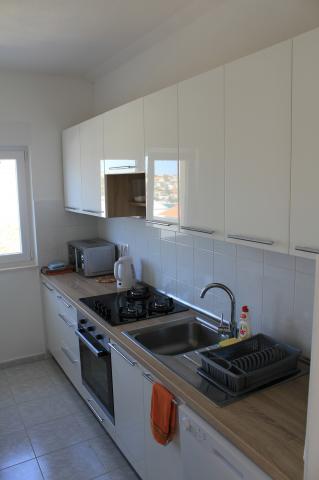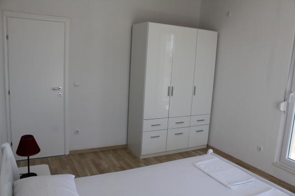 Apartmani juzne orijentacije prigodni, kako individulanim posjetiteljima, tako i parovima i manjim grupama i porodicama (4-5 osoba). Apartmani su novogradnja i opremljeni su modernim i kvalitetnim materijalima i uredjajima. Iz hodnika su dostupne kuhinja, dnevni boravak, spavaca soba, kupatilo. Apartmani su prozracni i puni svjetla u svim prostorijama sa mogucnoscu zatamljenja putem roleti. Unutarnji prostor (56m2) upotpunjuje dodatnih 35m2 terase i balkona, koji su dostupni iz dnevne i spavace sobe. S njih se proteze prelijep pogled na more, koje je udaljeno 120m. Apartman je opremljen sa 43' TV, WiFi, perilicom sudja, keramickom plocom za kuhanje i rernom, hladnjakom, Nespresso aparatom za kavu, mikrovalnom. Za udoban san, kreveti su opremljeni dzepicastim madracima i dimenzija su 160x200cm, te kvalitetnom posteljinom. 2 sofe na razvlacenje (140x200cm) u dnevnom boravku. Parking mjesto. Perilica rublja.