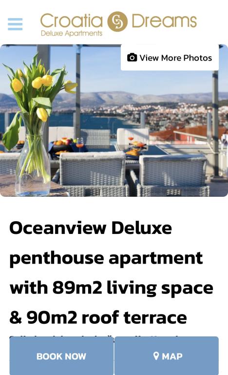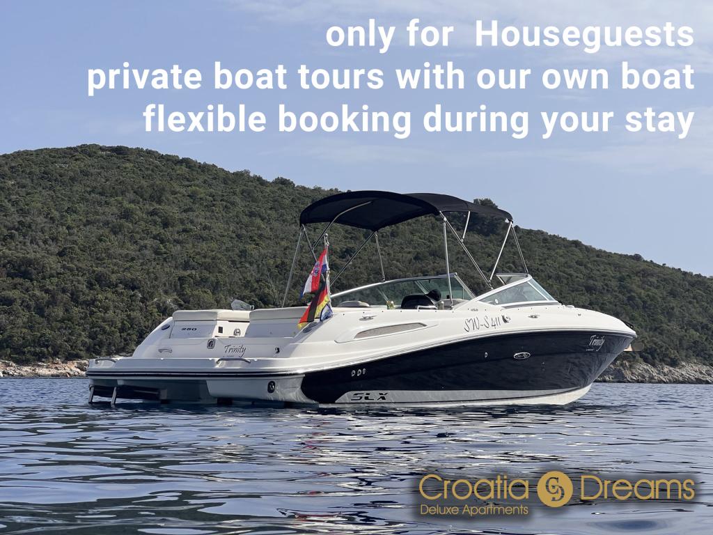 Dobrodošli u Croatia Dreams! Nudimo delux apartmane ovdje na prekrasnom otoku Čiovu (Trogir). U blizini se nalaze 2 luksuzna apartmana, tako da možete rezervirati idealnu kombinaciju za odmor za 2/3 obitelji i/ili do 12 osoba. U apartmanima imamo bazen i vanjsku kuhinju s roštiljem, kao i razni namještaj za dnevni boravak, glazbu i e-skutere za iznajmljivanje – nijedna želja ovdje ne ostaje neostvarena. Nudimo prijevoz od zračne luke, organizaciju najma automobila/čamaca/vodenih sportova. Više možete saznati na www.croatia-dreams.com i rezervirati izravno kod njemačkog vlasnika. Napominjemo da su naši apartmani luksuzno opremljeni priborom i opremom (glazbeni sustav, Playstation itd.), pa je potreban depozit