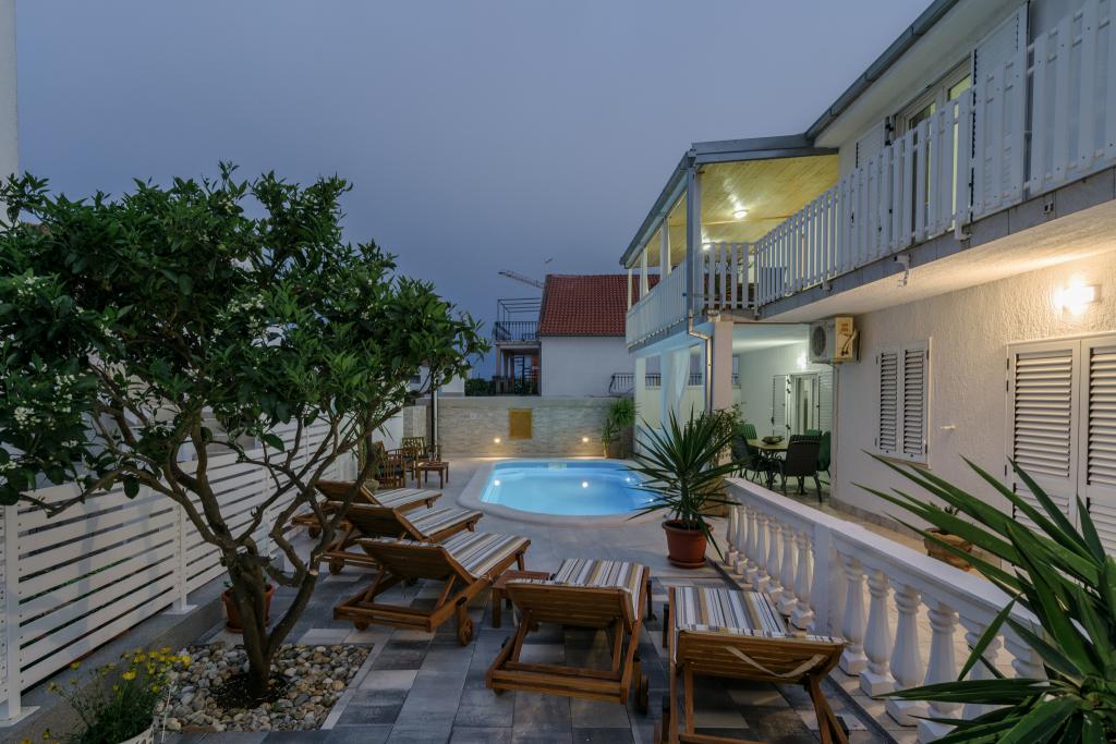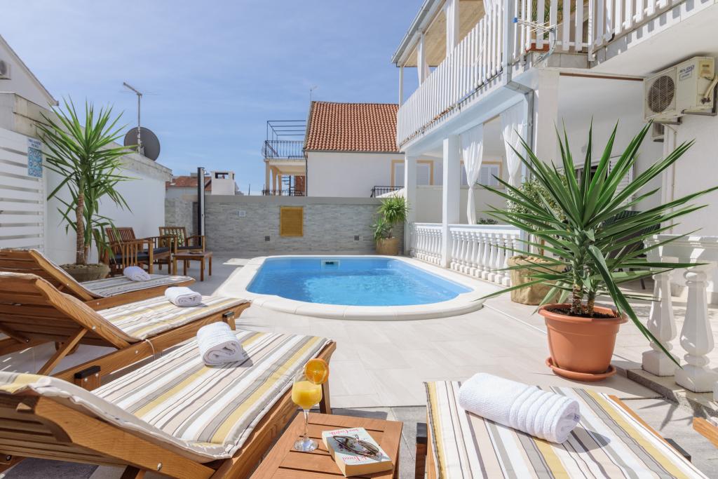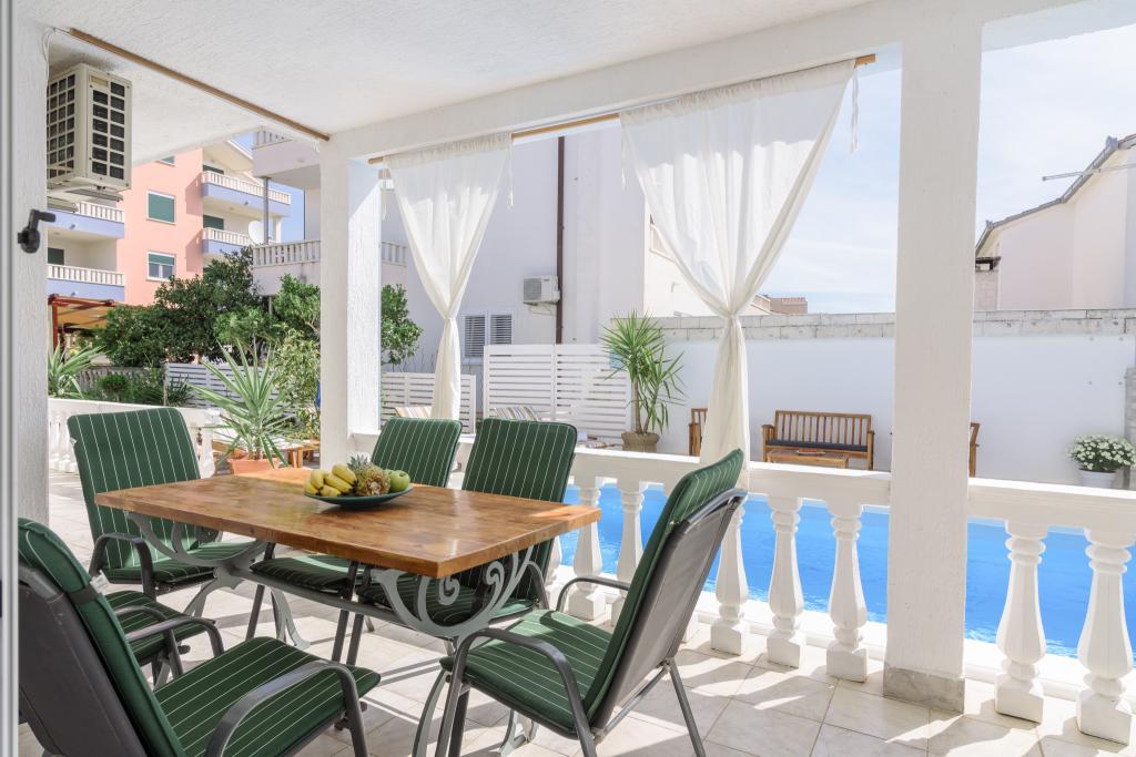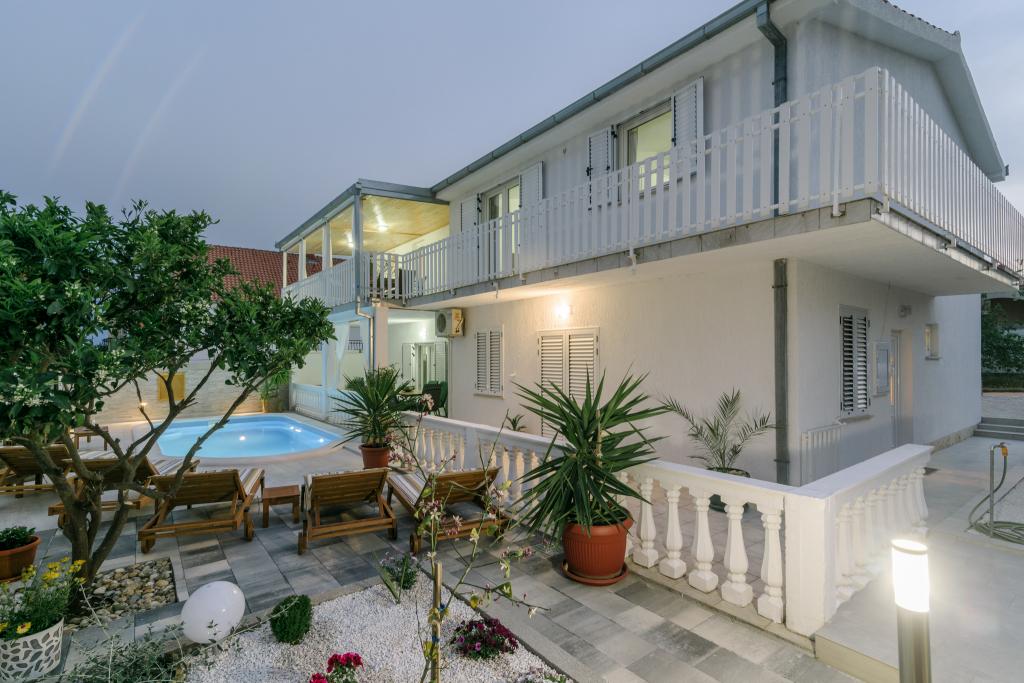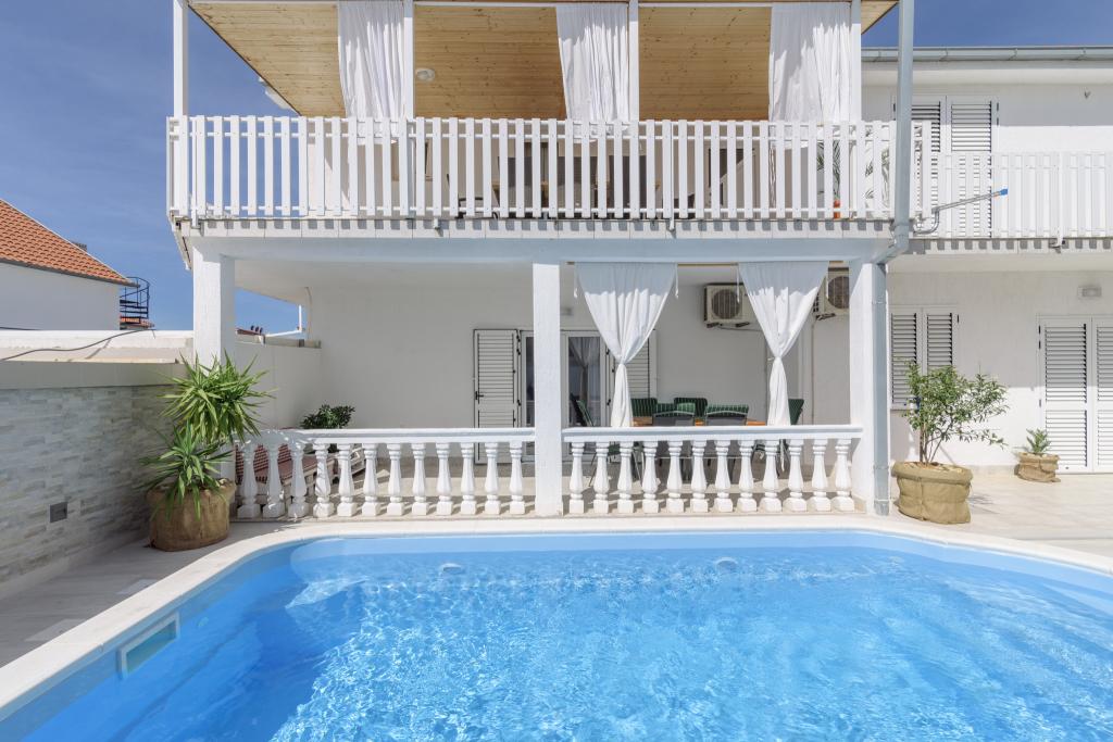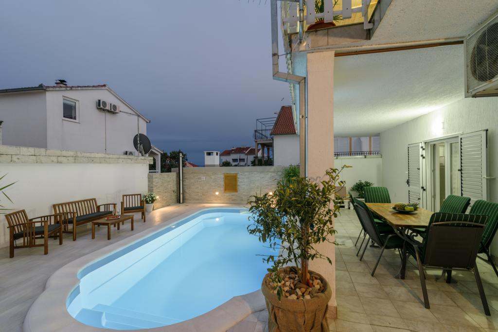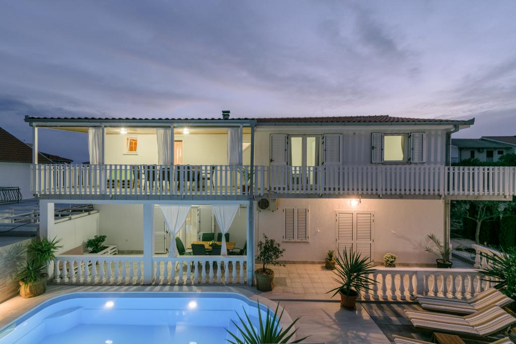 Ovo je obiteljska kuca sa bazenom , smjestena u mirnom dijelu Okruga Gornjeg , u blizini plaze , restorana , kao i samog centra Okruga Gornjeg Nudimo dva apartmana za 4 i 6 osoba, sa osiguranim parkingom za sve goste Apartman ID:26110 nalazi se na katu, sastoji se od 3 sobe, kupaone, dnevnog boravka, kompletno opremljene kuhinje te velike terase s pogledom na more, apartman je pogodan za dvije obitelji Apartman ID:26111 nalazi se u prizemlju, sastoji se od 2 sobe, kupaone, dnevnog boravka, potpuno opremljene kuhinje te velike terase pored koje se nalazi bazen sa lezaljkama , te grill Apartmani su veliki i komforni te imaju velike terase Svi apartmani imaju perilicu rublja U blizini apartmana nalazi se mini market, restoran, sportski centar Mogucnost najma cijele kuce !