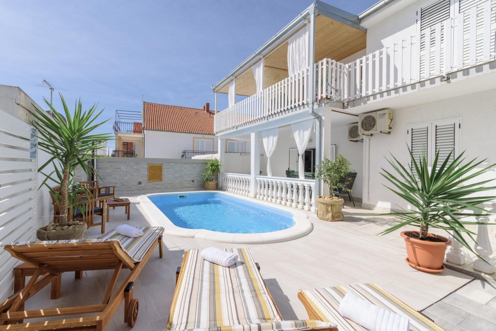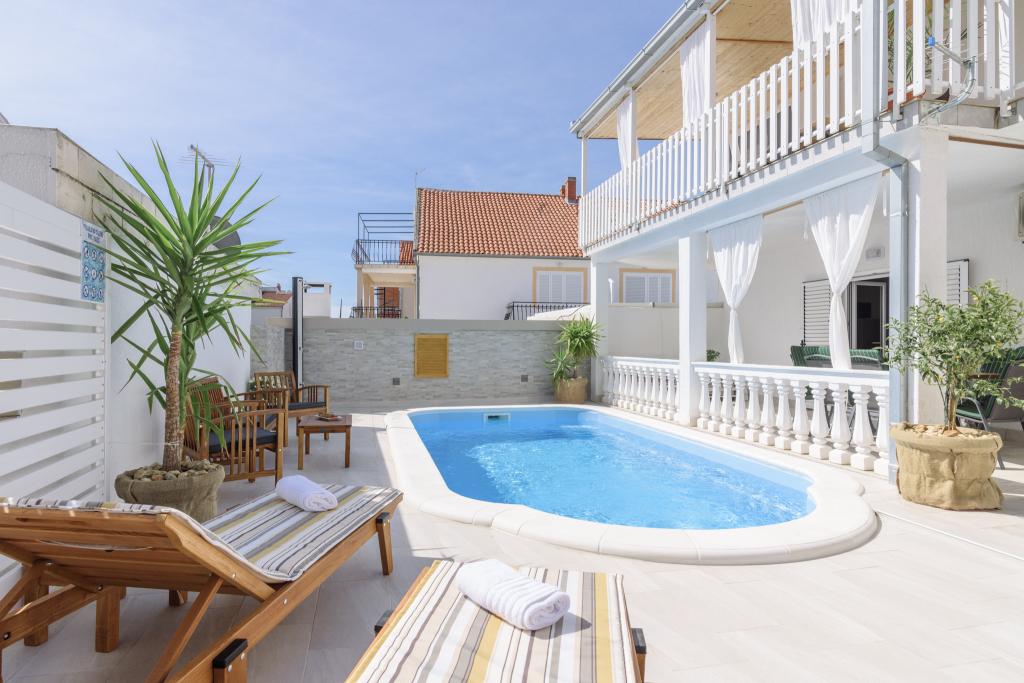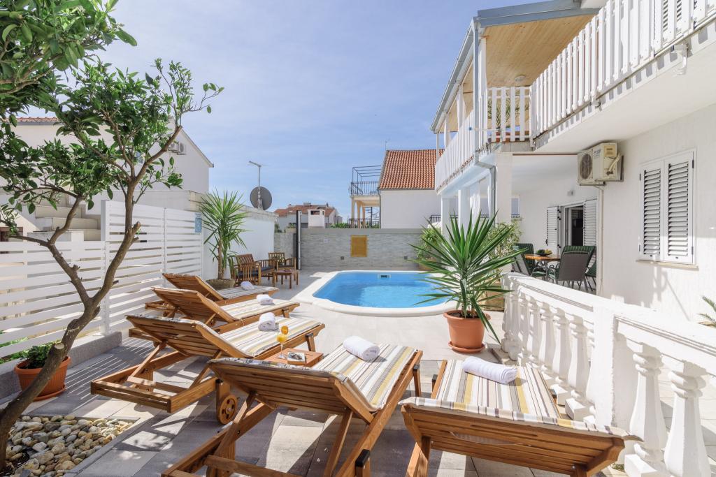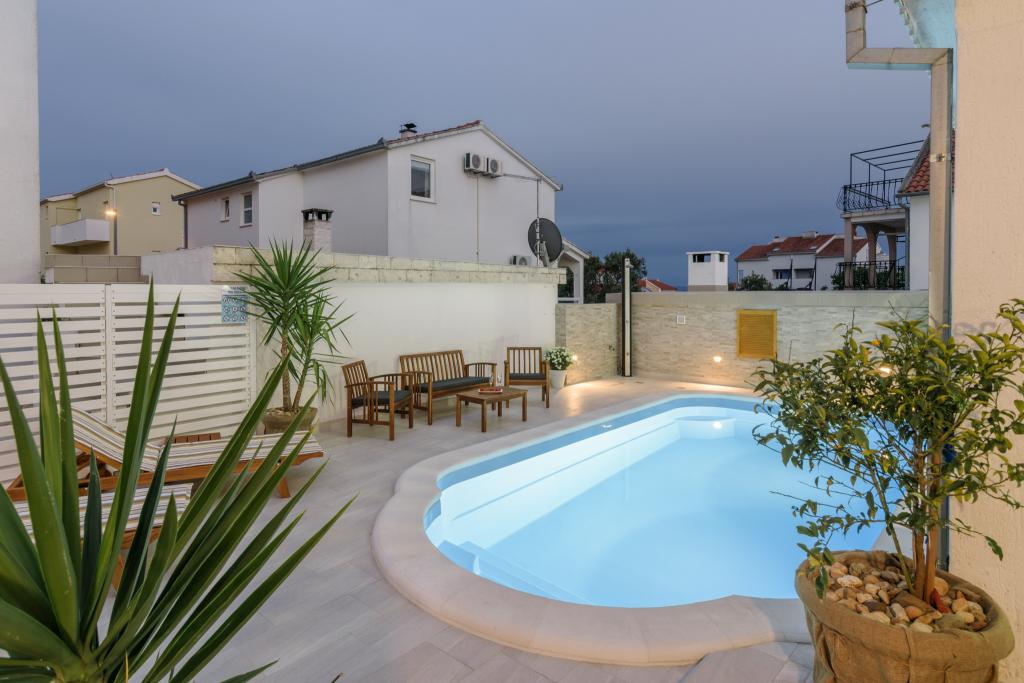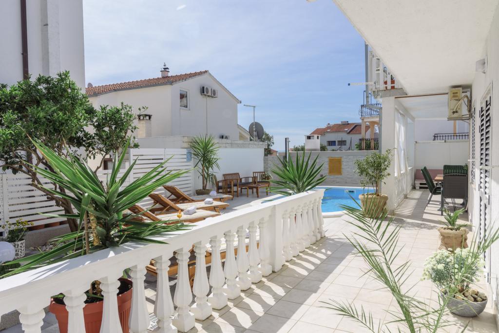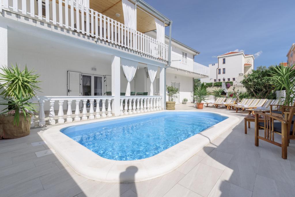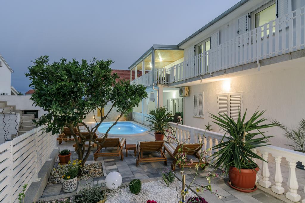 Ovo je obiteljska kuca sa bazenom , smjestena u mirnom dijelu Okruga Gornjeg , u blizini plaze , restorana , kao i samog centra Okruga Gornjeg Nudimo dva apartmana za 4 i 6 osoba, sa osiguranim parkingom za sve goste Apartman ID:26110 nalazi se na katu, sastoji se od 3 sobe, kupaone, dnevnog boravka, kompletno opremljene kuhinje te velike terase s pogledom na more, apartman je pogodan za dvije obitelji Apartman ID:26111 nalazi se u prizemlju, sastoji se od 2 sobe, kupaone, dnevnog boravka, potpuno opremljene kuhinje te velike terase pored koje se nalazi bazen sa lezaljkama , te grill Apartmani su veliki i komforni te imaju velike terase Svi apartmani imaju perilicu rublja U blizini apartmana nalazi se mini market, restoran, sportski centar Mogucnost najma cijele kuce !