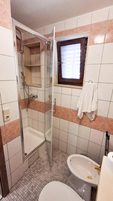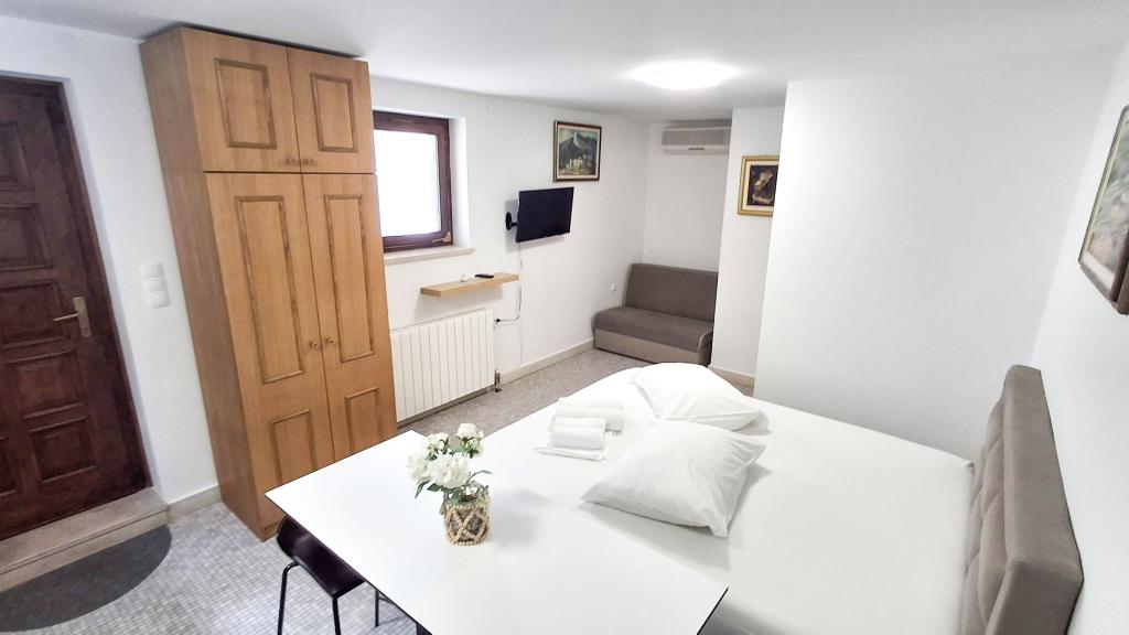 + prekrasan, veliki, dvosobni apartman oko 50 metara od plaže, velika terasa s pogledom na more, mini balkon, pergola s kaminom, soba s perilicom rublja i daskom za glačanje, privatni sušilo za kosu, ručnici, glačalo, sušilica rublja u sobi, potpuno opremljena kuhinja, veliko parkiralište uz kuću - zatamnjeno ogledalo u kupaonici zbog kojeg se nije bilo moguće vidjeti, nedostajalo nam je veliko ogledalo u hodniku, u jednoj spavaćoj sobi nije bilo klima uređaja