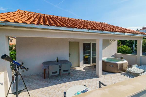 Ljetovali smo s dvoje male djece od 7.-10.7. 2017. u apartmanu A3. Apartman savršeno odgovara slikama i nadmašio je sva naša očekivanja u svakom pogledu. Ono što nas je posebno oduševilo je jacuzzi na ogromnoj terasi koja je također opremljena i teleskopom, zatim električni bicikli, kao i pristupačnost kako domaćina, tako i Tamare koja je zadužena za objekt. Također, apartman ima sve što je potrebno ua ugodan boravak, i boravak bez stresa s djecom. Od krevetića za bebe, aparata za kavu (i kave za aparat!!!), pećnice, tostera, sitnih stvarčica koje zaista znače (ulja, octa, soli, šećera, gela za tuširanje)...čak , konac i igle Dakle, što reći osim savršen domaćin i savršena opremljenost. Plaža je udaljena oko 90 m od apartmana. Pozitivno je što ima mali kafić, dovoljno plićaka za klince, aquapark, a opet nije gužva! Domaćin ima 100% preporuku od nas Osječana Tea