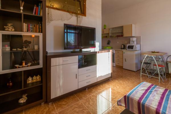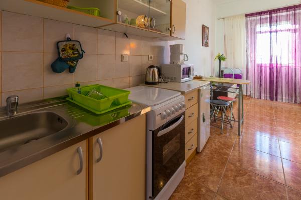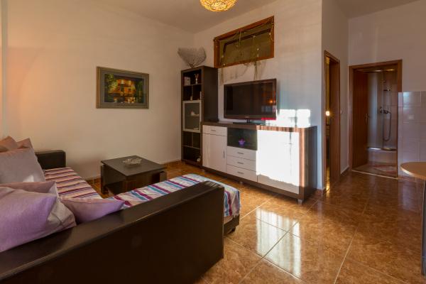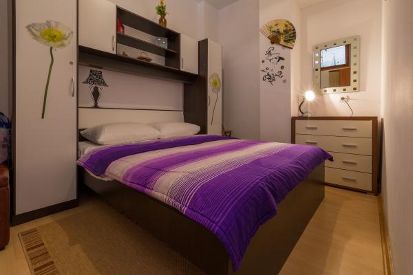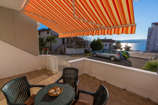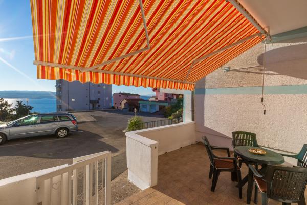 U stambenom naselju, na samom ulazu u Crikvenicu, 900m udaljen od centra grada i gradske buke, nalazi se mali apartman od 35m2. U blizini, 150m dalje, je mali market sa osnovnim namirnicama i higijenskim potrepštinama. Plaža je udaljena svega 400m, a nedaleko je i maleno igralište za djecu. Apartman je u prizemlju zgrade novijeg datuma, a cijelo naselje je na laganom uzvišenju tako da se s terase pruža djelomičan pogled na more i susjedni otok Krk. Terasa je natkrivena tendom na razvlačenje. Parkirno mjesto je osigurano. U spavaćoj sobi je bračni krevet. U dnevnom boravku se nalazi kutna garnitura na razvlačenje sa dva dodatna ležaja. U sklopu dnevnog boravka je i mala kuhinja sa svim potrebnim dodacima, uključujući i frižder mali zamrzivač, kuhinjski pribor, kuhalo za vodu, pećnicu i štednjak na struju, mikrovalnu pećnicu, kao i stol za blagovanje. U kupaoni se nalazi i perilica za rublje. Apartman je opremljen sa wi-fi, klima uređajem i Tv Sat.
