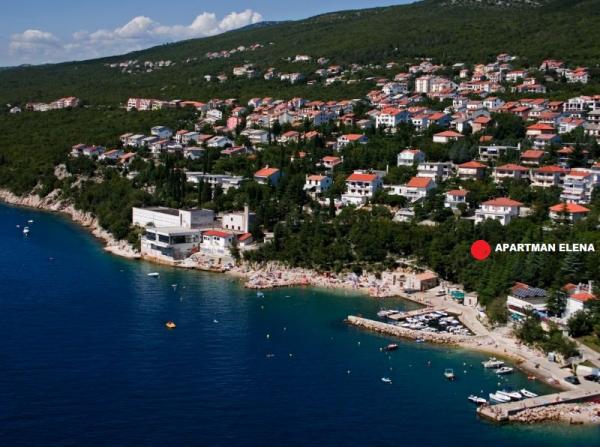 Apartman Elena sa pogledom na more se nalazi u malom mjestu Dramalj, 3km od centra grada Crikvenice. Smješten prvi red mora. U okolici 50m nalazi se plaža, restoran, market i caffe bar. Apartman: 3 spavaće sobe, kuhinja/blagovaonica, kupaonica, 2 balkona sa pogledom na more, terasa i vrt, parking, wi-fi, klima.