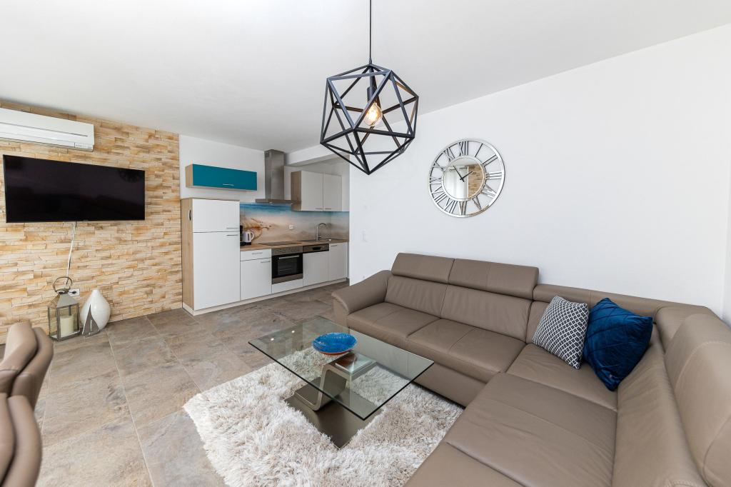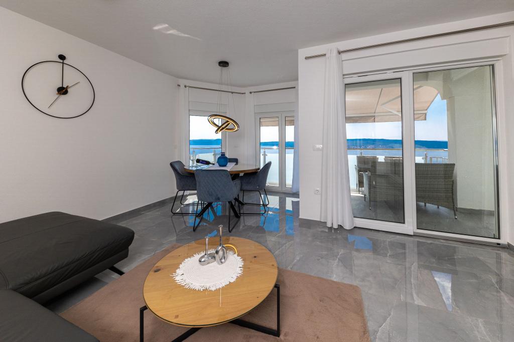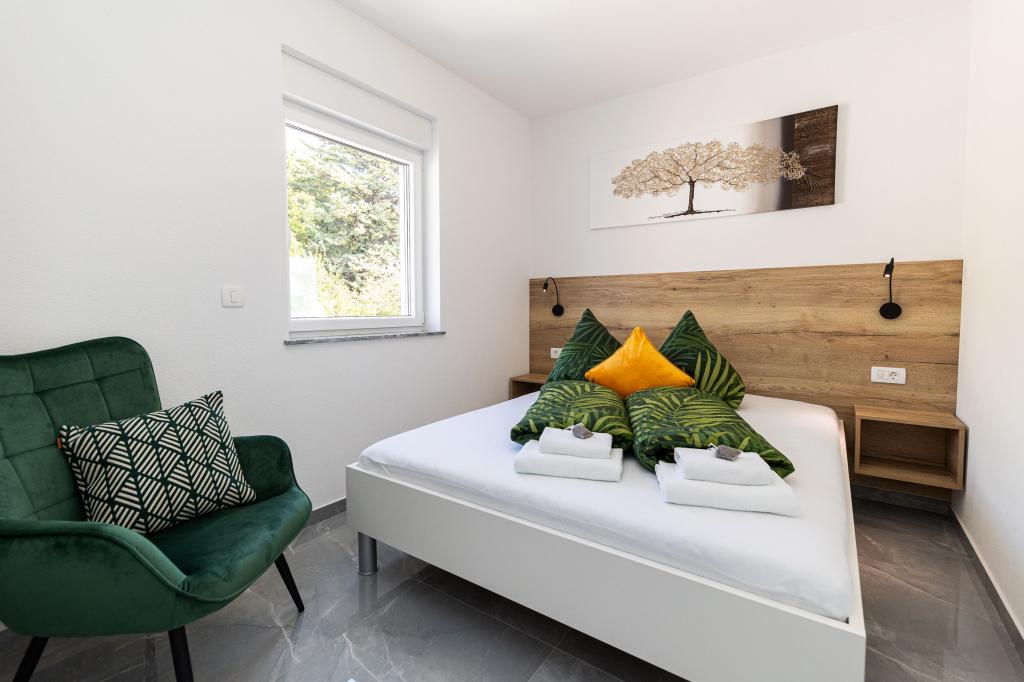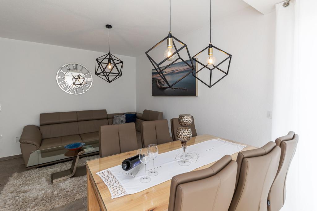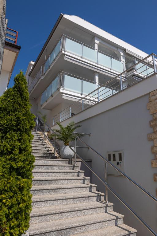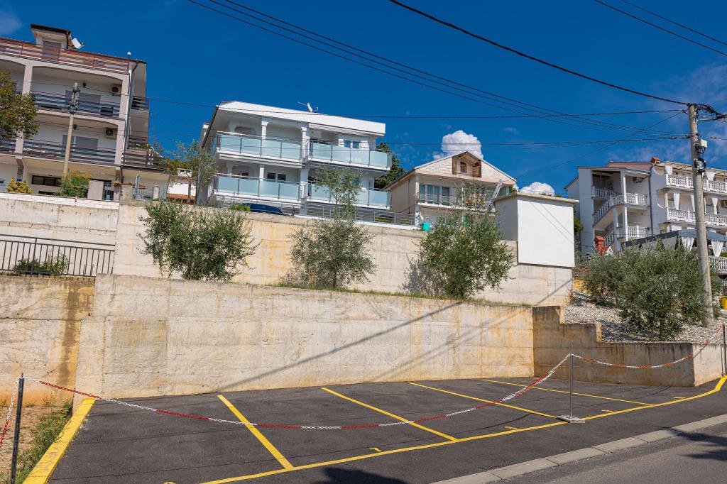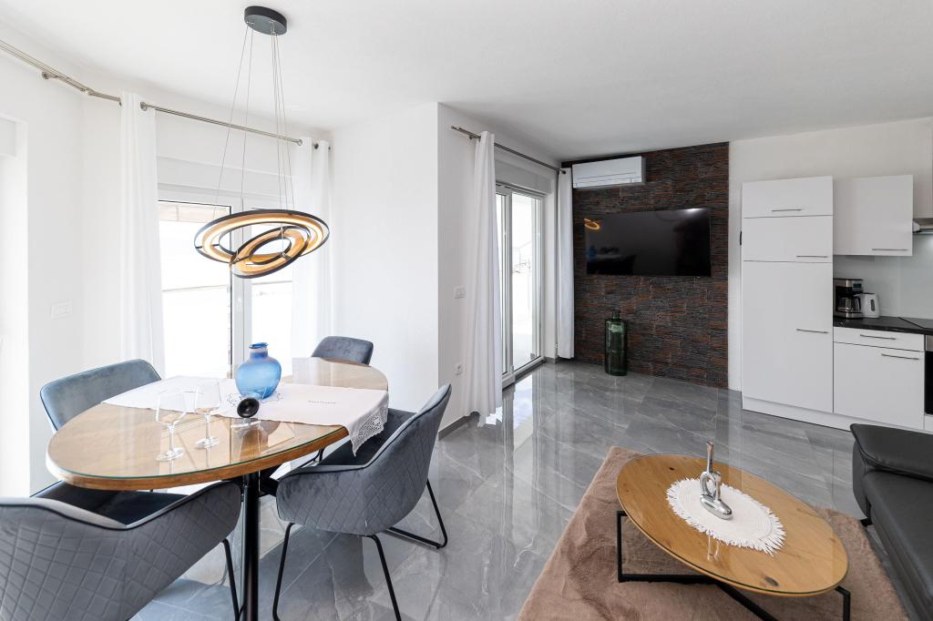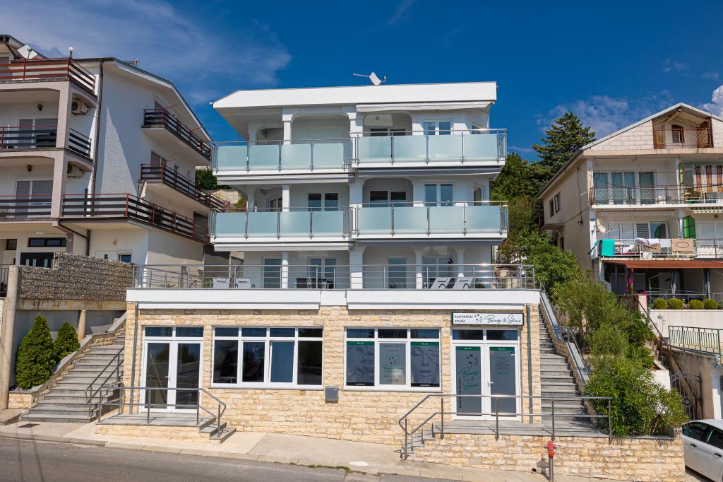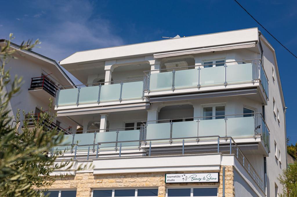 Ova moderna kuća s apartmanima savršen je izbor za odmor i život uz more. Smještena na mirnoj lokaciji u gradu, nudi privatnost i tišinu, dok je u blizini svih potrebnih sadržaja. Apartmani su moderni, opremljeni najnovijom tehnologijom i namještajem, a veliki prozori omogućuju prekrasan pogled na more. Unutrašnjost je minimalistička, s naglaskom na udobnost i funkcionalnost, pružajući idealno okruženje za opuštanje. Kuća se nalazi daleko od buke i gužve, ali s brzim pristupom centru grada. Iza kuće je prostor za roštiljanje, savršeno za opuštena okupljanja na otvorenom. Uz kuću su besplatna parkirna mjesta, što olakšava parkiranje bez stresa. Ova kuća nudi savršen spoj modernog života, privatnosti i prirodnog okruženja, s pogledom na more i svim pogodnostima koje bi poželio svaki posjetitelj.