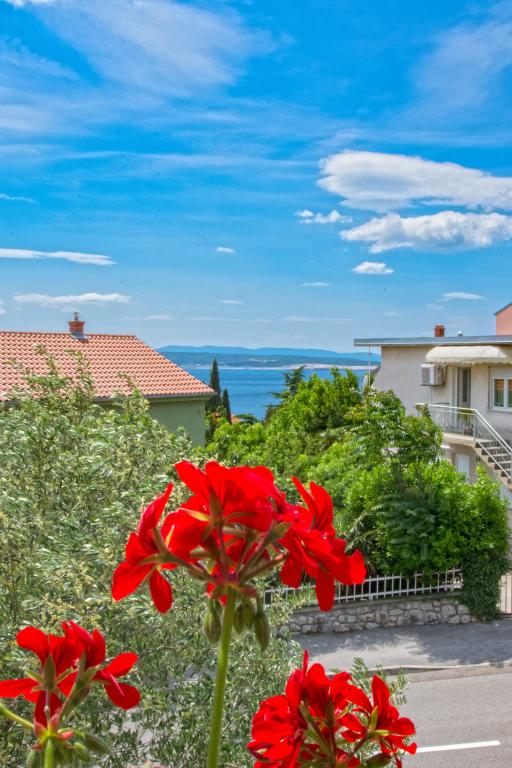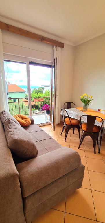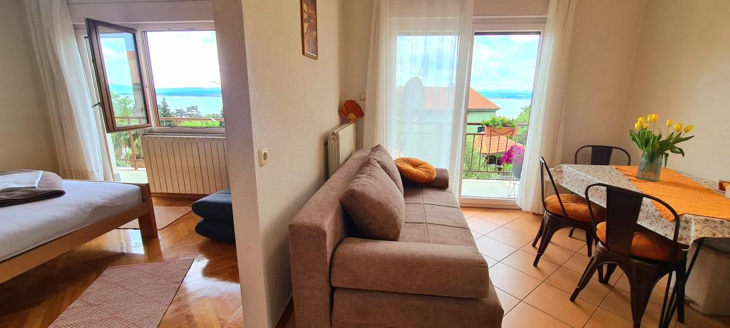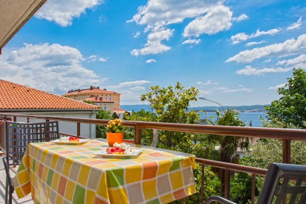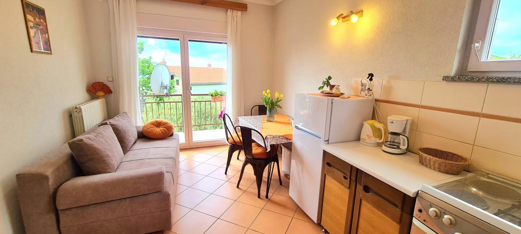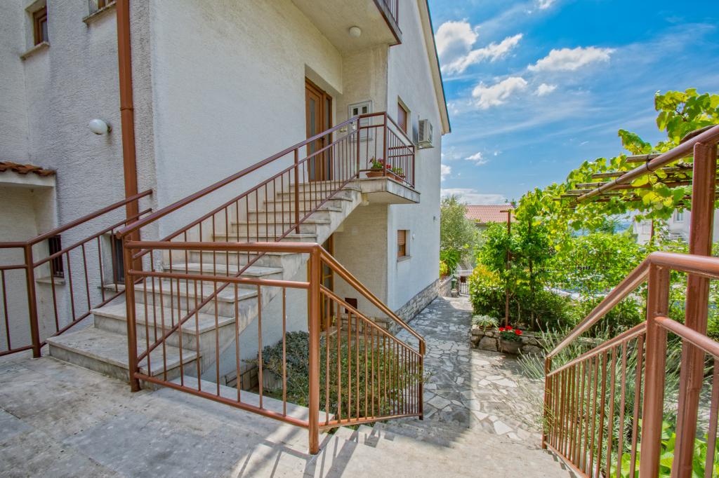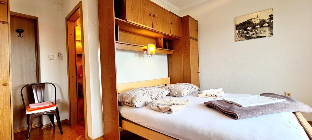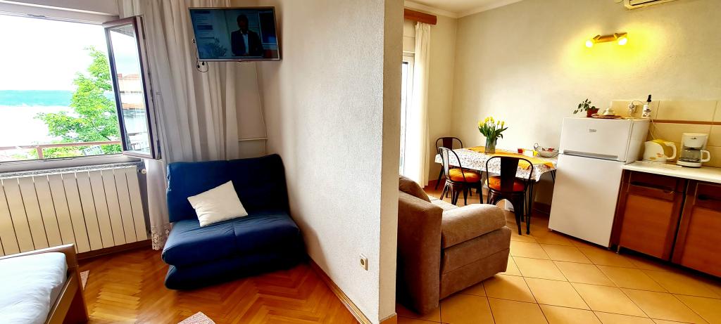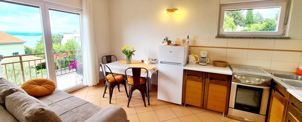 Dobrodošli u naše apartmane u Crikvenici! Apartman 2+1 nalazi se na adresi Tina Ujevića 8 u Crikvenici na 1. katu obiteljske kuće; sastoji se od dvije povezane prostorije – spavaće sobe sa kupaonom i WC-om i kuhinje. Ima balkon sa prekrasnim pogledom na more, a iza kuće i terasu koja se može koristiti. Pogodan za 2 + 1 osobe. U apartmanu je klima, TV Satelit i WI-FI. Parking je osiguran. U blizini su prekrasne pješčane i stjenovite plaže.