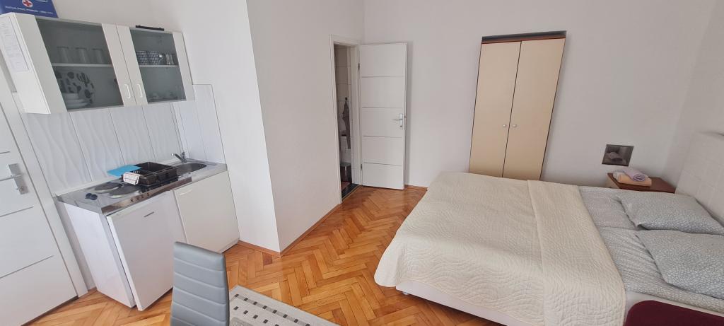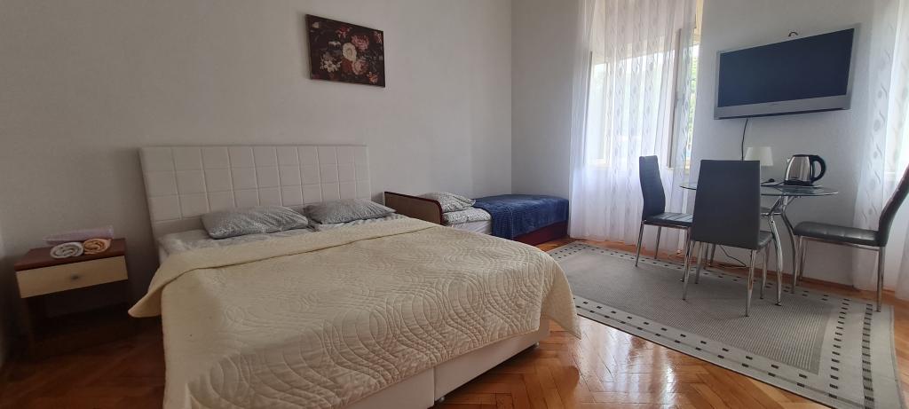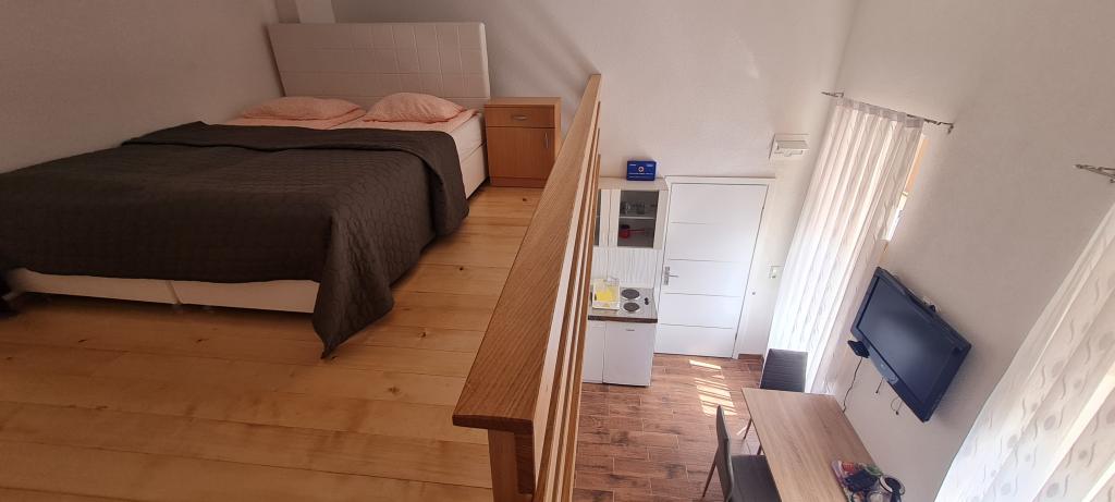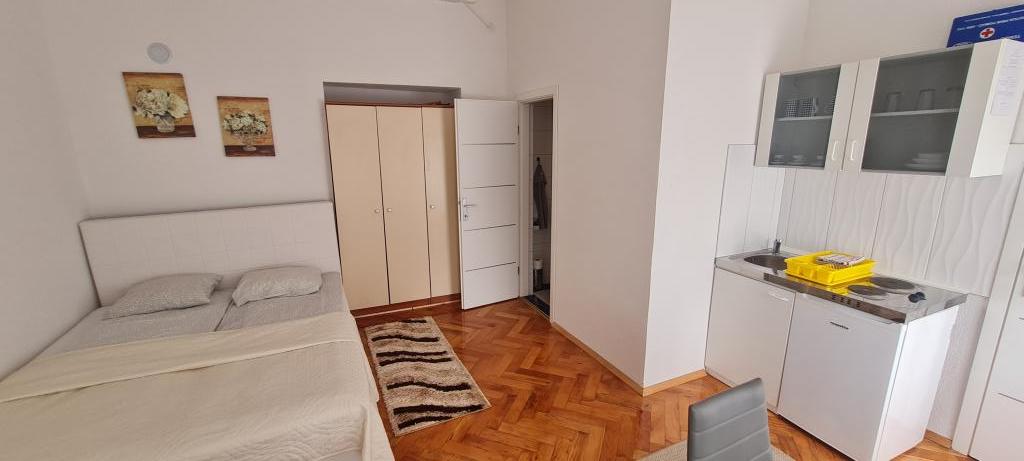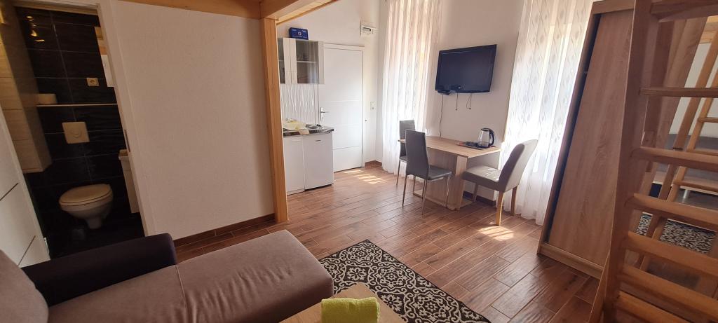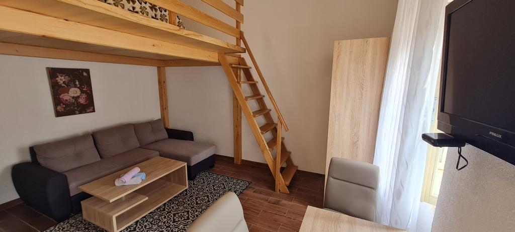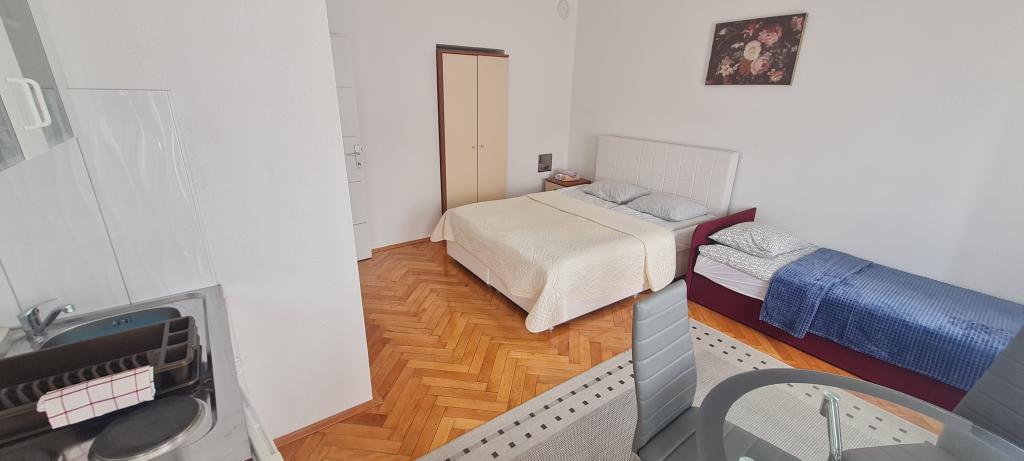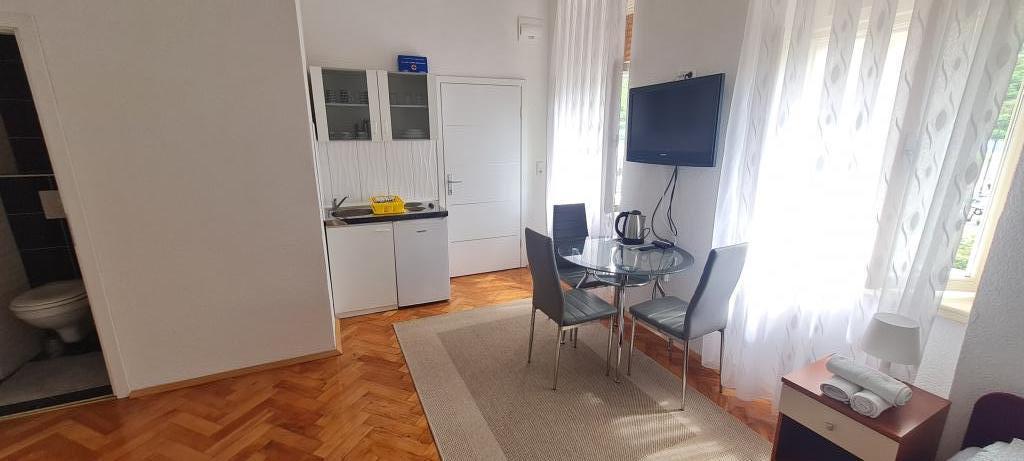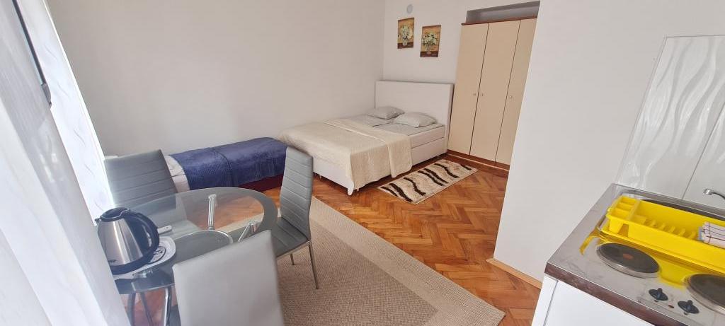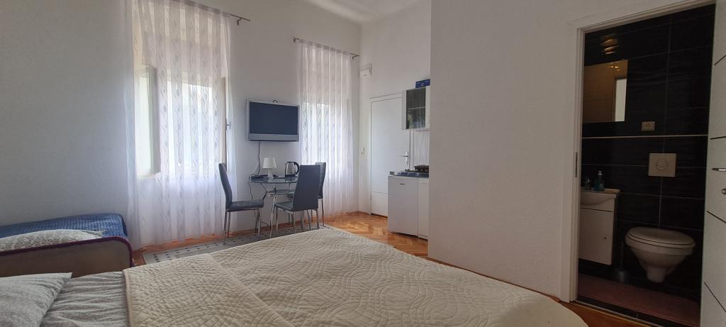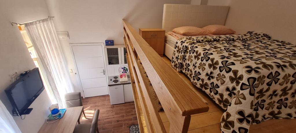 Pišem ovu recenziju kako bi upozorila ostale koji namjeravaju provesti svoj odmor ovdje. Lokacija apartmana je stvarno blizu centra, plaže i trgovina. Apartman je čist i uredan. Prošle godine boravili smo u donjem apartmanu i bilo je sve u redu, osim kreveta do kojeg se išlo stepenicama te se prilikom ustajanja trebalo paziti da se ne udari glavom. Kako nam je to bila jedina mana i kasno smo počeli tražiti smještaj, ponovno smo nazvali gospođu te tražili gornji apartman. Iako je cijena na stranici 90€ noć gospođa je rekla da se možemo dogovoriti za 75€ na što smo pristali. U apartmanu na ulasku jasno stoji cjenik od ove godine kako je cijena za dvije osobe 70€ na noć za isti taj apartman. Noćenje za tri osobe je 90€. Taj cjenik nije istaknut na internetu i ne vidite ga prilikom iznajmljivanja. Zadnje dvije noći nam se pridružila i treća osoba na što je gospođa rekla da nema problema, ali zadnji dan nam ipak naplatila dodatnih 40€. Prema cjeniku u apartmanu boravak za 7 noći nas je trebao izaći 530€, a gospođa nam je naplatila 565€. Klima je naplaćena dodatnih 5€ svaki dan kao što stoji u cjeniku, ali zaista se nije moglo bez klime. Ukupno smo platili 600€ za 7 noći. Soba je zaista jako mala, kupaonica pogotovo i taj studio nikako ne vrijedi taj novac (skoro 86€ na dan). Najveći problem je bio što se ljudi na more dođu odmoriti, ali gospođa to očito ne shvaća. Jedno jutro je kucala na vrata sobe te uvela gosta koji je odsjedao u donjoj sobi da dođe pogledati našu. Moram napomenuti da sam tad još spavala. Svaki dan je gospođa komentirala da predugo spavam. Kako gospođa živi u istoj kući u kojoj su sobe nikako nema mira. Mobitel joj je pojačan na najjače, prolazi stalno pokraj sobe, razgovara sa svojima itd. Uz cijenu od 86€ za noć stvarno očekujem da mogu imati svoj mir, a ne da stalno “čekam” da mi gospođa uđe u sobu. Također prošle godine je isto samo ušla u sobu bez kucanja. Parking nije ispred kuće nego negdje gore dalje, ali nismo koristili auto pa nam nije smetalo. Nažalost za boravak dulji od jedne/dvije noći nikako ne preporučam ni jedan od ovih smještaja.
