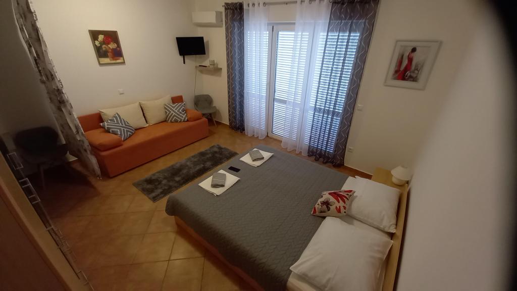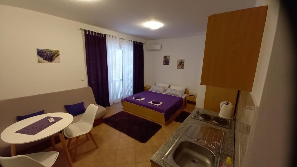 Za odmor od svakodnevnice i užurbanog života nudimo studio apartmane ili sobe po izboru u obiteljskom objektu, s pogledom na more. Vas smještaj se nalazi 7-8 min vožnje do grada, a plaže 3-4 min. Apartmani imaju mogućnosti korištenja vanjskog roštilja, te blizinu trgovačkog cetra Duga Mall i Lidl. Kod nas imate osigurano parking u svako doba što je najveći problem svakog turističkog mjesta. Mogućnost korištenja klima uređaja uz nadoplatu od 5 EUR po danu. Vaš ugodan odmor u našem objektu je naš najveći zadatak.