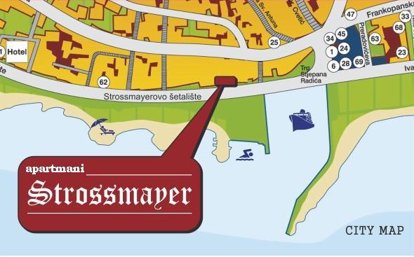 Apartmani Strossmayer smješteni su na najljepšem dijelu stare Crikveničke rivijere na samoj šetnici nasuprot plaže Balustrada na adresi Strossmayerovo šet 2 i 3 udaljeni svega 50tak metara od glavnog gradskog trga i stare luke, te 100 metara od glavne gradske plaže. Gostima su na raspolaganju dva novouređena apartmana KORANA s 4 zvjezdice za 2 osobe s pomoćnim ležajem koji se nalaze na 1. katu s pogledom na gradski trg i plažu, dva studio apartmana ZLATA s 3 zvjezdice za 2 osobe s pomoćnim ležajem od kojih se jedan nalazi na 1 katu s pogledom na gradski trg i plažu dok se drugi nalazi na drugom polukatu bez pogleda na more. Apartmani nemaju parking isti se plaća po danu