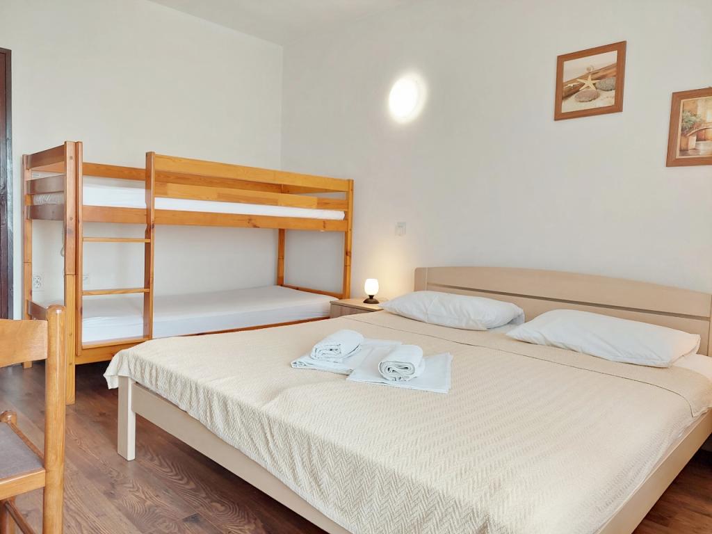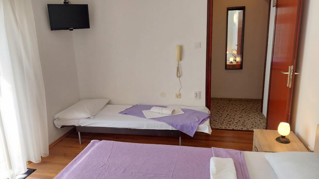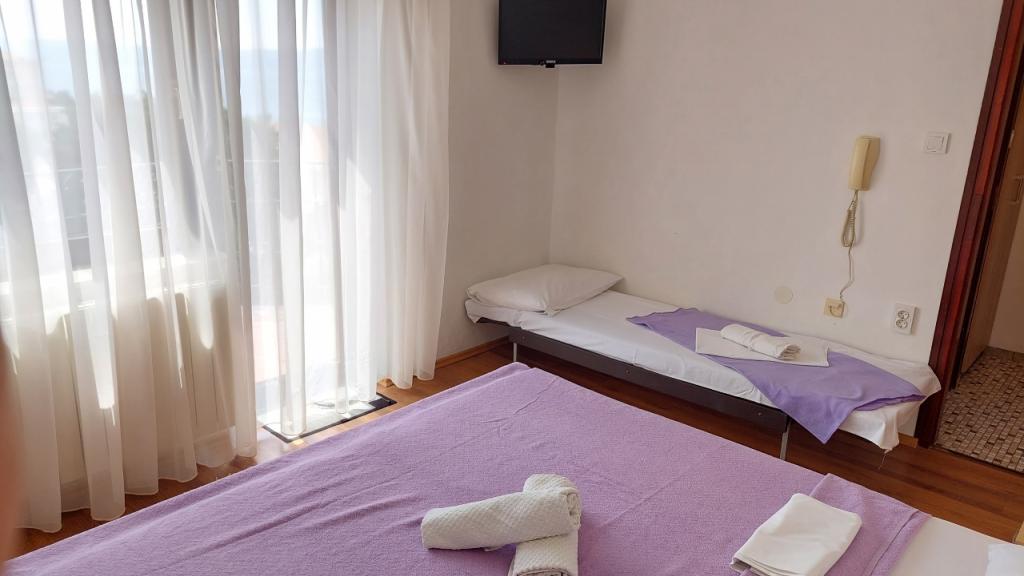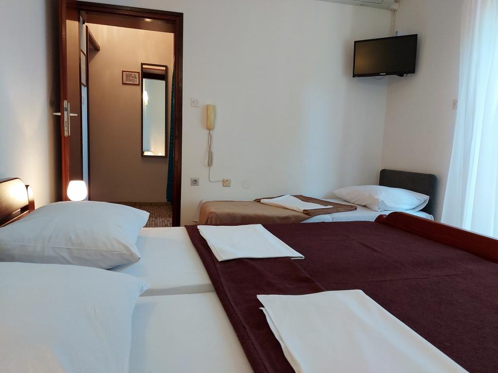 Pročitaj više Smještajne jediniceDječji popusti: - Djeca do 12 godina, 20 % popusta za noćenje na pomoćnom ležaju. - U trokrevetnoj sobi: 2 odrasla 2 djece, 50 % popusta na noćenje za djecu. - Djeca do 7 godina ako spavaju s roditeljima u istom krevetu plaćaju: Noćenje 7,00 EUR Doručak 12,00 EUR Večera 13,00 EUR (Dječja porcija 9,10 EUR) - Kućni ljubimci 8,00 EUR dnevno - Klima uređaj 7,00 EUR dnevno Boravišna pristojba: 2,50 EUR za odrasle, 1,25 EUR za djecu od 12 - 18