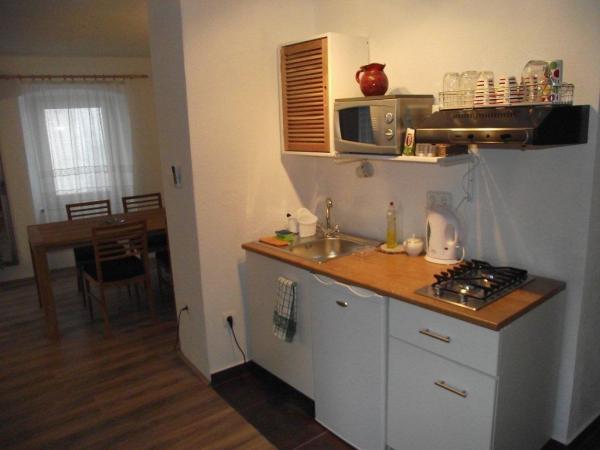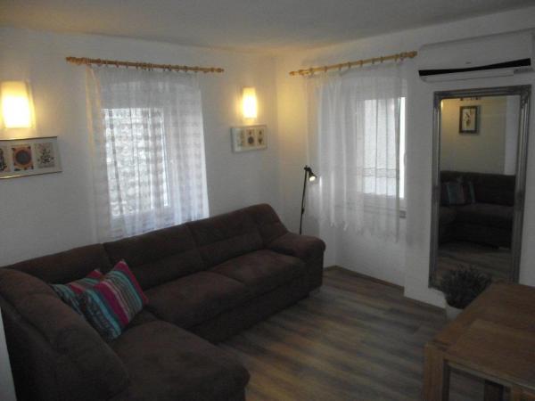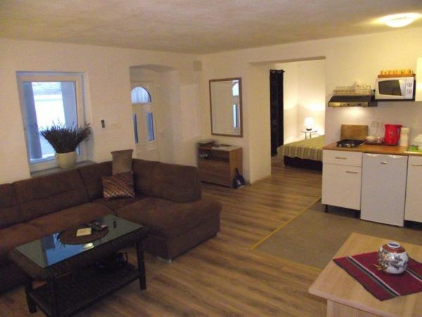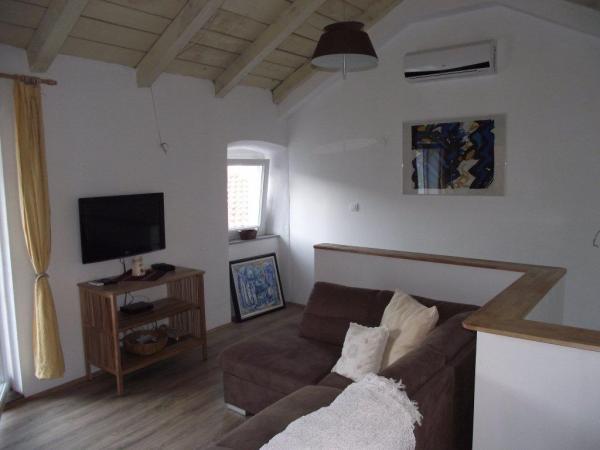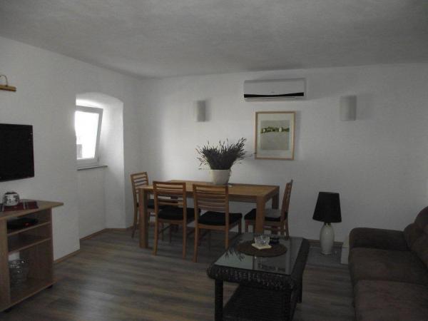 Apartmani su smješteni u secesijskoj dvokatnici u samom središtu mjesta i tokom prve polovice 2012. god. u potpunosti su rekonstruirani. U neposrednoj blizini kuće nalazi se trgovina, restoran s terasom i kafić, te galerije, muzeji i crkve. Parkiralište se nalazi oko 200 metara udaljeno, nije čuvano, ne može se rezervirati i ne naplaćuje se. Kućni ljubimci su dozvoljeni uz predhodnu najavu. Studio apartman smješten je u prizemlju kuće, veličine 40-tak m2. Ispred ulaza nalazi se natkrivena terasa koja pripada apartmanu. Apartman se sastoji od veće spavaće sobe s bračnim krevetom, dnevne sobe s kaučem na razvlačenje za dvije osobe, te kupaonicom s tušem i wc-om. Pod spavaće i dnevne sobe prekriven je drvenim laminatom. Apartman je opremljen klima uredjajem (grijanje/hladjenje), SAT TV, sefom, kuhinjom. U Apartmane 1 i 2 koji se nalaze na drugoj odnosno trećoj etaži ulazi se preko velike sunčane terase. Apartman 1, veličine 40-tak m2 sastoji se od spavaće sobe, dnevnog boravka i kupaonice. Spavaća soba uz bračni krevet ima i ugradjeni ormar. U dnevnom boravku smješten je kauč na razvlačenje za dvije osobe, kuhinja i veliki stol sa četiri stolice. Apartman je opremljen klima uredjajem (grijanje/hladjenje), SAT TV, sefom.. Apartman 2, veličine 40-t