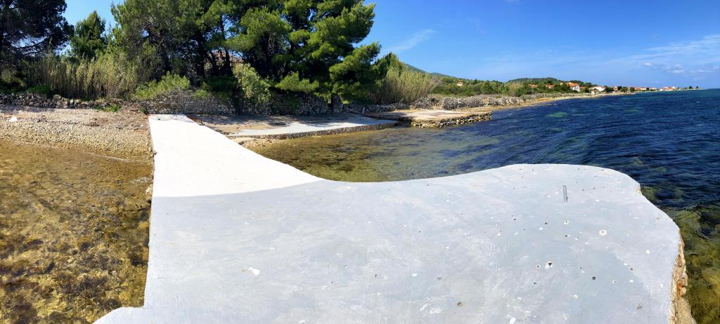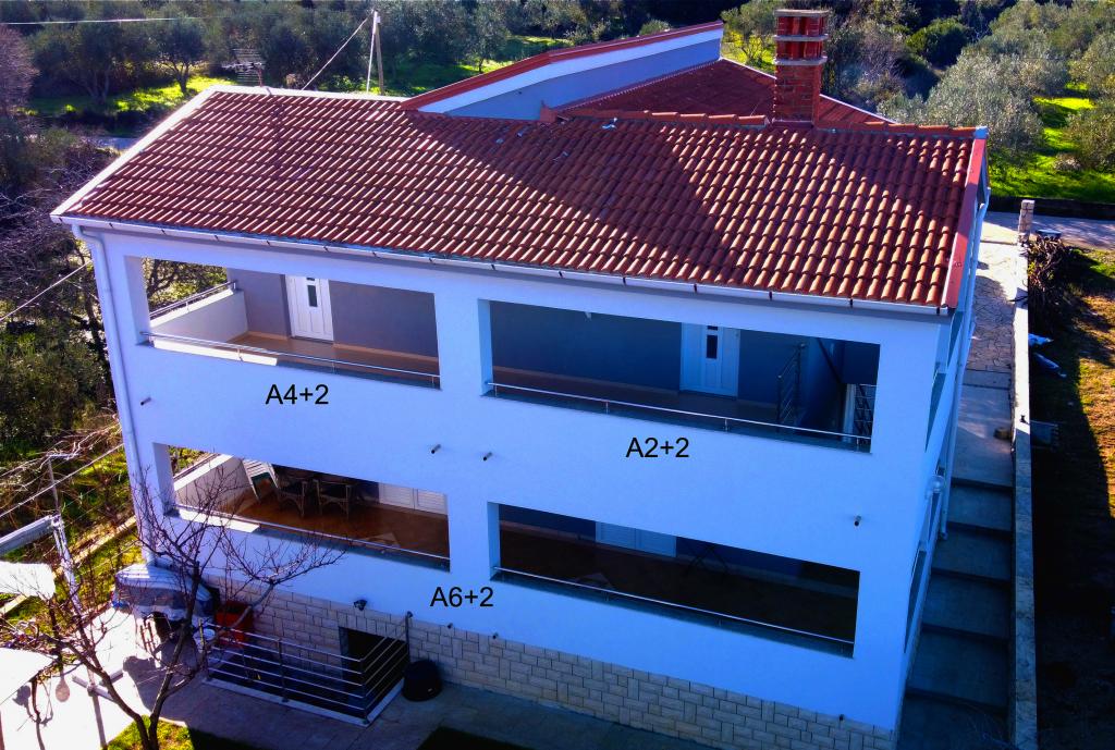 U objektu se nalaze 3 apartmana. Najveći A6 2 pokriva cijelo prizemlje oko 90m2 terasa 30m2. Na katu se nalaze apartmani A4 2 i A2 2 svaki površine oko 45m2 i zajedničke terase 30m2. Terase imaju pogled na more. Apartmani su potpuno opremljeni i klimatizirani. Objekt je udaljen 50m od mora. Objekt se nalazi na osami. Plaža ispred apartmana je betonirana, ima hlada. Ispred objekta nalazi se parking. Također veliki roštilj/peka/ražanj na slobodno korištenje gostima. Kao i veliki stol i klupe ispred roštilja. Mjesto Dobropoljana je udaljeno 200m. Do centra mjesta ima 5 minuta hodanja. U centru su 2 trgovine, velika uređena pješčana plaža, prvoklasni restoran, lučica za brodove. Ispred objekta ima mjesta i za vezanje brodice, a u mjestu Dobropoljana se brodica može stavit ili izvadit iz mora na prikolicu.