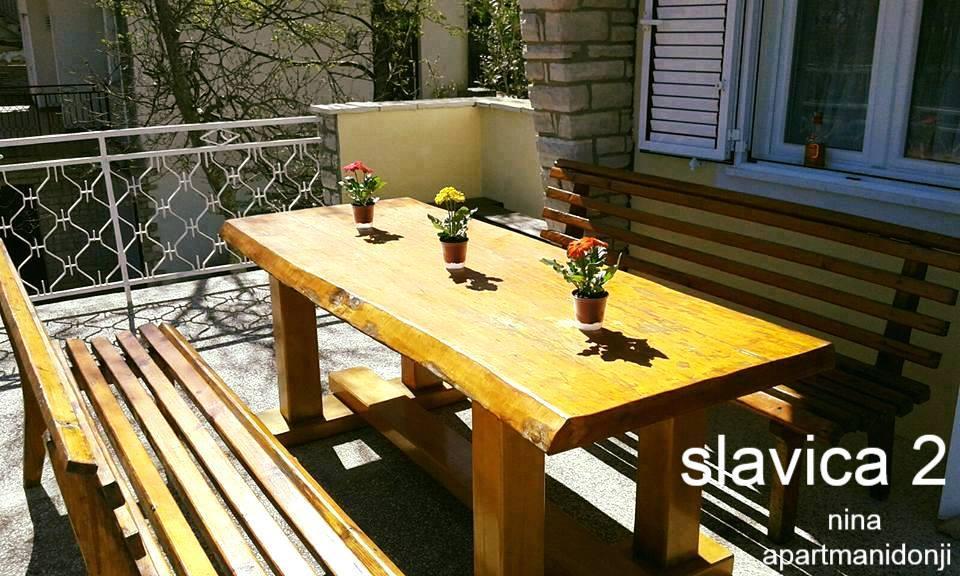 Monika, Slovenija Nina apartmane sam pronašla na internetu.Za Donji Karin nikad nisam čula, ali kako volim upoznavati nova mjesta, odlučila sam se provesti godišnji odmor u apartmanima Nina.Nakon duge vožnje smo stigli u apartmane.Prvi dojam mi je bio čudesan. Kuća od kamena, u dvorištu veliko stablo, koje je davalo hladovinu, velika terasa. Tu je i veliki kamin gdje možete roštiljati .Apartmani su udobni i opremljeni sa svime što vam je potrebno.Svaki apartman ima svoju terasu, na kojoj možete sjediti i uživati u pogledu na more.U kratko, izgleda kao što je i opisano u oglasu.Vlasnica Svjetlana ljubazno nas je ugostila i vrlo brzo sam se osjećala kao doma.Svjetlana je vrlo uslužna i gostoprimiva.Apartmani su u mirnom okruženju borova i cvrčaka. Tu je i duga plaža na kojoj ima dovoljno prostora kako za djecu tako i za odrasle.Ovdje nema masovnog turizma što nam je izuzetno bilo drago.Na plaži, gdje smo bili, raste posebna vrsta stabla tamaris, koji pružaju ugodan hlad i zaklon od sunca.U blizini je i trgovina, štandovi sa svježim voćem i povrćem, slastičarnica i kiosk sa hamburgerima.U blizini je i poznato ljekovito blato s kojim se možete namazati. Tu je i šuma kroz koju vodi pješačka staza do susjednog mjesta.Uz šumu su također prekrasne plaže.Za večernje šetnje nije daleko grad Gornji Karin u kojem ima mnoštvo zabave za djecu.Uglavnom u apartmanima Nina sam provela prekrasno vrijeme, na terasi smo imali predivan pogled na more sa ugodnim večernjim povjetarcem.U apartmanu nije potrebna klima uređaj jer borovi oko kuće čine hladovinu i vrlo je ugodno za spavati.Uglavnom kad smo razgovarali sa Svjetlanom nismo joj rekli da se vraćamo iduće godine, ali odlučili smo provesti sljedeći odmor u Apartmani Nina jer su nam ostali u dobrom sjećanju.Apartmane bih preporučila svima koji žele odmor od svakodnevnice i koji uživaju u miru, svježini i pjevanju cvrčaka.