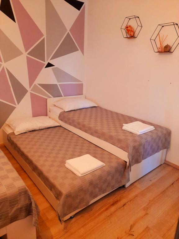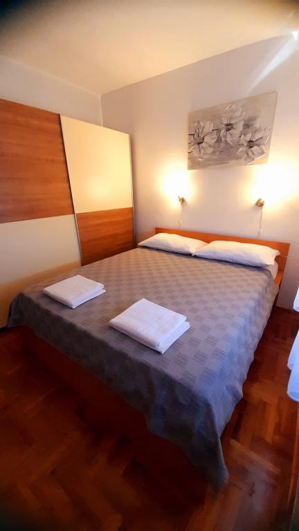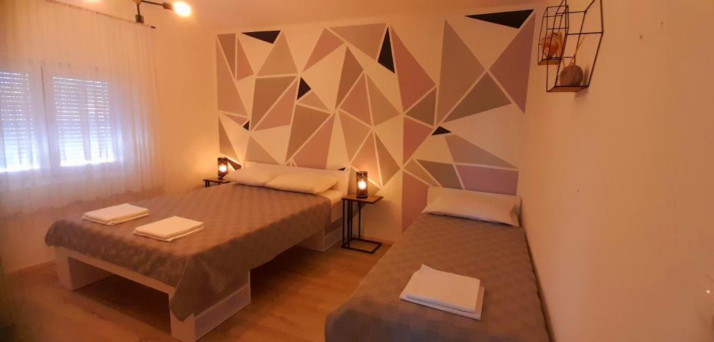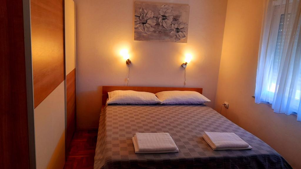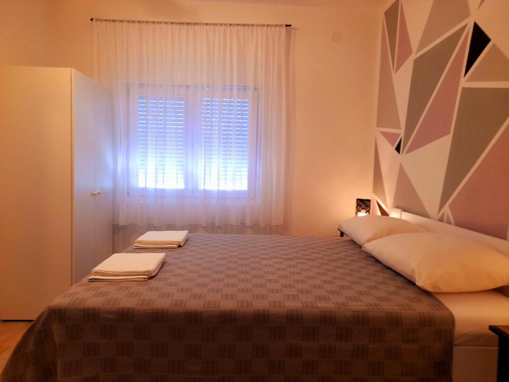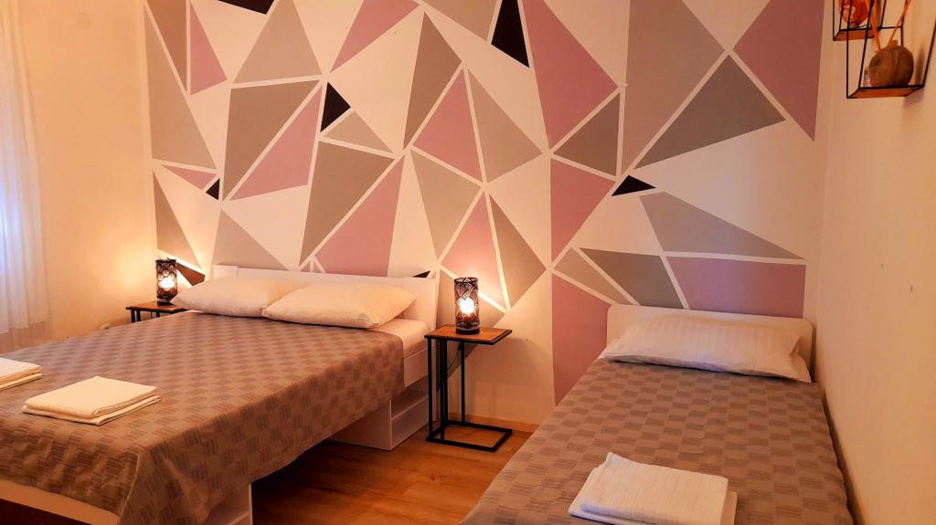 Apartman Mediteran, A7+5, Drage (Pakoštane, Zadar) Prostran i kvalitetno opremljen smještaj za 7-12 osoba, sa velikom terasom ! Apartman Mediteran je vrlo prostran i kvalitetno opremljen apartman, ukupne stambene površine 100m2 sa velikom prostranom terasom površine 15m2 i jednim malim balkonom. Apartman se sastoji od tri spavaće sobe, tri kupaone, kuhinje sa blagovaonom, dva dnevna boravka, , hodnika, vešeraja, malog balkona i velike terase . U dvije spavaće sobe su bračni kreveti 160 cm širine, u trećoj sobi je jedan bračni krevet 160 cm širine, jedan krevet 90 cm širine i jedan krevet na izvlačenje 90 cm širine . U dnevnim boravcima su dva ležaja na razvlačenje širine 160 cm. Apartman ukupno ima 7 glavnih i 5 pomoćna ležaja. U ponudi također imamo i 2 baby prijenosna krevetića. Apartman je klimatiziran i ima besplatan wifi flat Internet. Gosti na raspolaganju imaju veš mašinu, perilicu posuđa, pećnicu, mikrovalnu, peglo, sredstva za čišćenje, posteljinu, ručnike…