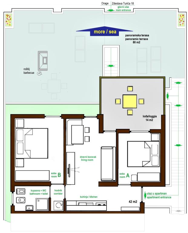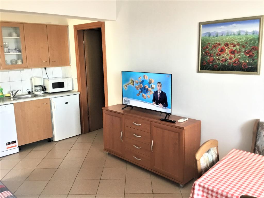 Pročitaj više Smještajne jediniceGost prilikom rezervacije apartmana uplaćuje dogovoreni iznos akontacije od ukupne cijene najma apartmana, a Domaćin, po zaprimanju uplate akontacije, dostavlja Gostu pisanu potvrdu rezervacije (voucher). Vrijeme ulaska Gosta u apartman je od 14:00 h, a izlaska iz apartmana do 10:00 h. Gost preostali dio od ukupnog iznosa najamnine uplaćuje Domaćinu po ulasku u apartman. U iskazanoj cijeni najma apartmana podrazumijeva se boravak do 4 osobe, a doplata za boravak 5. osobe iznosi 20 EUR/noć. Boravišna pristojba uključena je u cijenu noćenja Korištenje parkirnog mjesta, panoramske terase i roštilja uključeni su u cijenu noćenja. Utrošak električne energije i vode uključeni su u cijenu noćenja. Korištenje klima uređaja i usluga interneta uključeni su u cijenu noćenja. Završno čišćenje apartmana uključeno je u cijenu noćenja.