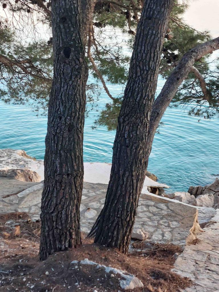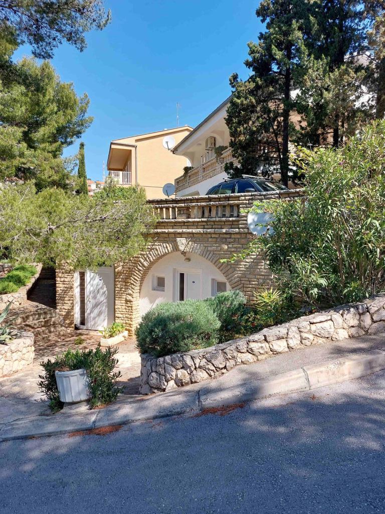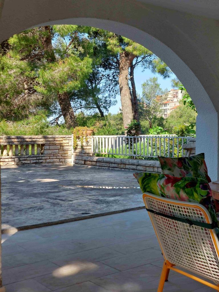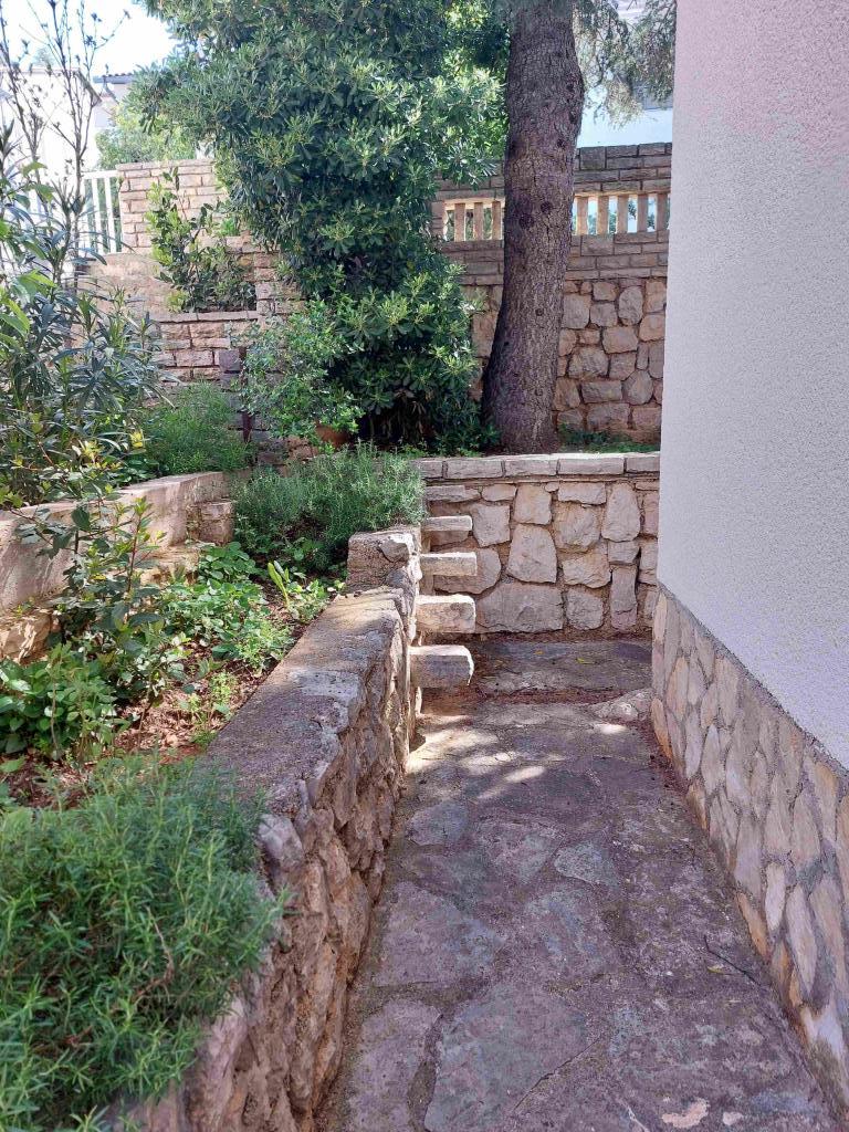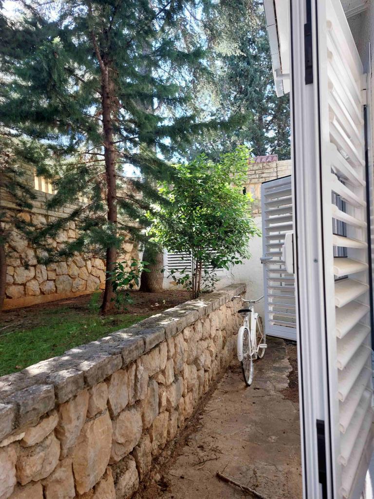 Uživajte u našem potpuno novouređenom apartmanu u hladu terase s pogledom na čisto more! Apartman se nalazi u prizemlju vile i okružen je velikim, sjenovitim dvorištem u prvom redu do mora. Popodnevnu vrućinu provedite u našem mirisnom vrtu ispijajući hladne koktele, čekajući najljepši zalazak sunca! Kod nas Vam je sve pri ruci - piće u obližnjem beach baru, večera u pizzeriji pokraj, svakakve aktivnosti na plaži, čitanje knjige u hladovini starih borova pokraj mora, dječje igralište u hladu, osvjetljena šetnica uz more. Ne brinite za parkirno mjesto - osigurano je za Vas u dvorištu. Kako smo veliki ljubitelji životinja, tako su i Vaši kućni ljubimci dobrodošli!