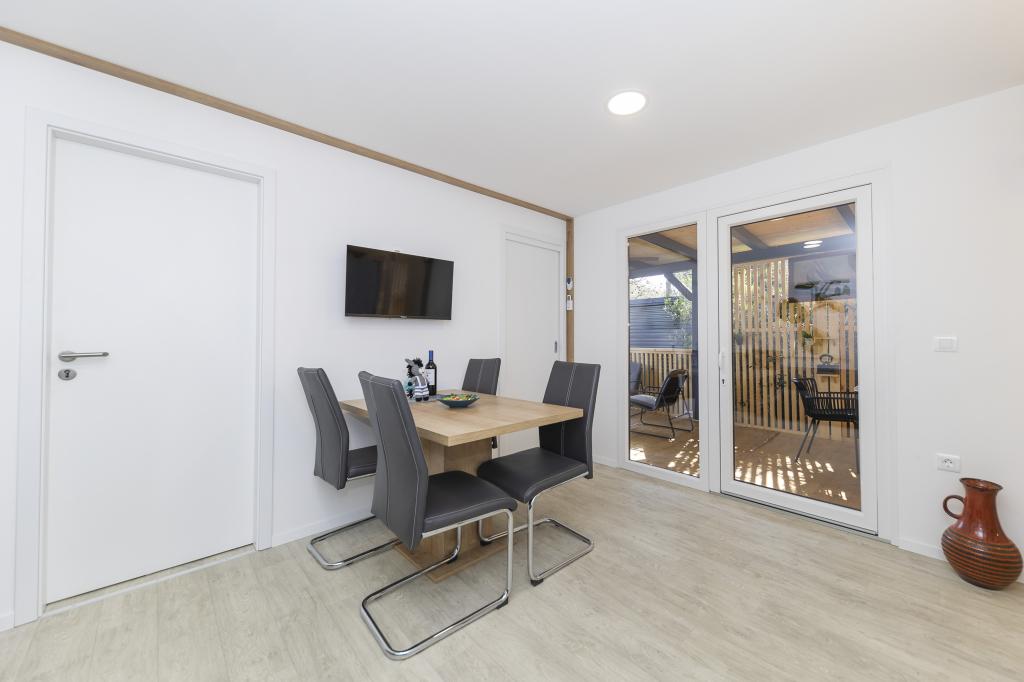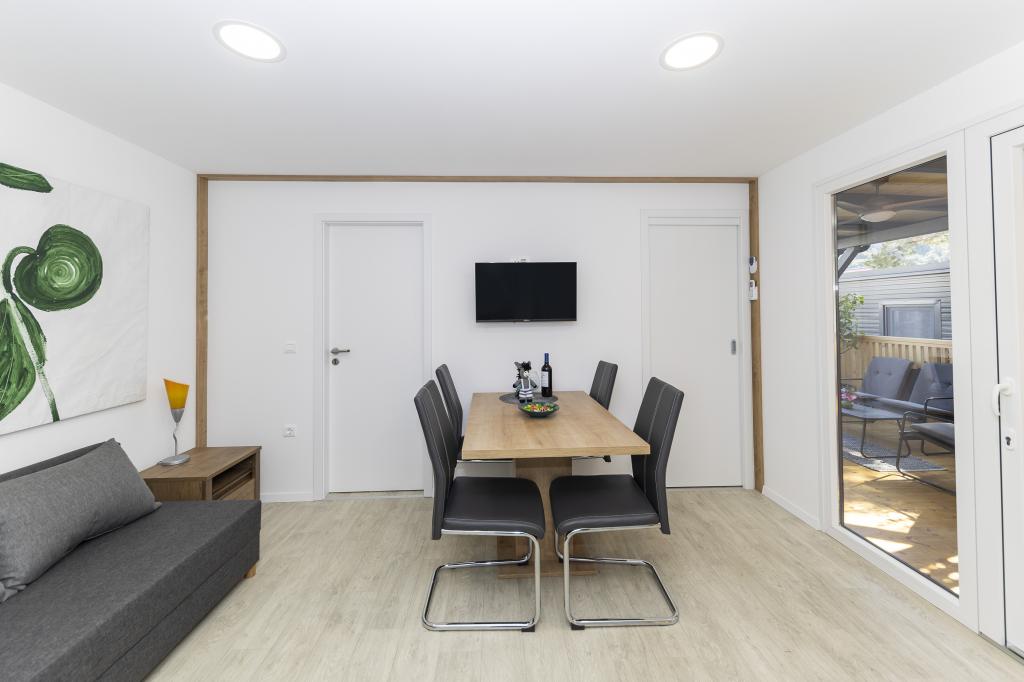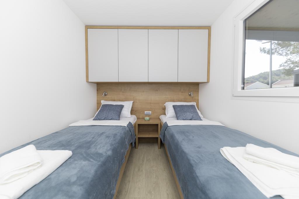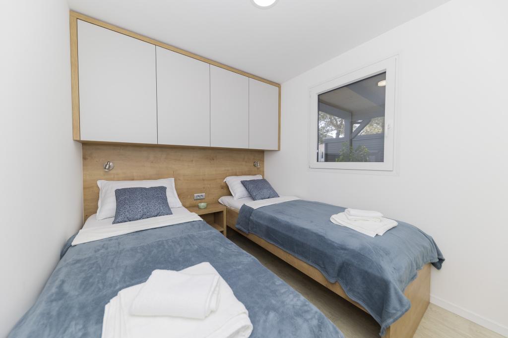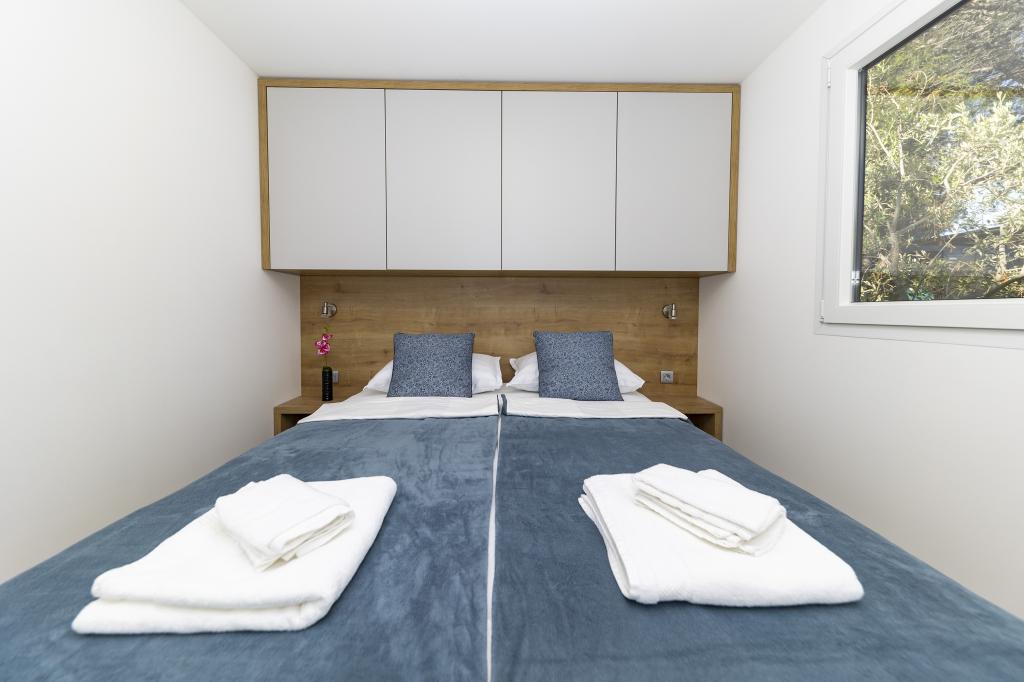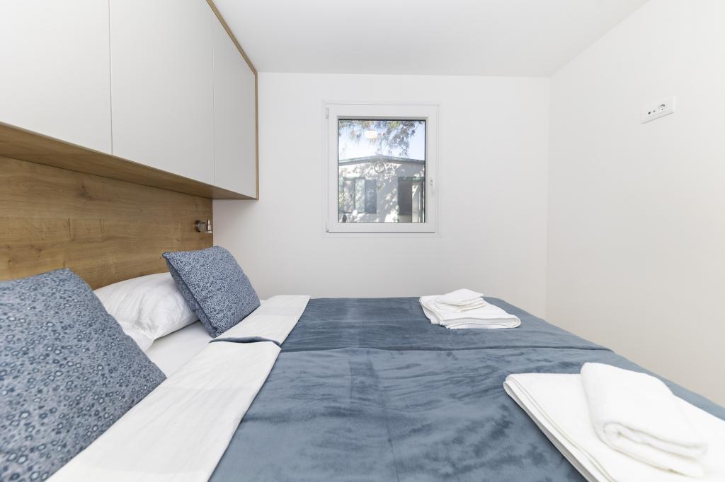 Nova mobilna kućica se nalazi u kampu Oaza Mira koji se nalazi u mjestu Drage, udaljenom 10-ak km od Biograda, u središtu hrvatske obale na prekrasnoj lokaciji s vlastitom uvalom, u prirodnom ambijentu pretvara Vaš odmor u užitak. Kamp je izdvojen iz mjesta, tako da gosti kampa nisu izloženi gužvi i buci. Izleti u blizini: NP Kornati, NP Krka, PP Vransko jezero. Kućica se sastoji od dvije spavaće sobe. Soba sa bračnim krevetom i soba sa dva odvojena kreveta. U dnevnom boravku je trosjed na razvlačenje koji se može koristiti kao pomoćni ležaj za dodatne dvije osobe. Kućica ima dnevni boravak, kuhinju sa posuđem i priborom, indukcijski štednjak, hladnjak, mikrovalnu pećnicu, toster, kuhalo za vodu, perilicu posuđa. Kupaonica sa tuš kabinom, umivaonikom i wc-om, sušilo za kosu. U sklopu dnevnog boravka nalazi se TV sa klimom za hlađenje i grijanje, Wi-fi. Smještaj uključuje natkrivenu terasu 27 m2, sa vanjskom blagovaonom, ležaljkama i vanjskim tušom. Električni roštilj.