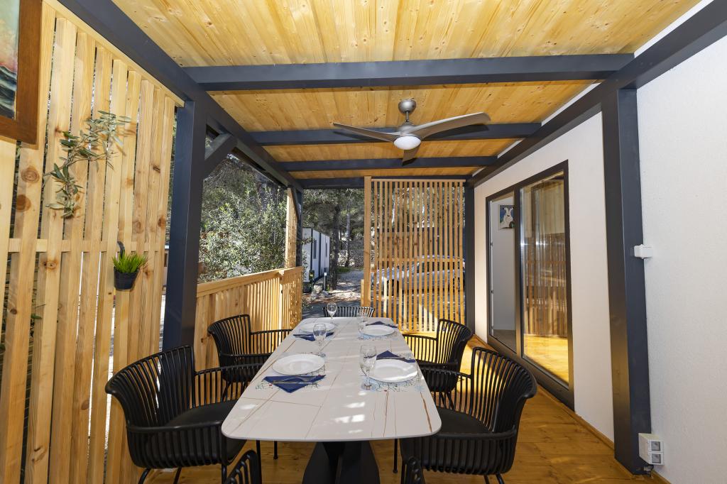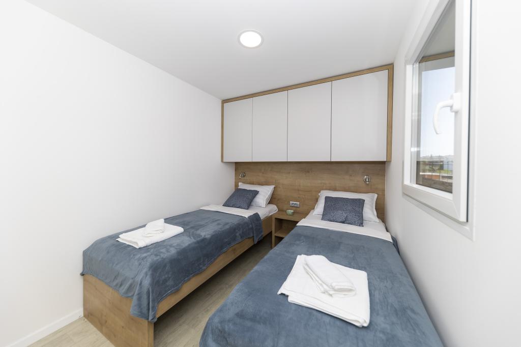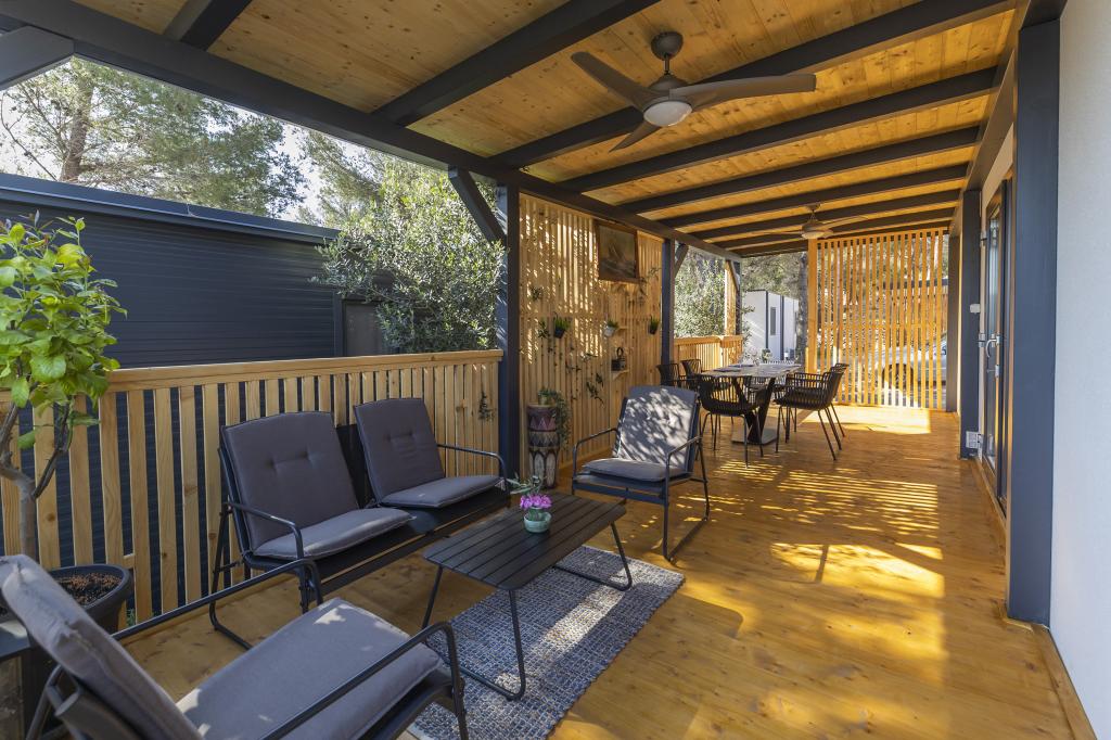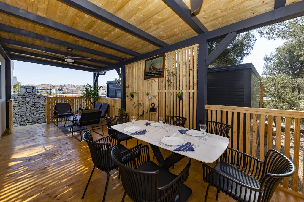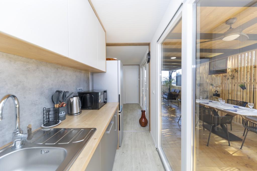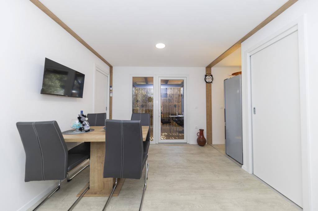 Nova mobilna kućica se nalazi u kampu Oaza Mira koji se nalazi u mjestu Drage, udaljenom 10-ak km od Biograda, u središtu hrvatske obale na prekrasnoj lokaciji s vlastitom uvalom, u prirodnom ambijentu pretvara Vaš odmor u užitak. Kamp je izdvojen iz mjesta, tako da gosti kampa nisu izloženi gužvi i buci. Izleti u blizini: NP Kornati, NP Krka, PP Vransko jezero. Kućica se sastoji od dvije spavaće sobe. Soba sa bračnim krevetom i soba sa dva odvojena kreveta. U dnevnom boravku je trosjed na razvlačenje koji se može koristiti kao pomoćni ležaj za dodatne dvije osobe. Kućica ima dnevni boravak, kuhinju sa posuđem i priborom, indukcijski štednjak, hladnjak, mikrovalnu pećnicu, toster, kuhalo za vodu, perilicu posuđa. Kupaonica sa tuš kabinom, umivaonikom i wc-om, sušilo za kosu. U sklopu dnevnog boravka nalazi se TV sa klimom za hlađenje i grijanje, Wi-fi. Smještaj uključuje natkrivenu terasu 27 m2, sa vanjskom blagovaonom, ležaljkama i vanjskim tušom. Električni roštilj.