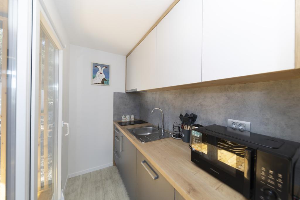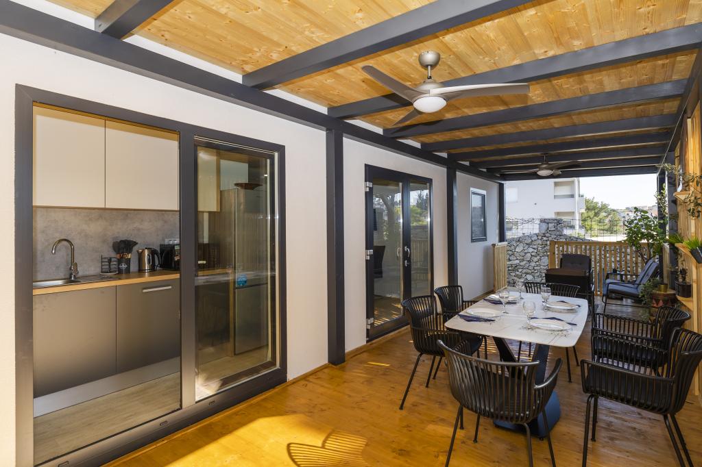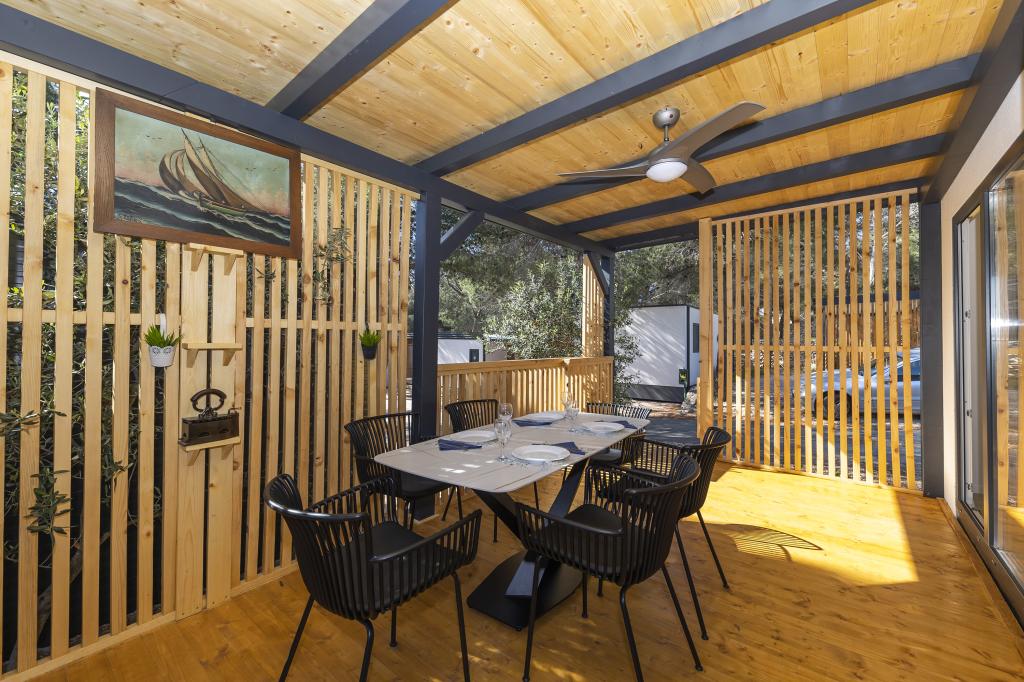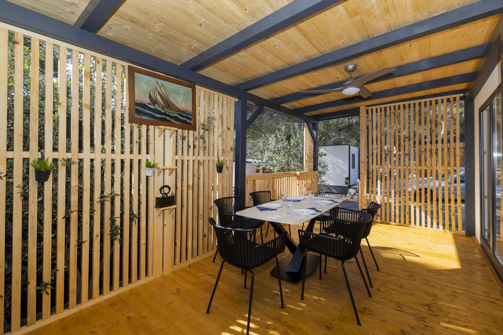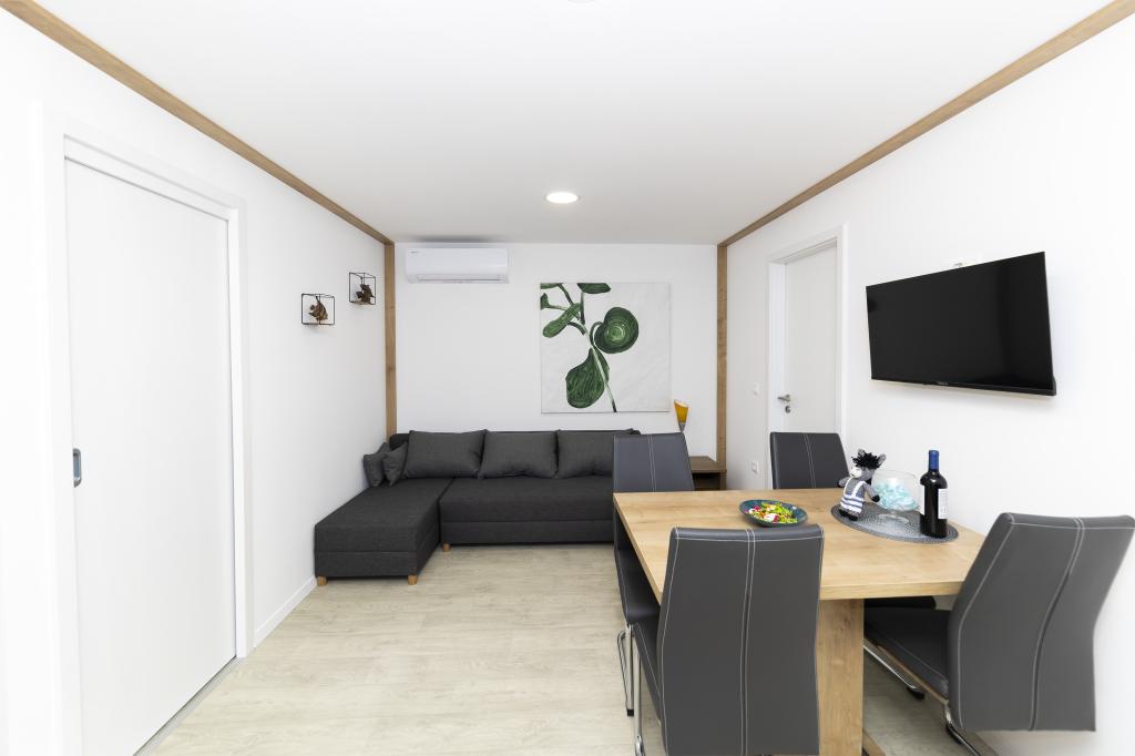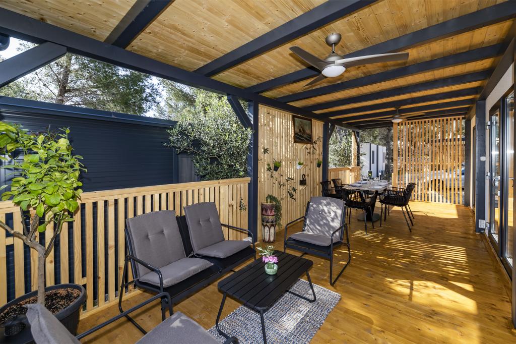 Nova mobilna kućica se nalazi u kampu Oaza Mira koji se nalazi u mjestu Drage, udaljenom 10-ak km od Biograda, u središtu hrvatske obale na prekrasnoj lokaciji s vlastitom uvalom, u prirodnom ambijentu pretvara Vaš odmor u užitak. Kamp je izdvojen iz mjesta, tako da gosti kampa nisu izloženi gužvi i buci. Izleti u blizini: NP Kornati, NP Krka, PP Vransko jezero. Kućica se sastoji od dvije spavaće sobe. Soba sa bračnim krevetom i soba sa dva odvojena kreveta. U dnevnom boravku je trosjed na razvlačenje koji se može koristiti kao pomoćni ležaj za dodatne dvije osobe. Kućica ima dnevni boravak, kuhinju sa posuđem i priborom, indukcijski štednjak, hladnjak, mikrovalnu pećnicu, toster, kuhalo za vodu, perilicu posuđa. Kupaonica sa tuš kabinom, umivaonikom i wc-om, sušilo za kosu. U sklopu dnevnog boravka nalazi se TV sa klimom za hlađenje i grijanje, Wi-fi. Smještaj uključuje natkrivenu terasu 27 m2, sa vanjskom blagovaonom, ležaljkama i vanjskim tušom. Električni roštilj.