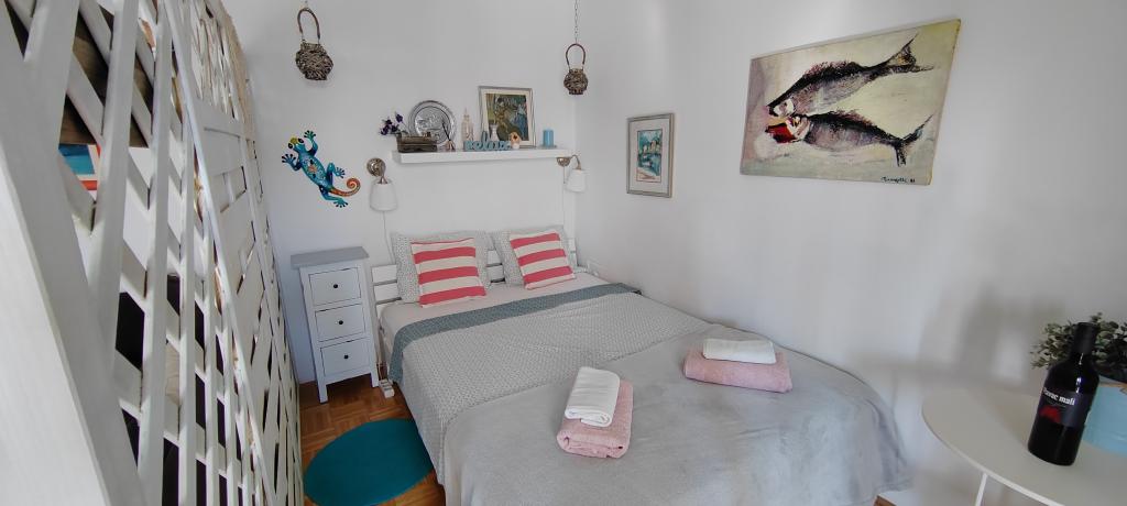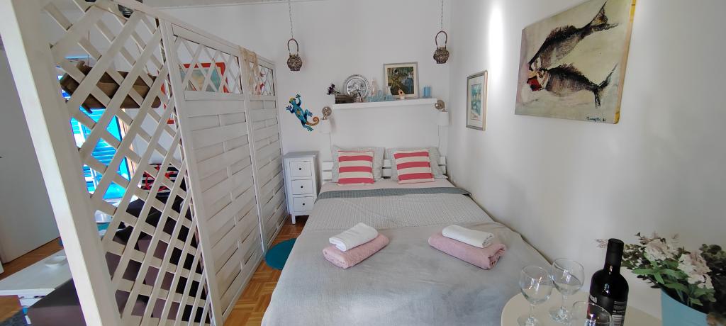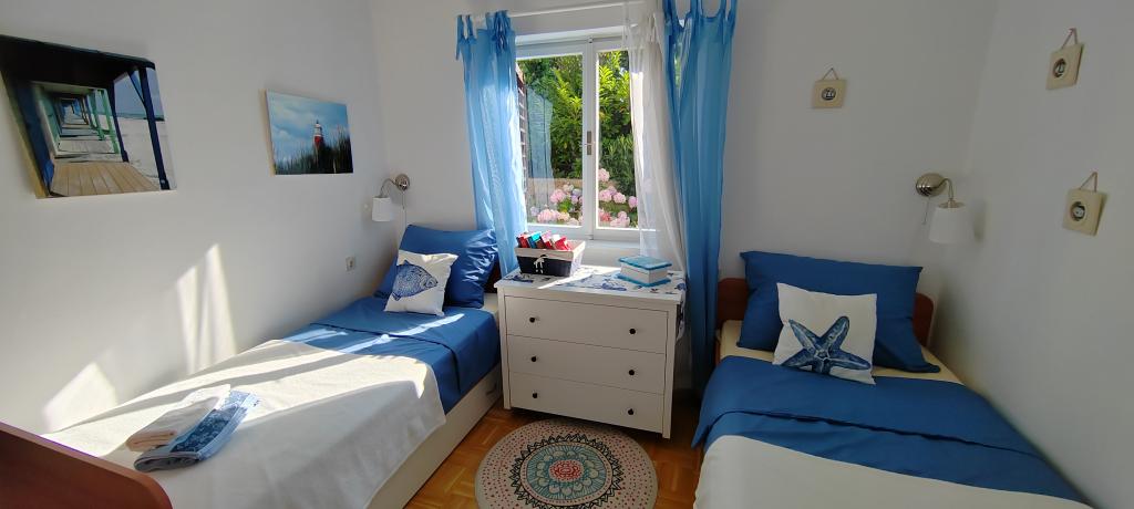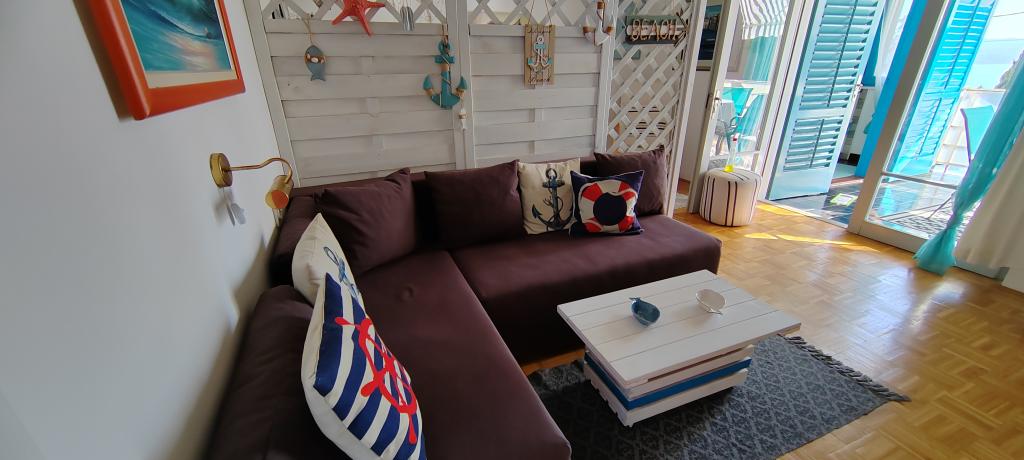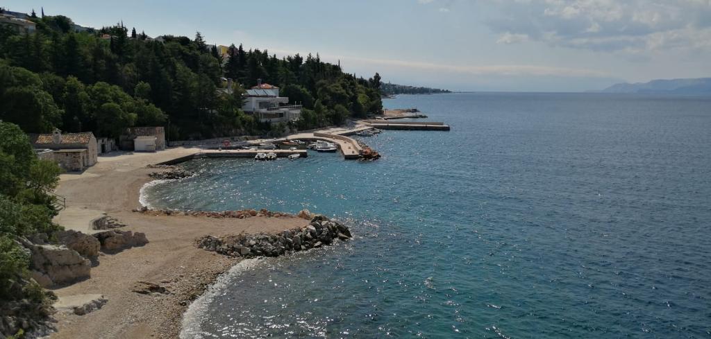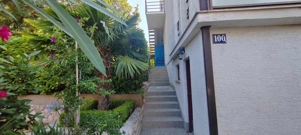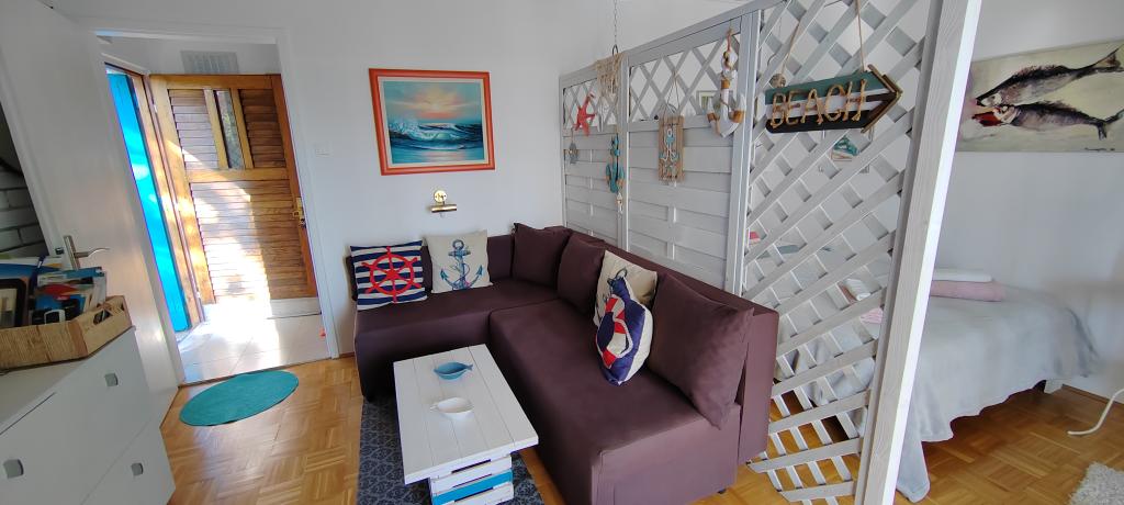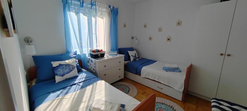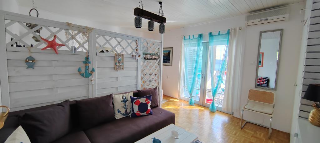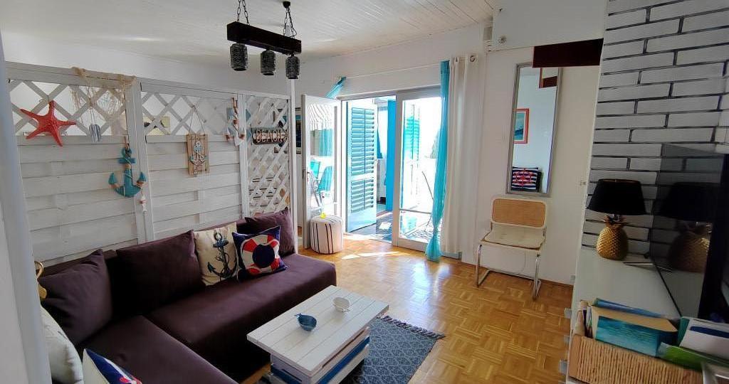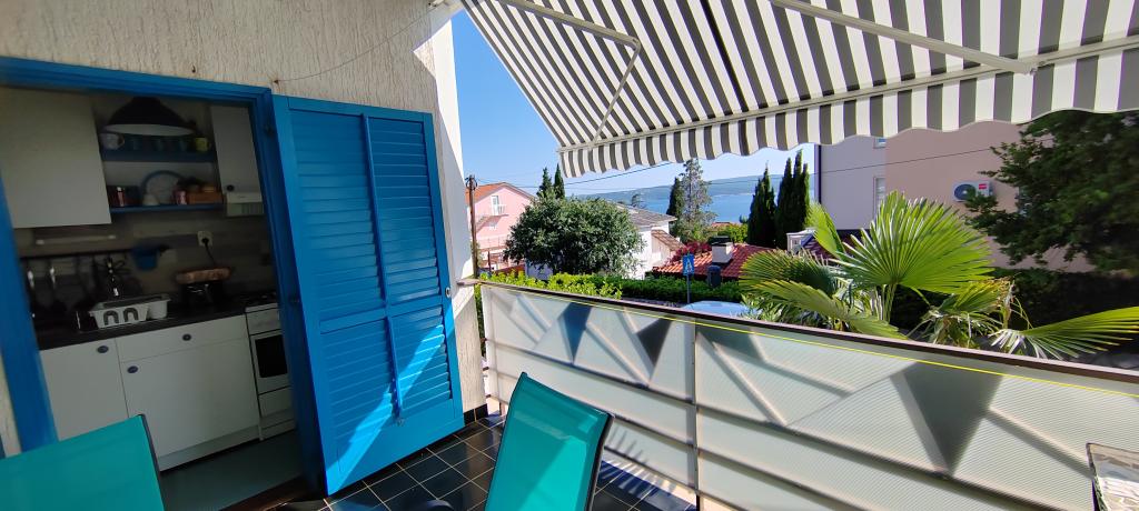 Apartman se nalazi u mirnom mjestu Dramlju udaljenom 2 km od grada Crikvenice. Udaljenost do plaže je 250 m i to imate izbor: šljunčana plaža , betonirana, te stijenovita. Trgovina je na 100 m od smještaja, i tu je stanica za turistički vlakić koji vozi do Crikvenice, Selaca i Kačjaka. Uz obalnu šetnicu možete i prošetati do Crikvenice, šetnja traje 20- ak minuta. Apartman se nalazi na prvom katu i sastoji se od dnevnog boravka , odvojenog spavaćeg djela s bračnim krevetom s izlazom na prekrasnu terasu s pogledom na more u sklopu koje se nalazi kuhinja te još jedne sobe s odvojenim krevetima i kupaonice.Parking za goste je osiguran.