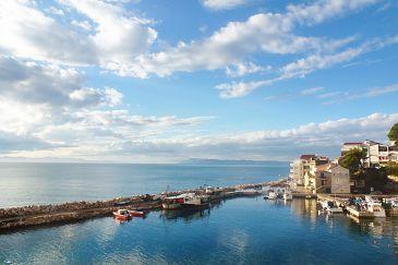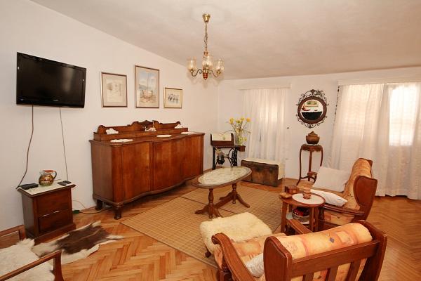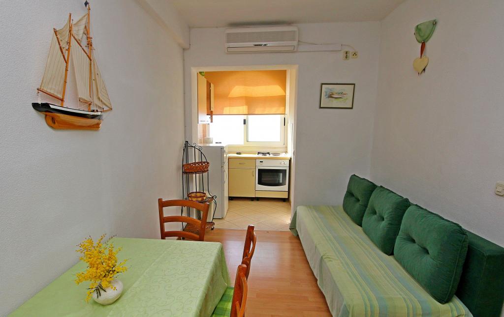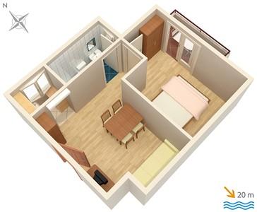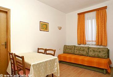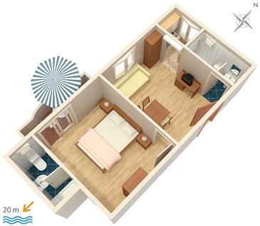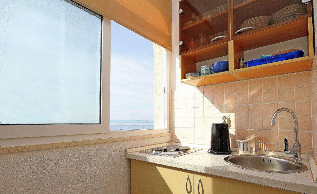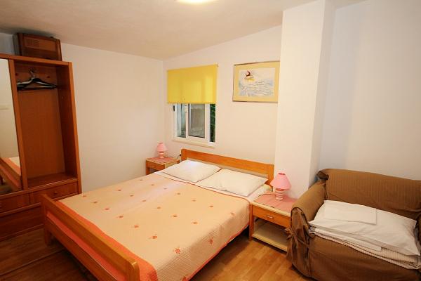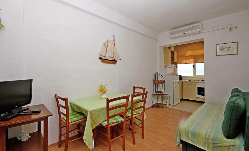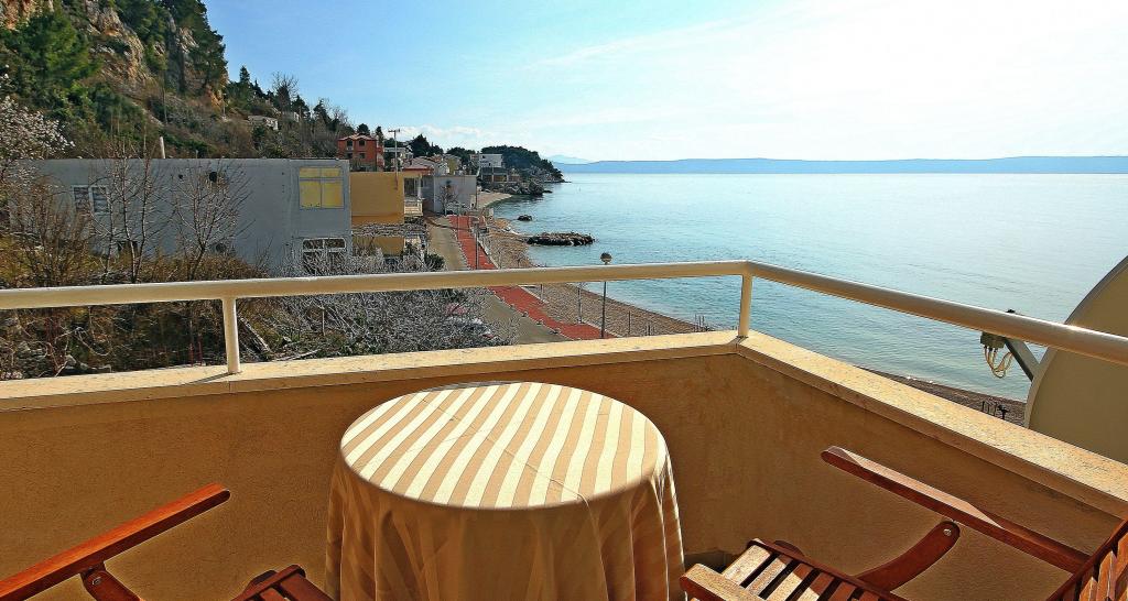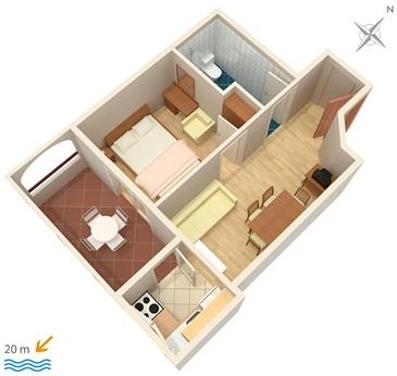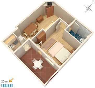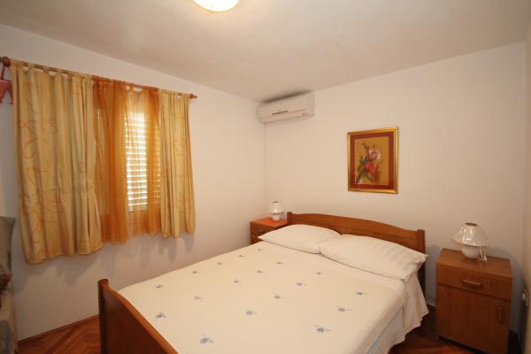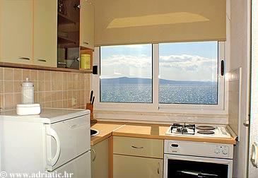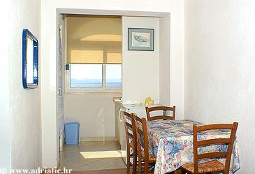 Apartmani na plaži, s pogledom na more, parking ispred objekta na rivi, moguć privez manjeg broda u lučici, iza objekta nalazi se vrt sa grilom. Veliki apartman A8 nalazi se u objektu pored na trećoj etaži se sastoji od 3 spavaće sobe, 3 kupaonice, velike kuhinje sa perilicom posuđa, dnevne sobe i dva balkona sa južnim i zapadnim pogledom na more i planinu. Ispred objekta je parking za dva automobila.